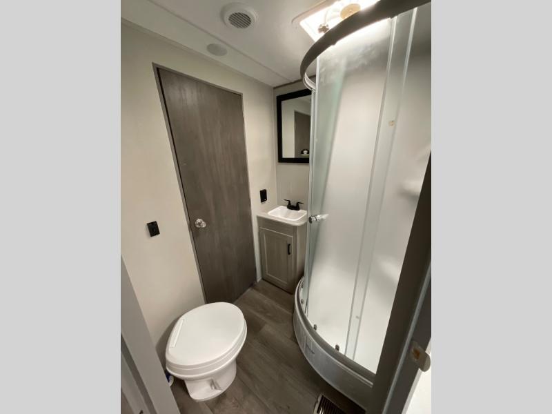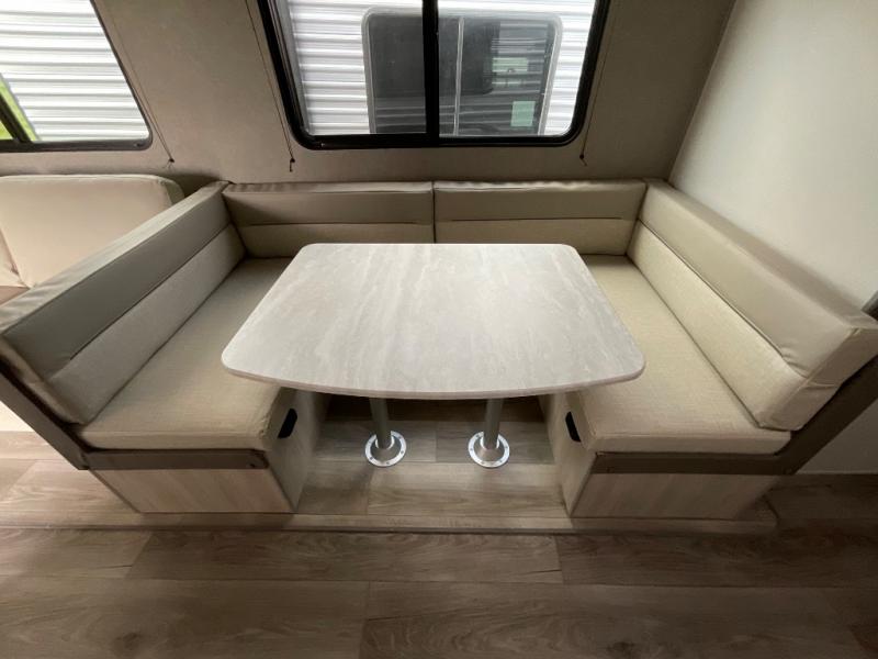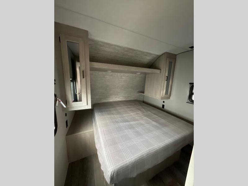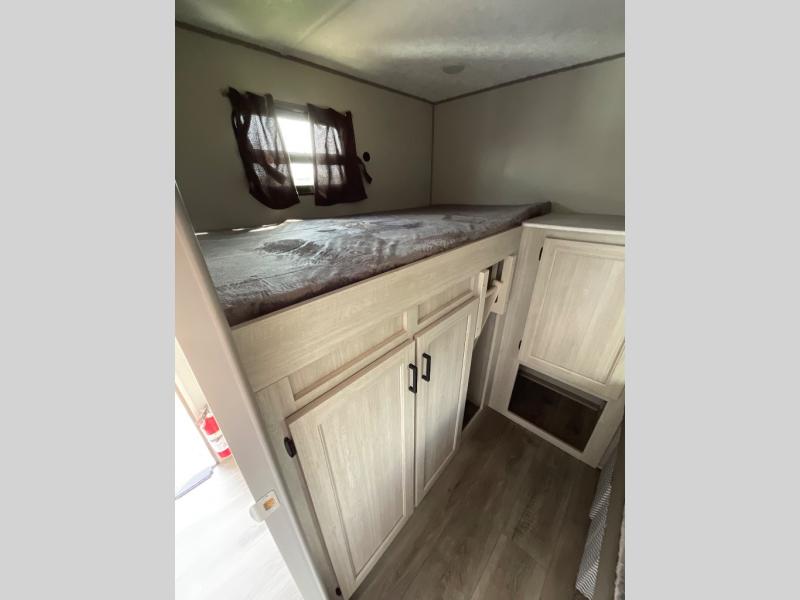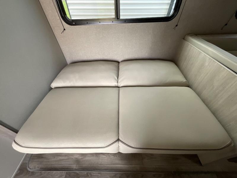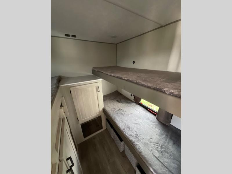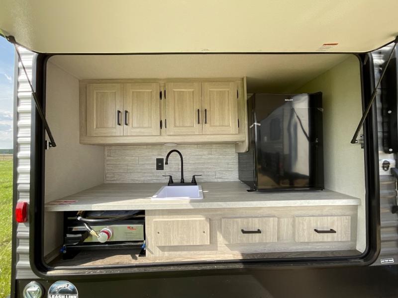 If you enjoy camping with family or a larger friend group, this trailer is sure to meet your needs! The rear private bunkhouse includes single-size bunks plus double-size bunks, allowing you to sleep up to six here alone! You'll have the 60" x 74" RV queen bed all to yourselves in the front master bedroom, and any additional guests can sleep on the U-shaped dinette and sofa within the large slide out. The chef of your group can use the GE stainless three burner cooktop or microwave oven to create meals each day, and an optional full-size exterior camp kitchen can be added if you enjoy cooking outdoors. The optional exterior kitchen replaces the lower bunk. A walk-in pantry includes washer and dryer prep if you choose to add these appliances, and everyone can stay clean all week thanks to the dual entry full bath!