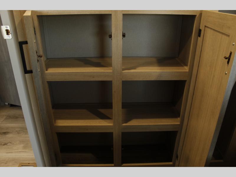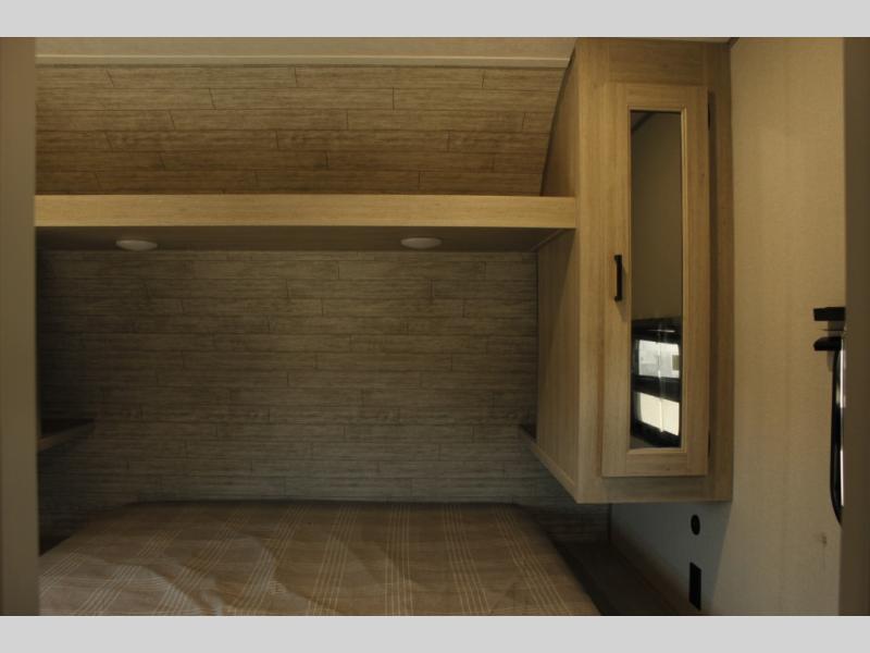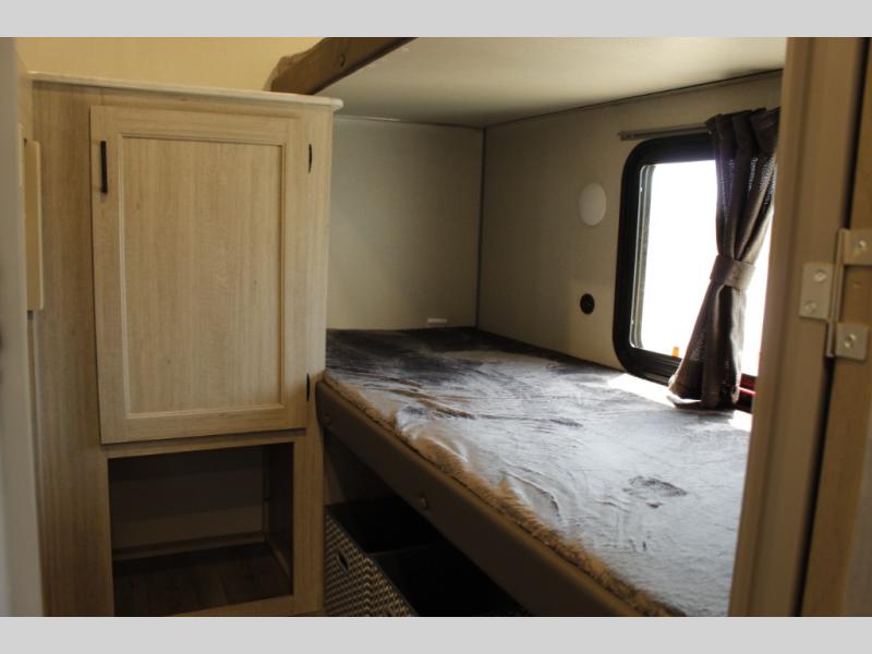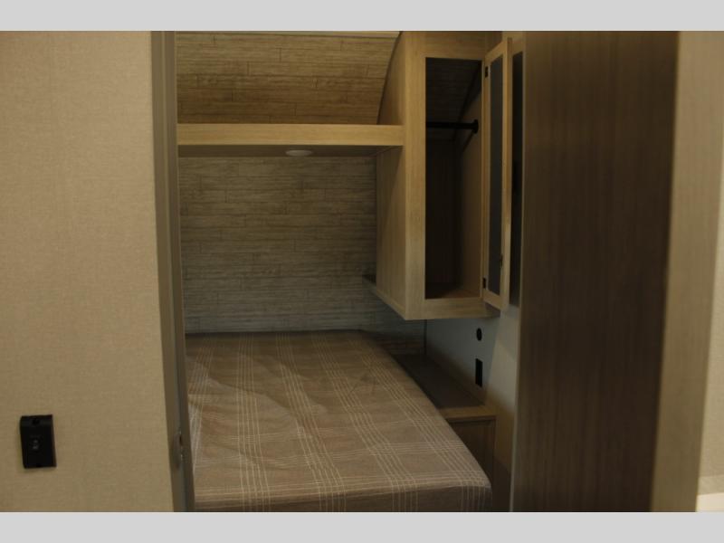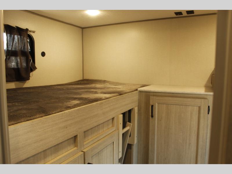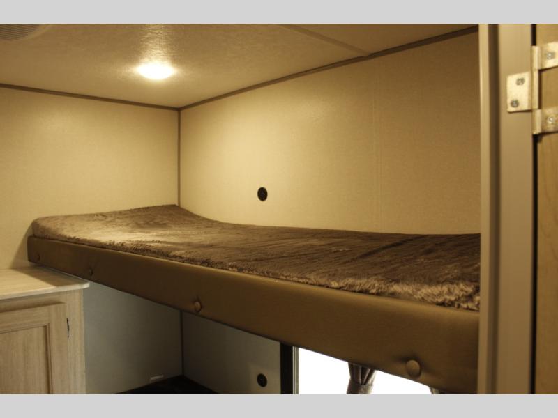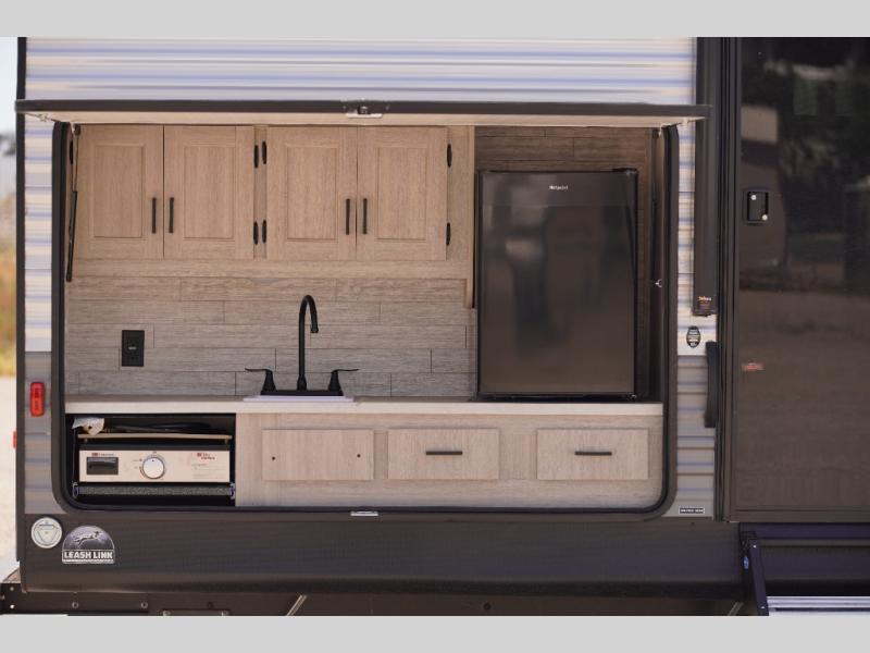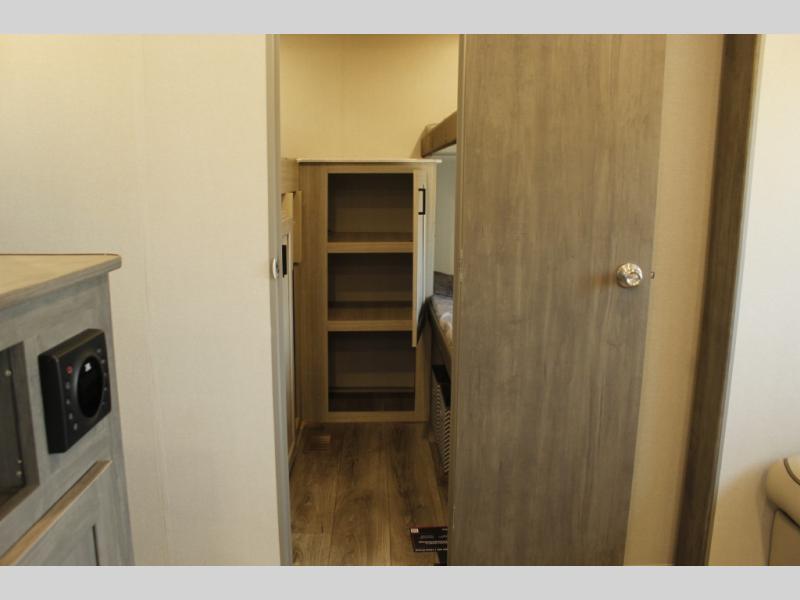 If you enjoy camping with family or a larger friend group, this trailer is sure to meet your needs! The rear private bunkhouse includes single-size bunks plus double-size bunks, allowing you to sleep up to six here alone! You'll have the 60" x 74" RV queen bed all to yourselves in the front master bedroom, and any additional guests can sleep on the U-shaped dinette and sofa within the large slide out. The chef of your group can use the GE stainless three burner cooktop or microwave oven to create meals each day, and an optional full-size exterior camp kitchen can be added if you enjoy cooking outdoors. The optional exterior kitchen replaces the lower bunk. A walk-in pantry includes washer and dryer prep if you choose to add these appliances, and everyone can stay clean all week thanks to the dual entry full bath!