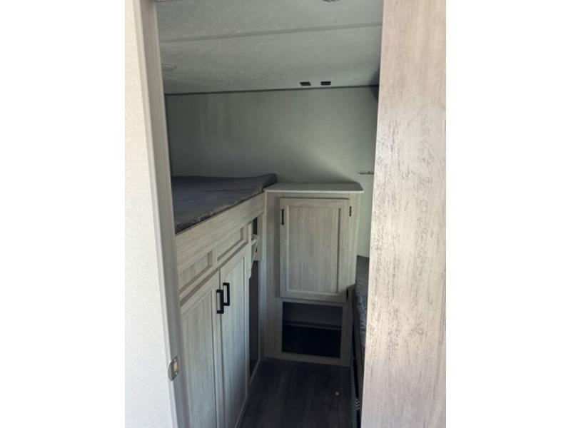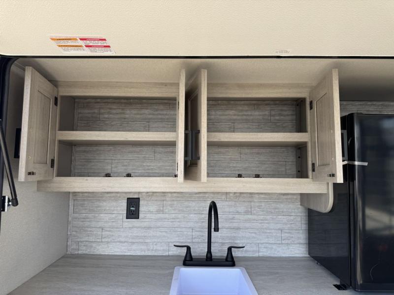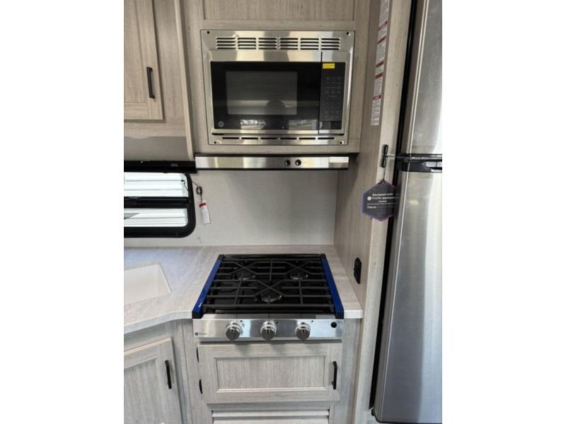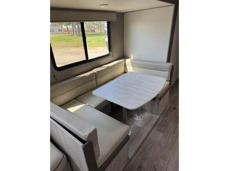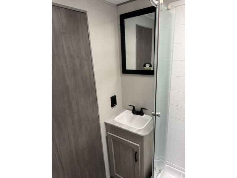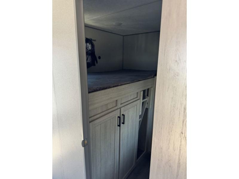 If you enjoy camping with family or a larger friend group, this trailer is sure to meet your needs! The rear private bunkhouse includes single-size bunks plus double-size bunks, allowing you to sleep up to six here alone! You'll have the 60" x 74" RV queen bed all to yourselves in the front master bedroom, and any additional guests can sleep on the U-shaped dinette and sofa within the large slide out. The chef of your group can use the GE stainless three burner cooktop or microwave oven to create meals each day, and an optional full-size exterior camp kitchen can be added if you enjoy cooking outdoors. The optional exterior kitchen replaces the lower bunk. A walk-in pantry includes washer and dryer prep if you choose to add these appliances, and everyone can stay clean all week thanks to the dual entry full bath!