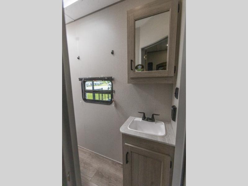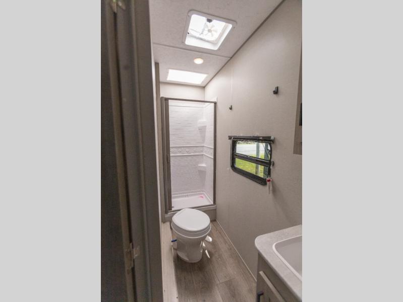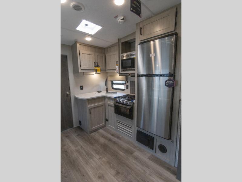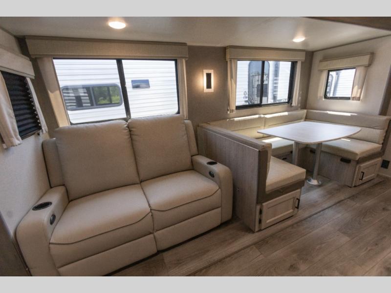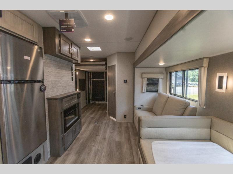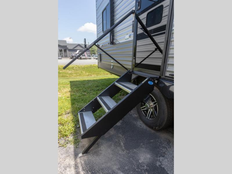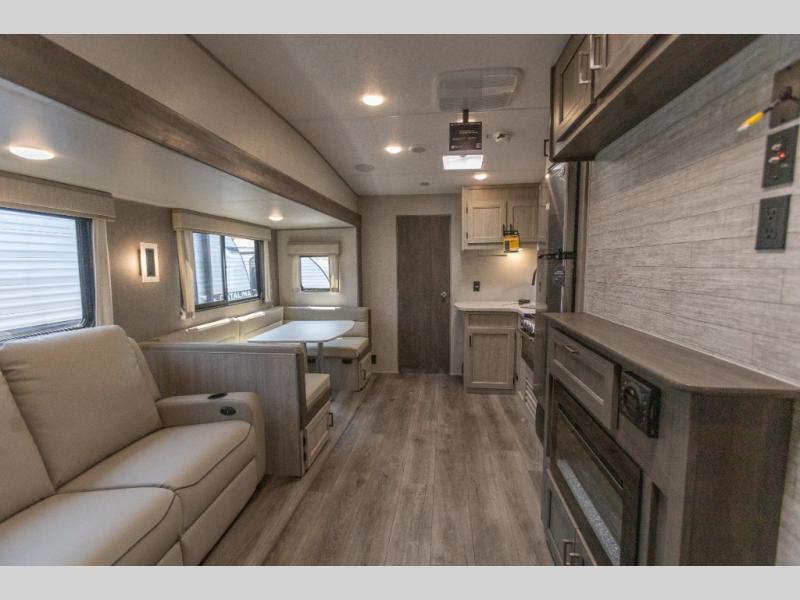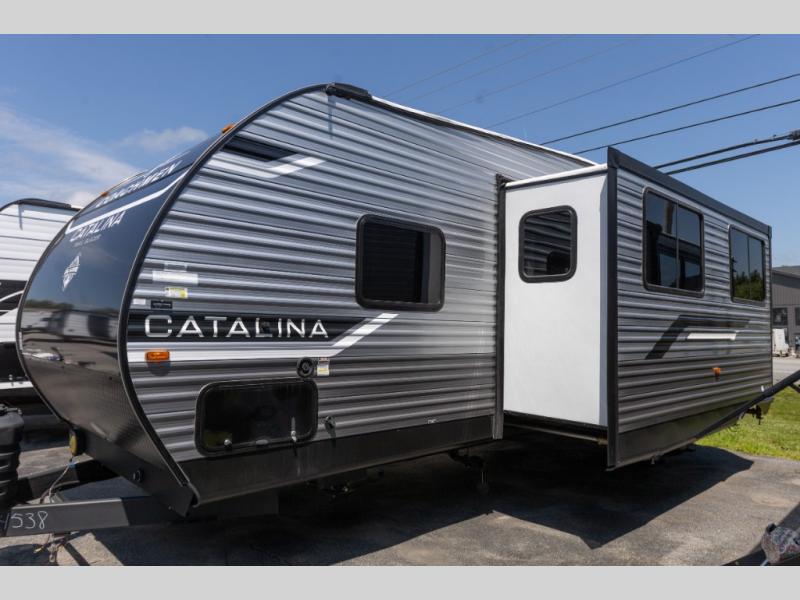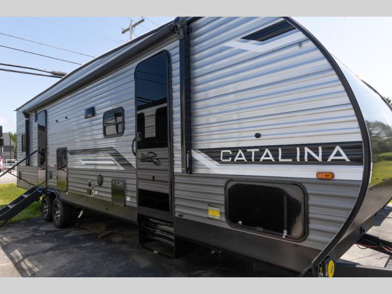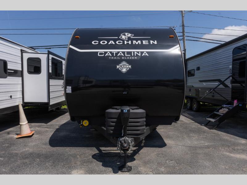 The best looking, most affordable toy hauler is found in the Catalina Trailer Blazer by Coachmen. Each one is constructed with a seamless alpha roof membrane, an enclosed and fully sealed underbelly, and a cambered structural steel I-beam frame for added support. There is a rear loading cargo door with a 3,000 lb. capacity, a black out screen wall with a zip walk-thru and windows, plus 500 lb. tie-downs to secure your toys. You'll love the interior with its Congoleum woodplank linoleum flooring and LED interior lighting. Head outside to find an electric awning with multicolored LED lights and a remote, a 15' Toy Loc cable, a "Leash Link" quick hookup D-ring for pets, and upgraded aluminum wheels. The Catalina Trail Blazer also comes with RV-LINK 4G LTE connectivity with a WiFi booster and extender, a JBL Aura Cube media center, plus premium JBL interior speakers for your pleasure!