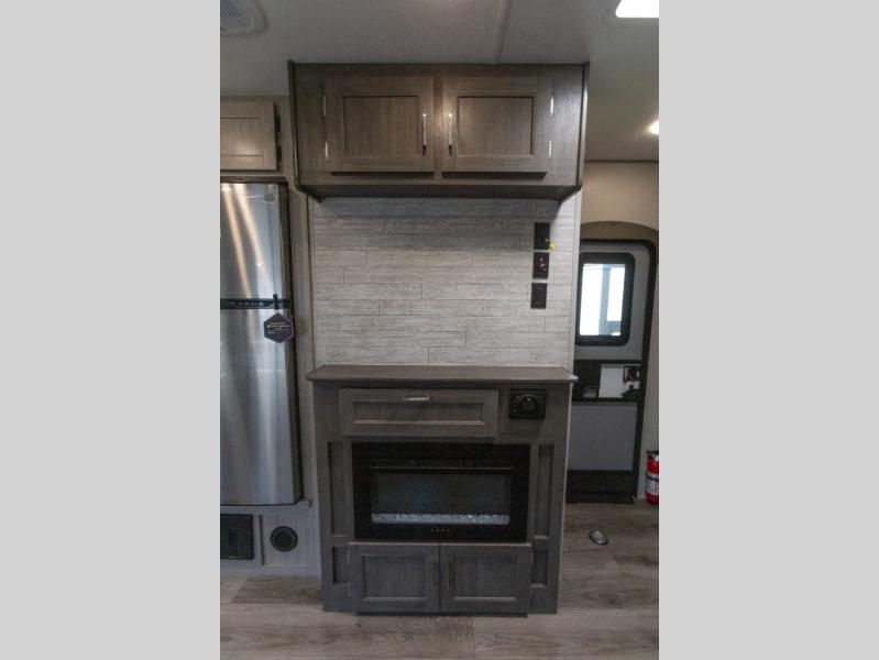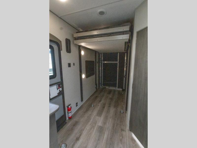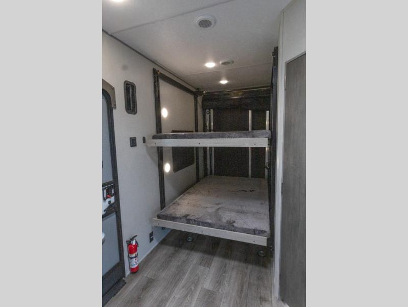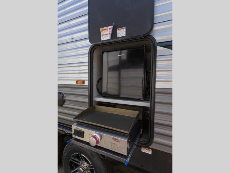 This toy hauler has lots of room for toys and guests! You will love the retreat of the front private bedroom with a queen bed, dual wardrobes and its own entry door. Additional guests can sleep in the double-size bunks with an electric trac bed lift in the cargo area, also with its own entry door. A rear corner bath makes efficient use of space and includes a 24" x 32" shower and a medicine cabinet. The main living area features an entertainment center that can be upgraded with an optional fireplace for maximum coziness. Relax on the sofa or the U-shaped dinette. You'll also appreciate the kitchen with its L-shaped counter, corner sink, microwave, GE stainless 10.7 cu. ft. 12V refrigerator, and three-burner range. Or step outside and use the camper kitchen with a griddle and mini refrigerator!