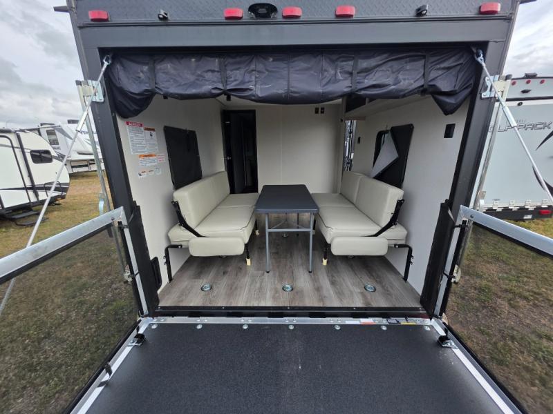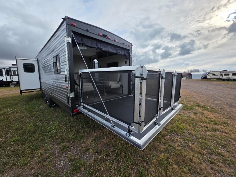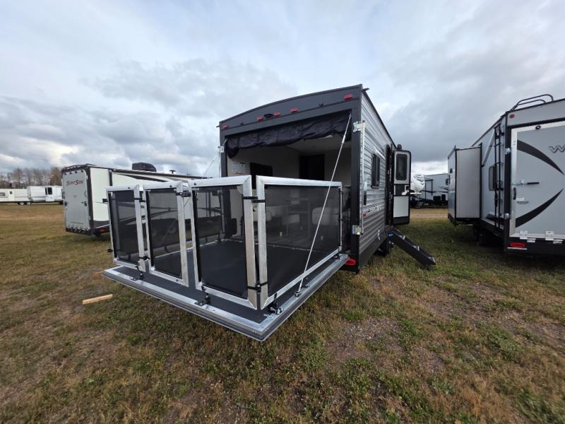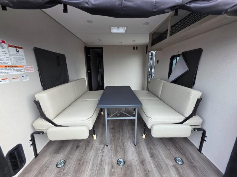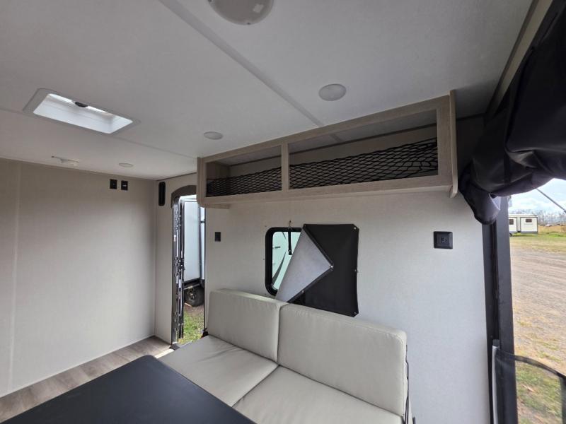 You're going to love camping in this dual entry toy hauler! The 11' garage can be shut off from the rest of the unit if your guests want a little privacy, and you can choose the optional party deck to the ramp door for more living space. The full bath includes a tub/shower, a medicine cabinet, plus a shower skylight to let natural light in. Head to the main living area to dine around the U-shaped dinette slide, or call it a night in the front bedroom with a queen bed. And you'll find plenty of storage space for your belongings, including overhead cabinets, dual bedroom wardrobes, plus exterior storage!