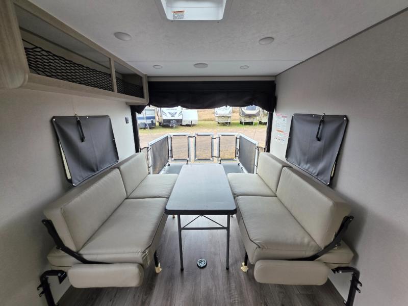 The best looking, most affordable toy hauler is found in the Catalina Trailer Blazer by Coachmen. Each one is constructed with a seamless alpha roof membrane, an enclosed and fully sealed underbelly, and a cambered structural steel I-beam frame for added support. There is a rear loading cargo door with a 3,000 lb. capacity, a black out screen wall with a zip walk-thru and windows, plus 500 lb. tie-downs to secure your toys. You'll love the interior with its Congoleum woodplank linoleum flooring and LED interior lighting. Head outside to find an electric awning with multicolored LED lights and a remote, a 15' Toy Loc cable, a "Leash Link" quick hookup D-ring for pets, and upgraded aluminum wheels. The Catalina Trail Blazer also comes with RV-LINK 4G LTE connectivity with a WiFi booster and extender, a JBL Aura Cube media center, plus premium JBL interior speakers for your pleasure!