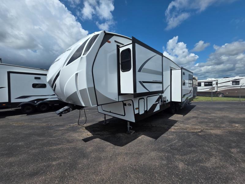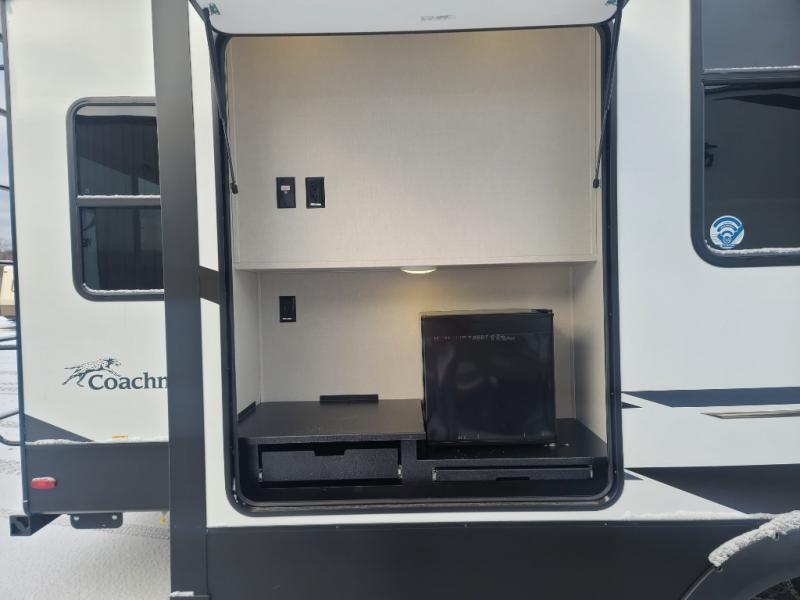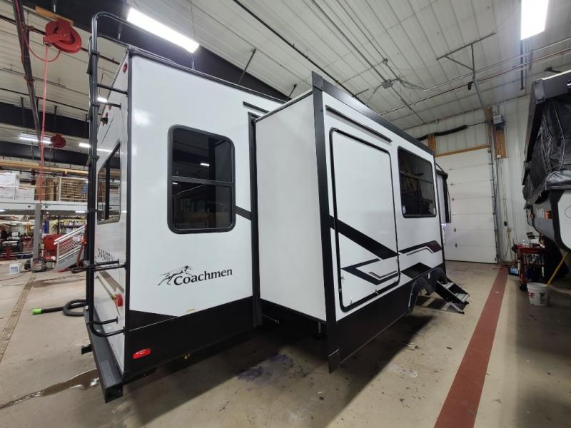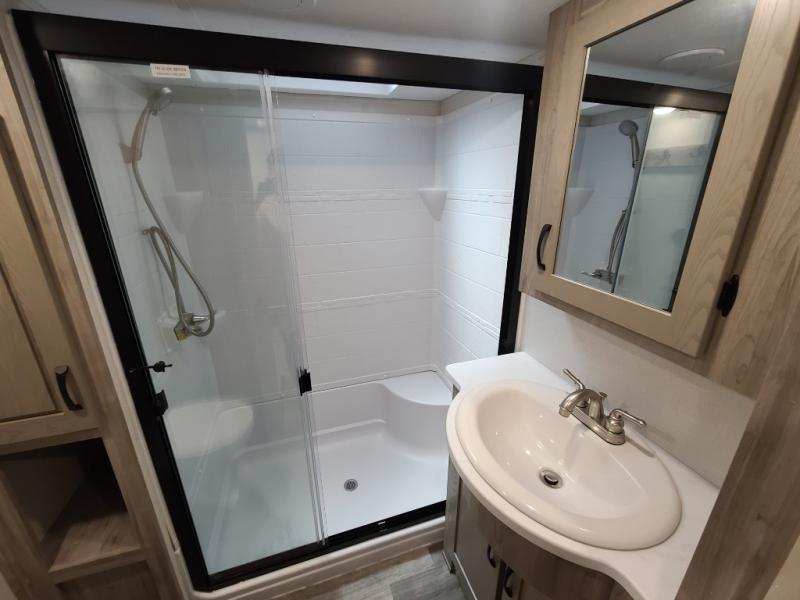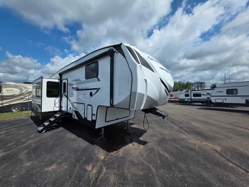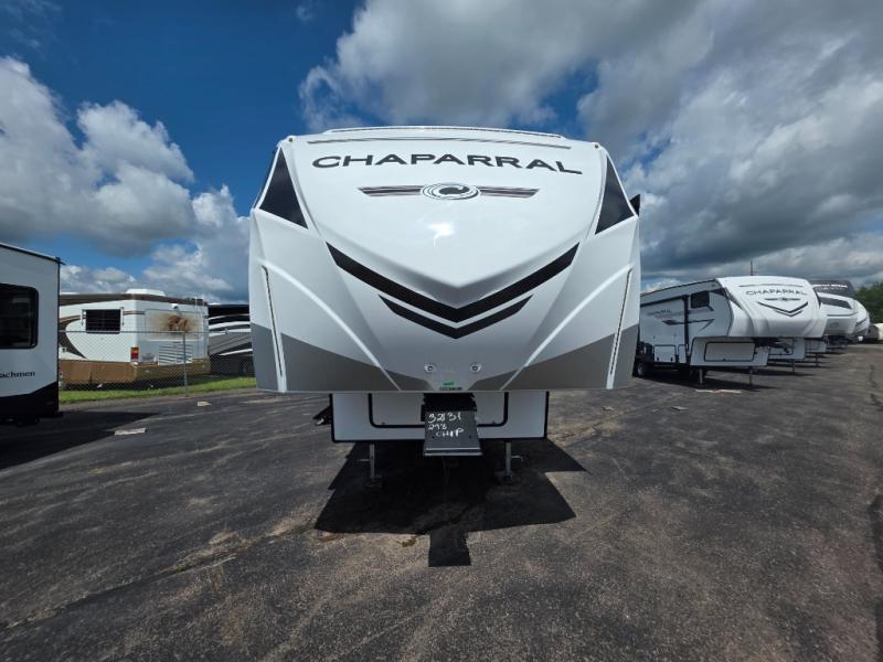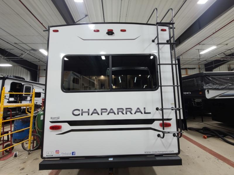Each Chaparral mid-profile fifth wheel by Coachmen is designed with residential features, loads of storage space, and roomy bedroom suites to make you feel right at home. The durable construction means you can enjoy your RV for years to come. There's 6X double Azdel aluminum cage sidewall system, Weather Shield+ technology, and Tri-Tex powder coated frame technology that will allow you to camp year around. Each model includes a Winegard Air 360+ HDTV/radio dome antenna to help keep you connected as you camp, slow rise blackout roller night shades, a new 16 cu. ft. side-by-side stainless glass 12V refrigerator, and a modern electric fireplace to make your space cozy. There is also a large transom window in the kitchen, a modern high-rise faucet, LED motion sensor lights in the bathroom, plus a full-size shower with glass doors and a seat. Now that's what I call luxury! Choose a Chaparral fifth wheel today!