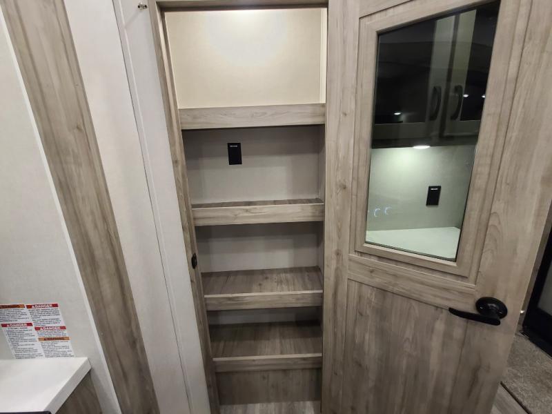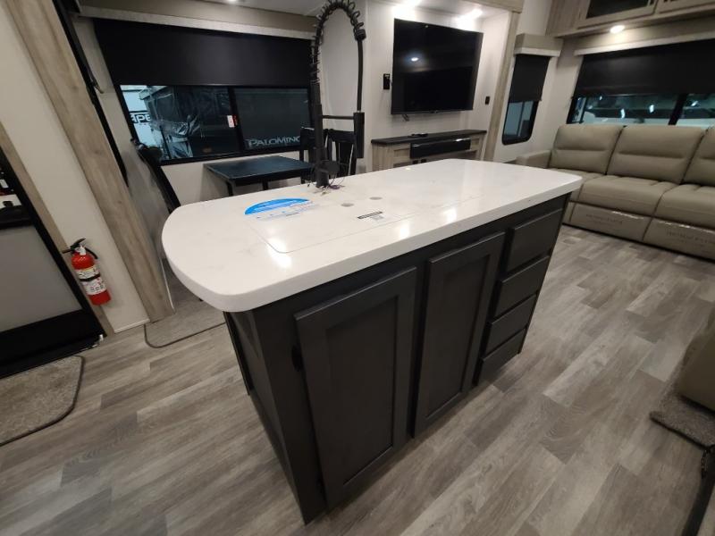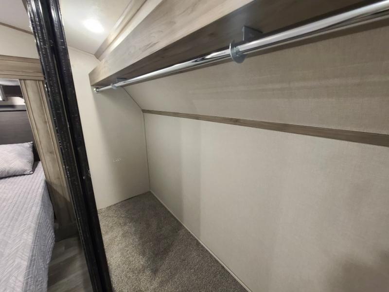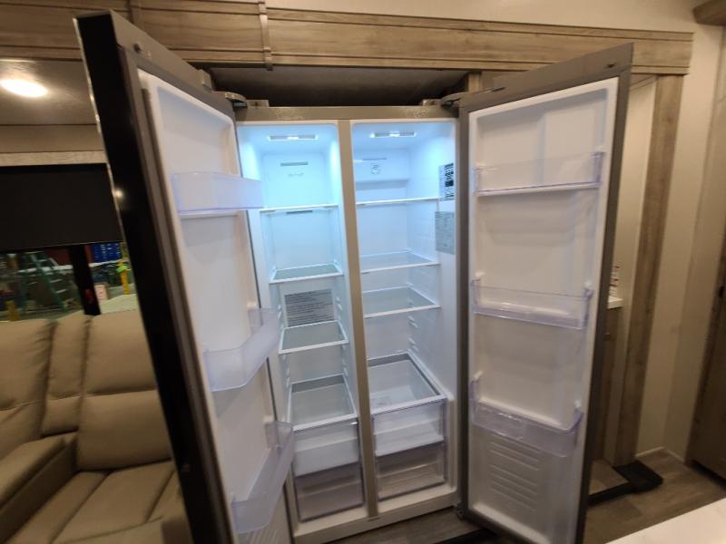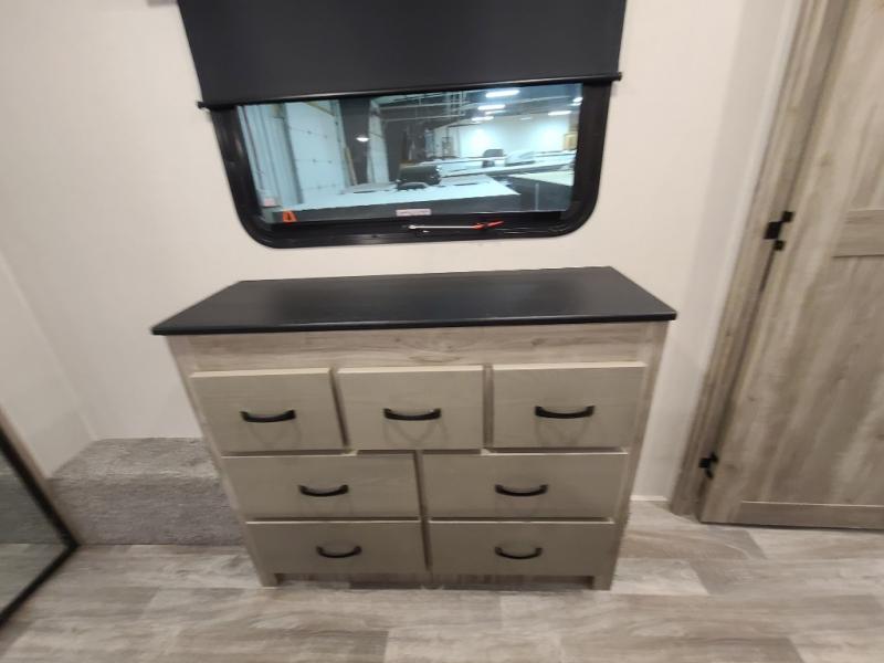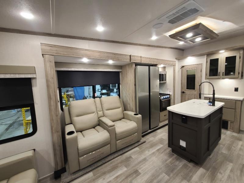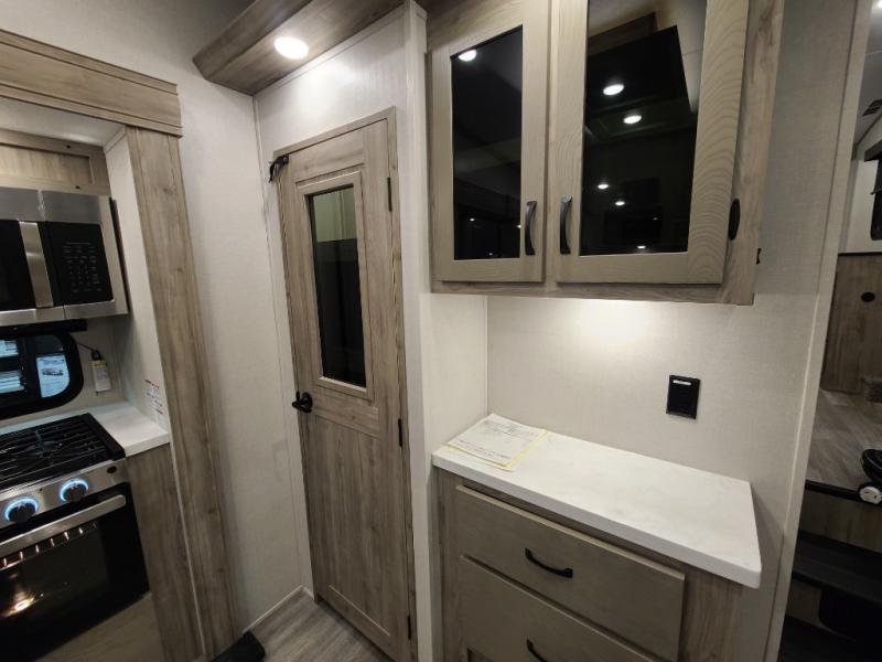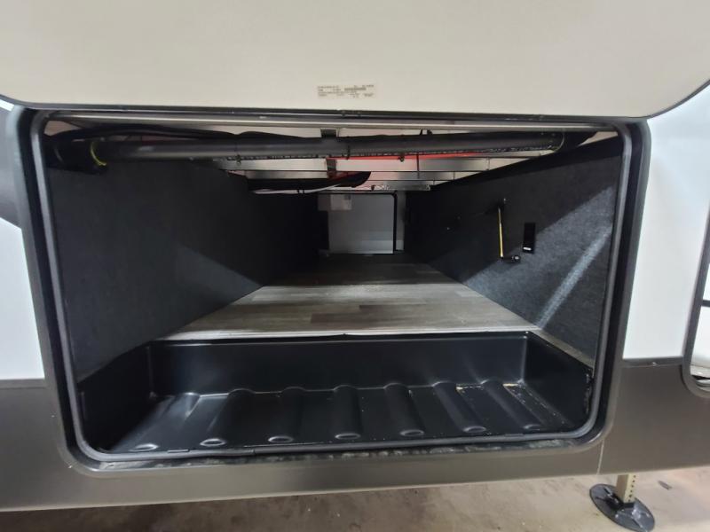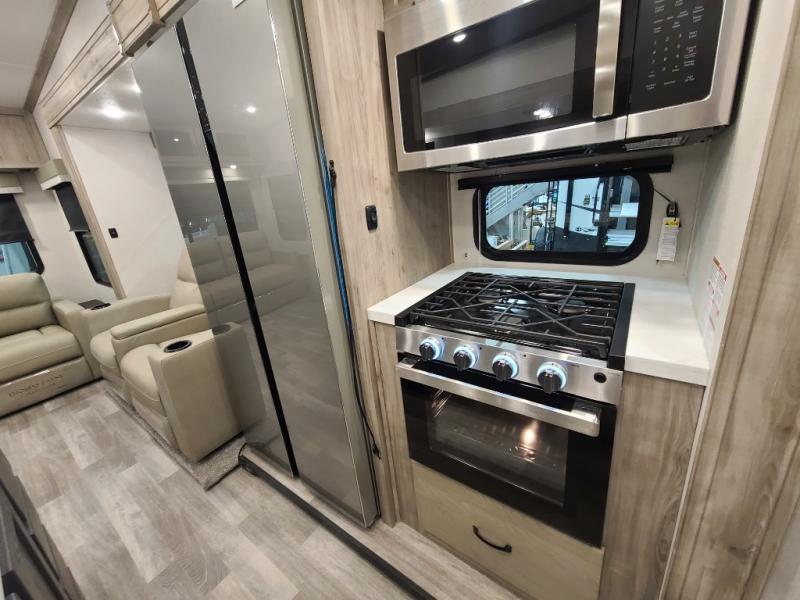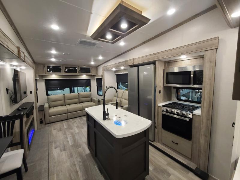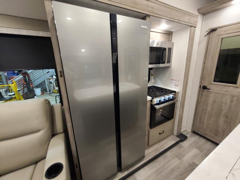 This lightest fifth wheel in the Chaparral line-up will provide hassle-free towing and camping. You will find dual opposing slides in the main living area for tons of space to stretch out, plus a kitchen island that will make this area feel more like home. There is theatre seating across from the entertainment center, and you can enjoy the 50" 4K Smart LED TV for movies. The fully-equipped kitchen includes a GE Profile stainless steel 30" residential microwave, a GE Profile 21" oven with a residential cooktop, and a overhead storage to keep kitchen necessities close by. And don't overlook the front private bedroom with a queen bed, dresser, plus a large wardrobe with washer and dryer prep!