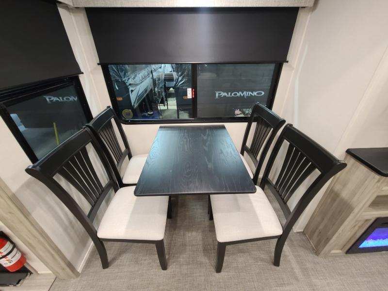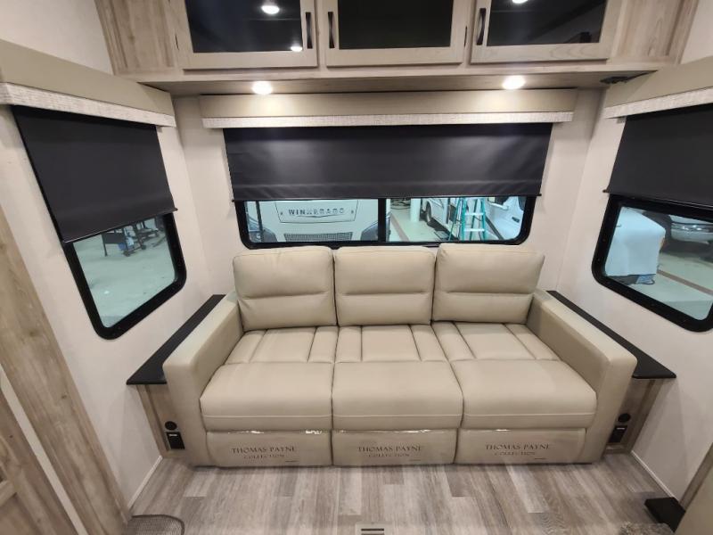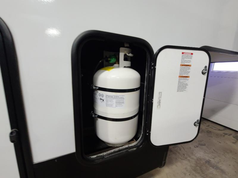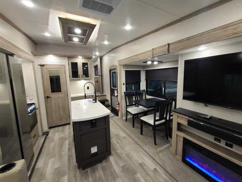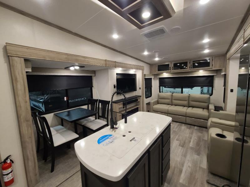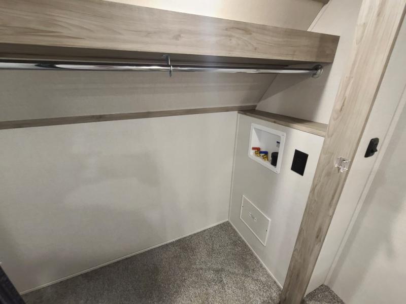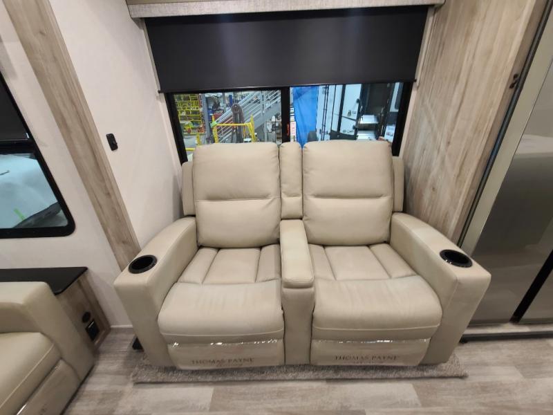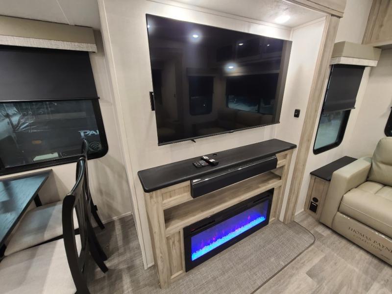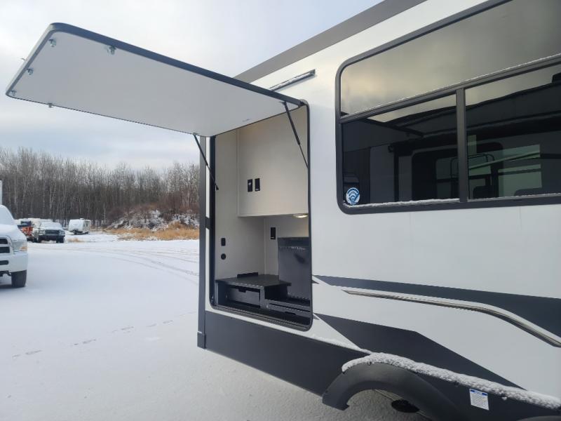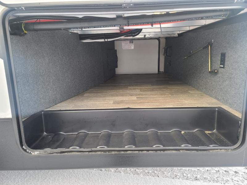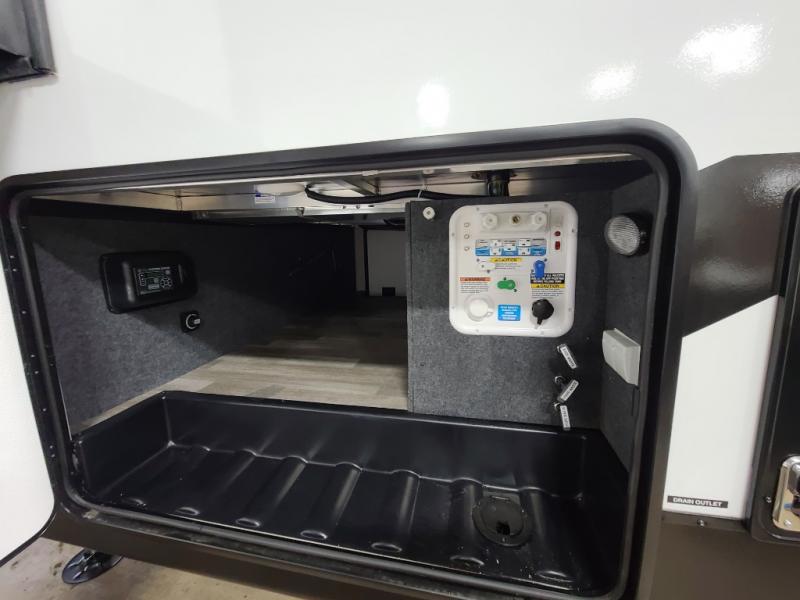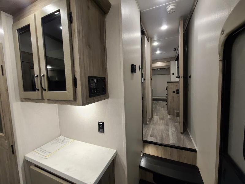 This lightest fifth wheel in the Chaparral line-up will provide hassle-free towing and camping. You will find dual opposing slides in the main living area for tons of space to stretch out, plus a kitchen island that will make this area feel more like home. There is theatre seating across from the entertainment center, and you can enjoy the 50" 4K Smart LED TV for movies. The fully-equipped kitchen includes a GE Profile stainless steel 30" residential microwave, a GE Profile 21" oven with a residential cooktop, and a overhead storage to keep kitchen necessities close by. And don't overlook the front private bedroom with a queen bed, dresser, plus a large wardrobe with washer and dryer prep!