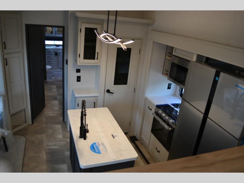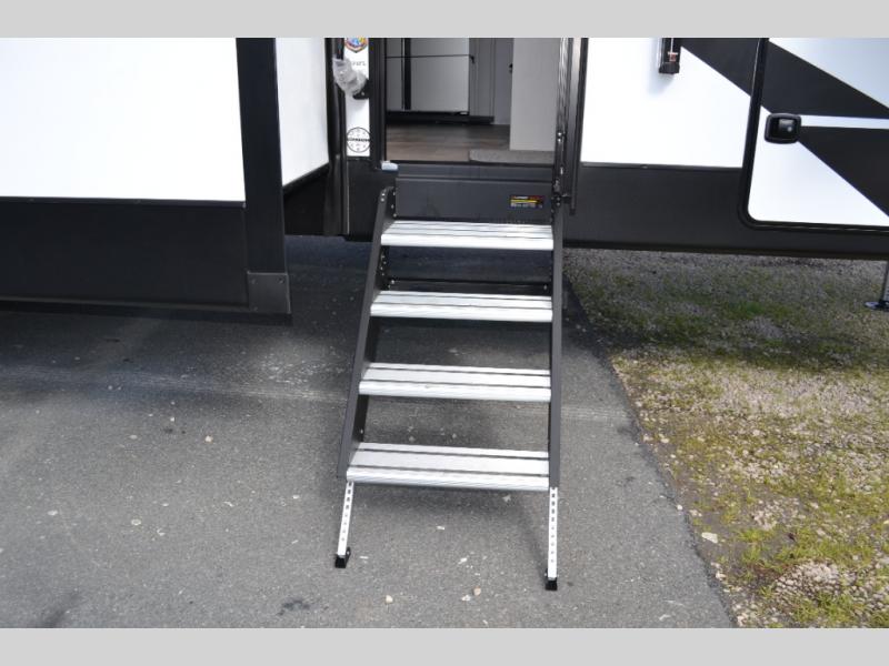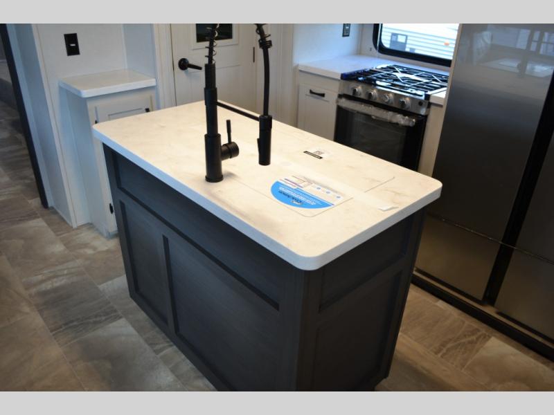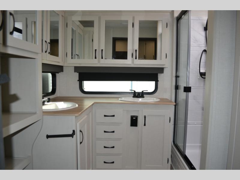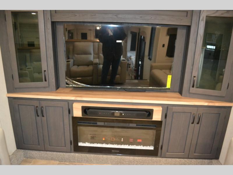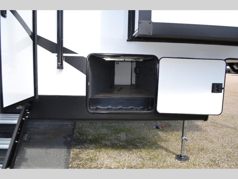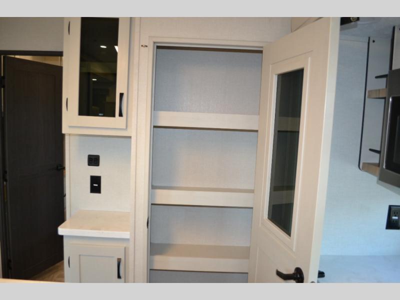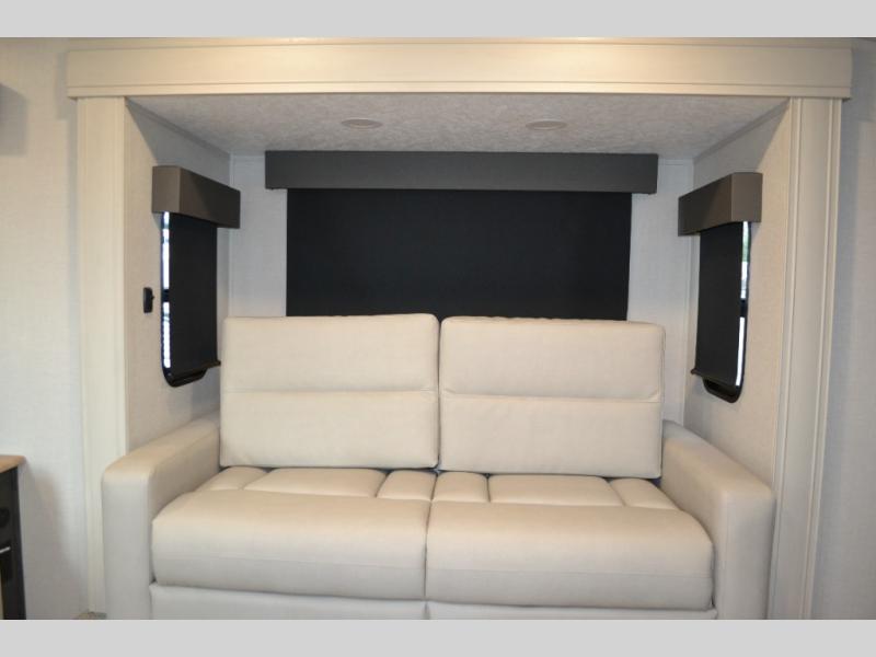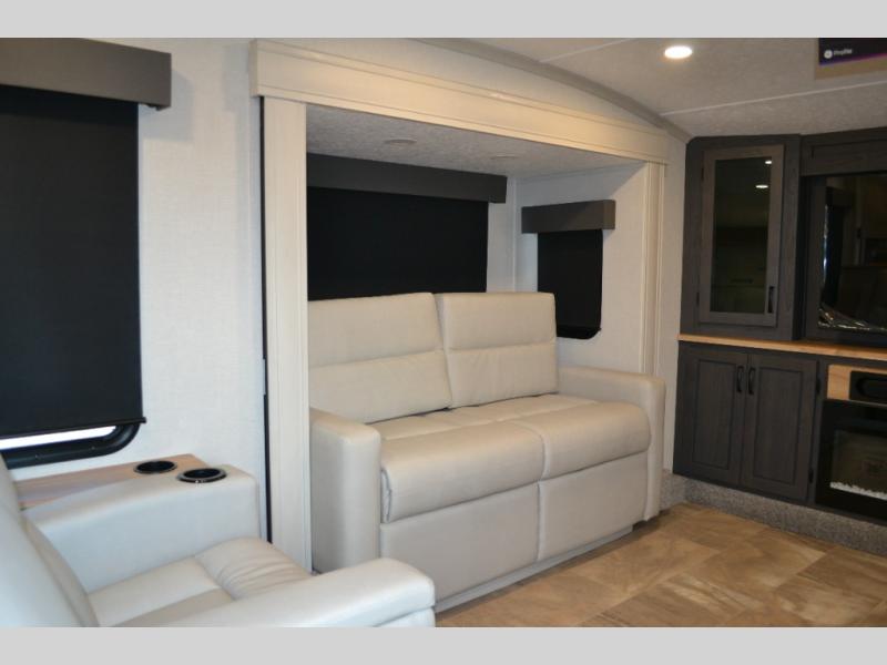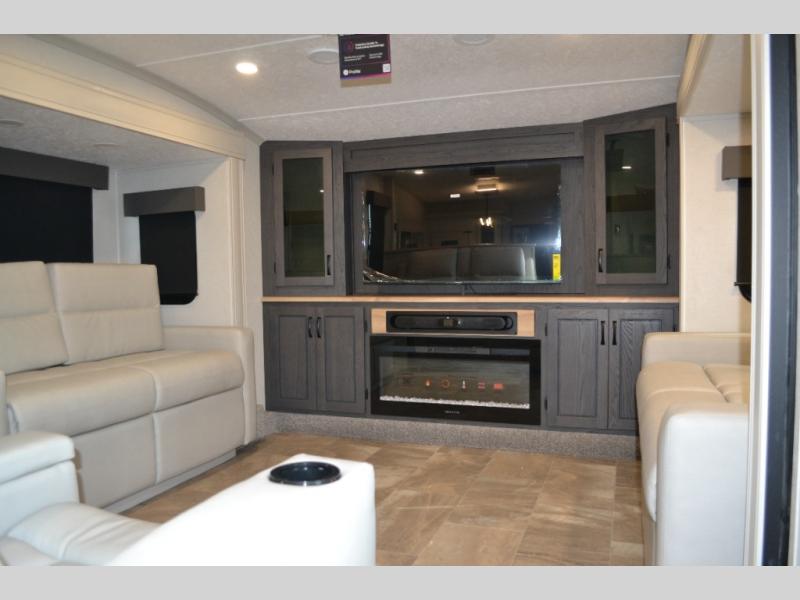 Camping or full-timing in this spacious fifth wheel will make the whole family happy. Your crew will love to visit in the front living area that included two tri-fold hide-a-bed sofas, theatre seating with a side table, plus an entertainment center for a 50" 4K Smart LED TV. The kitchen is any chef's dream with its kitchen island, large pantry, plus a hutch to store nice dishes, and stainless steel appliances. And the free-spanning table will allow you to dine just like you do at home. Head to the master suite to find a king bed slide out, two dressers, plus a full rear bath with dual bath sinks!
