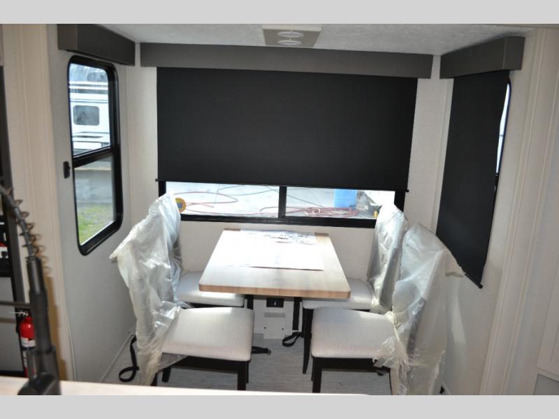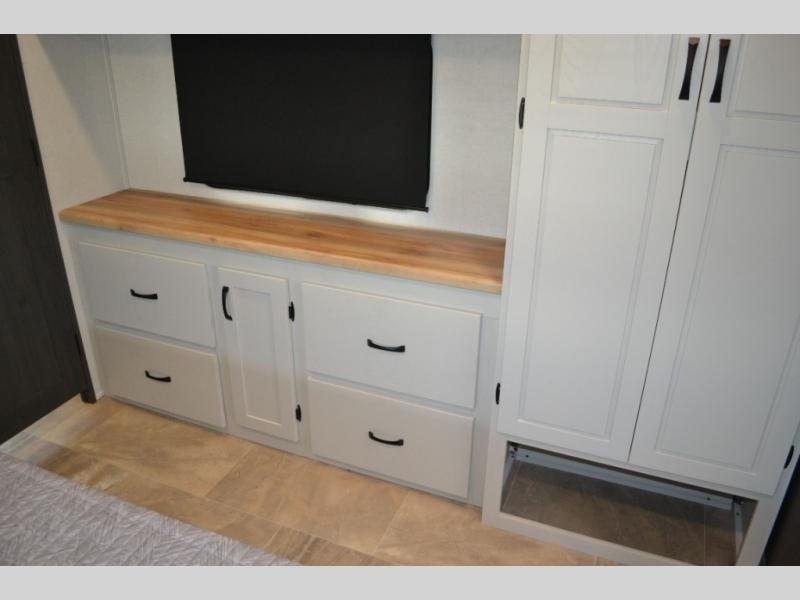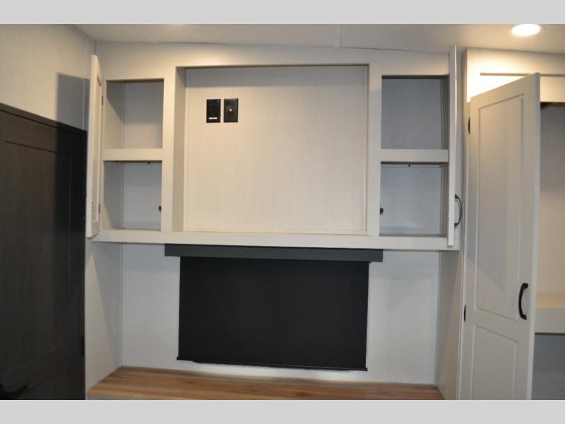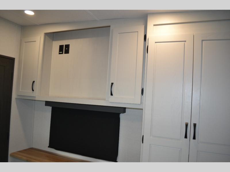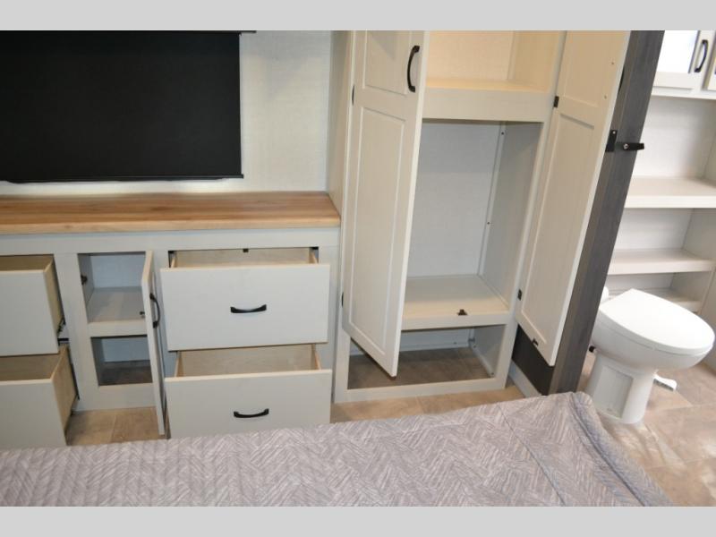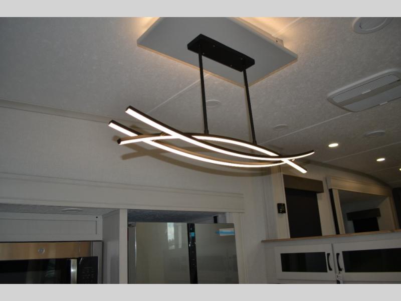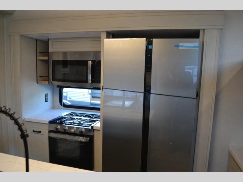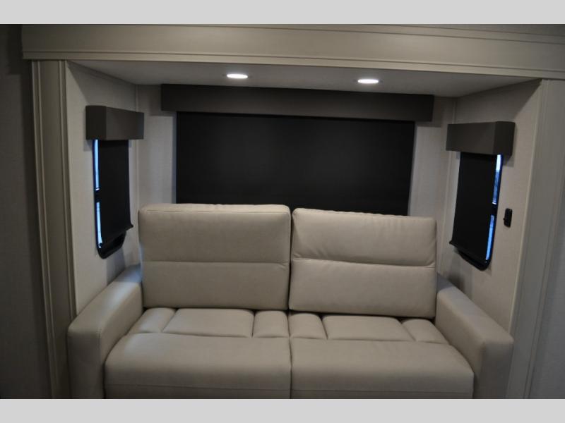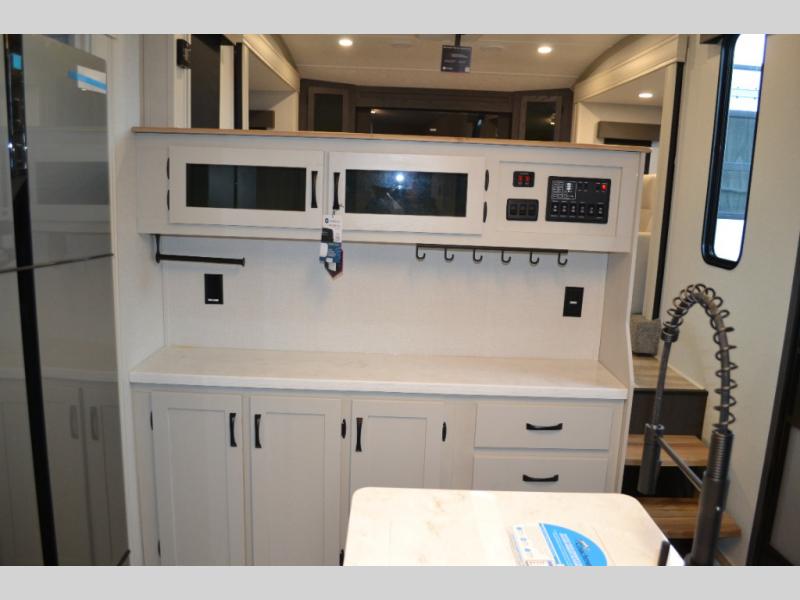 Camping or full-timing in this spacious fifth wheel will make the whole family happy. Your crew will love to visit in the front living area that included two tri-fold hide-a-bed sofas, theatre seating with a side table, plus an entertainment center for a 50" 4K Smart LED TV. The kitchen is any chef's dream with its kitchen island, large pantry, plus a hutch to store nice dishes, and stainless steel appliances. And the free-spanning table will allow you to dine just like you do at home. Head to the master suite to find a king bed slide out, two dressers, plus a full rear bath with dual bath sinks!