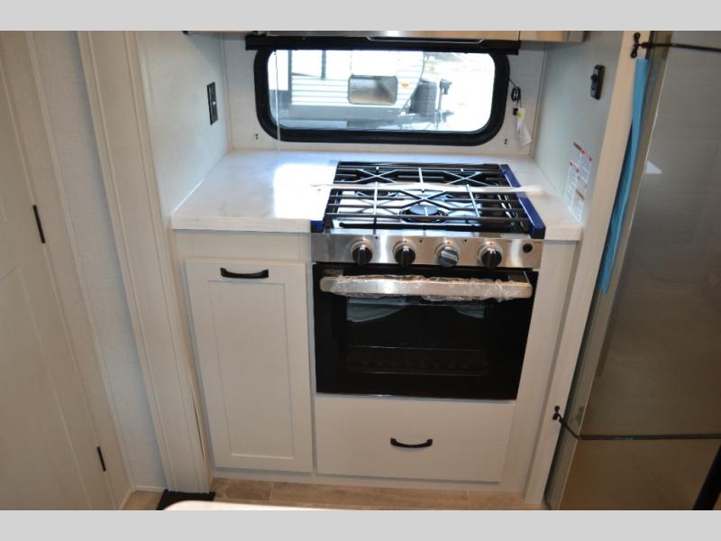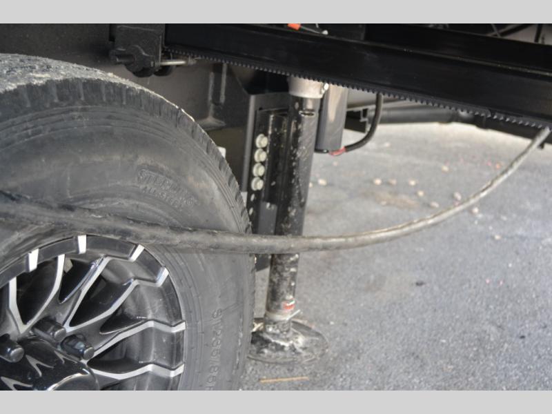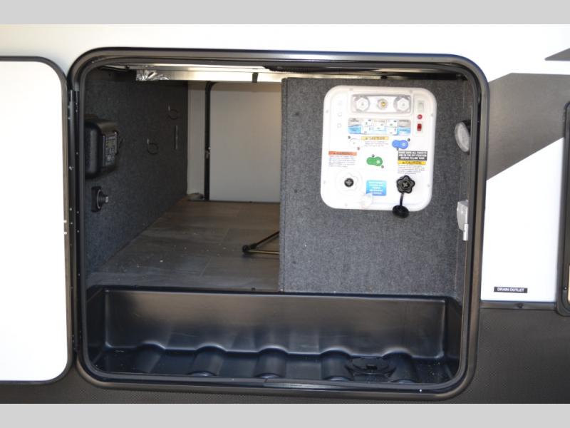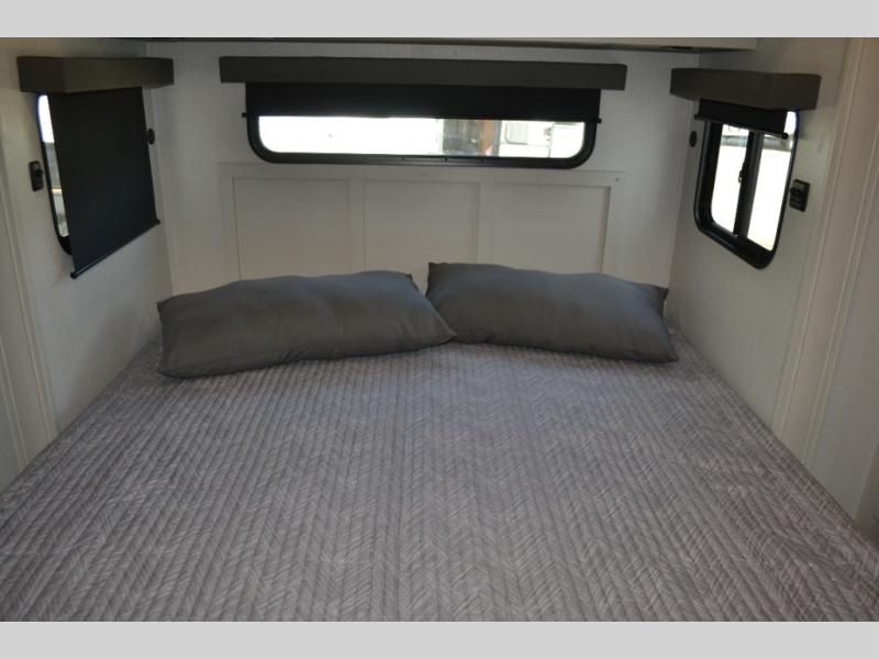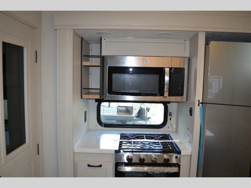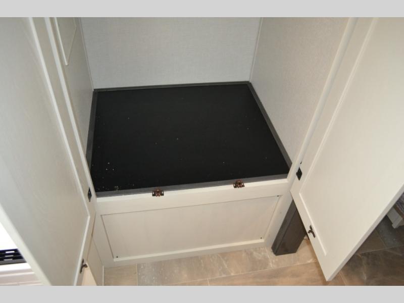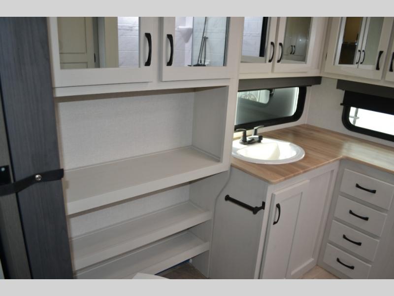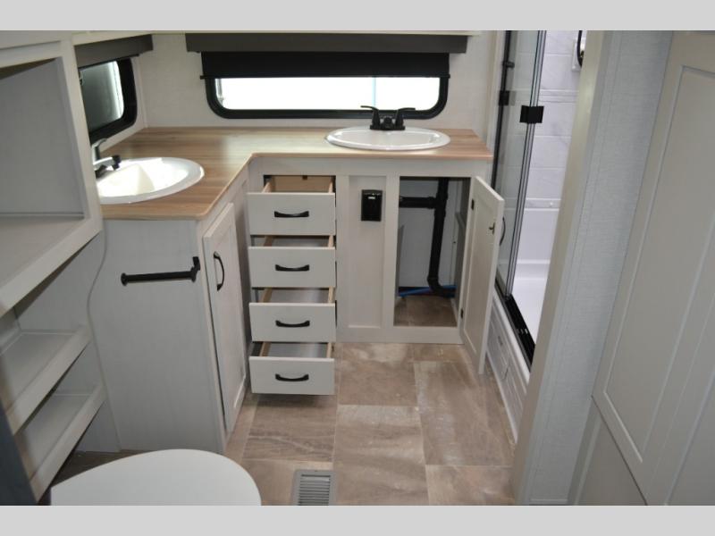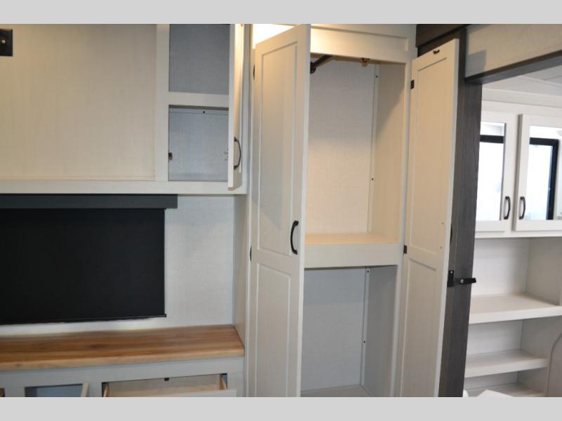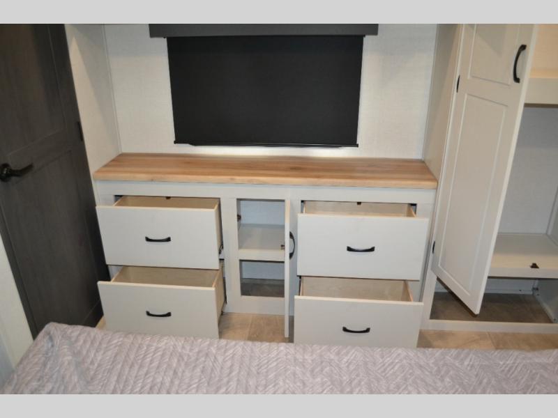 Camping or full-timing in this spacious fifth wheel will make the whole family happy. Your crew will love to visit in the front living area that included two tri-fold hide-a-bed sofas, theatre seating with a side table, plus an entertainment center for a 50" 4K Smart LED TV. The kitchen is any chef's dream with its kitchen island, large pantry, plus a hutch to store nice dishes, and stainless steel appliances. And the free-spanning table will allow you to dine just like you do at home. Head to the master suite to find a king bed slide out, two dressers, plus a full rear bath with dual bath sinks!