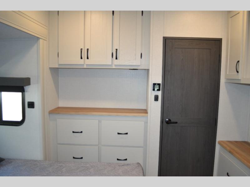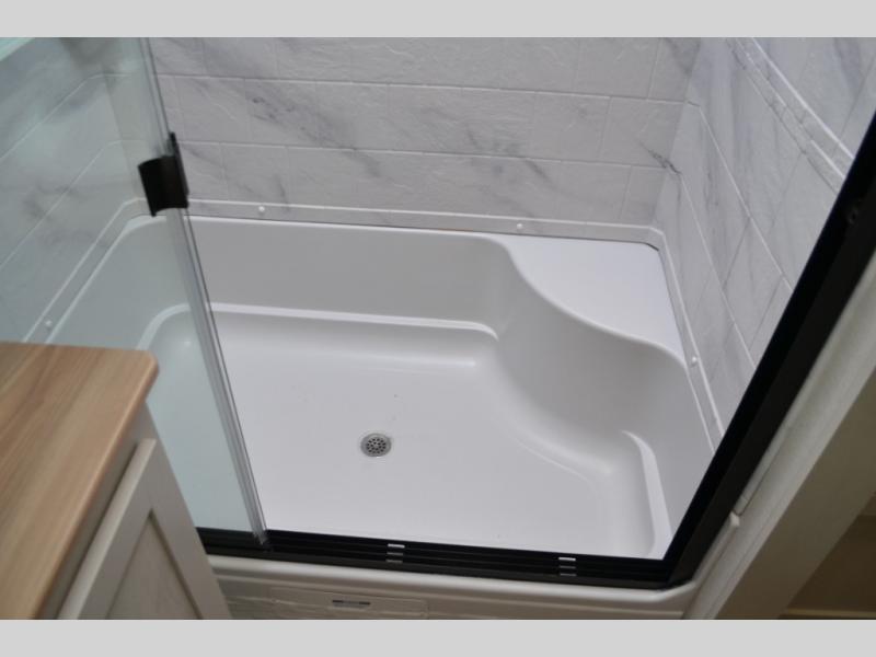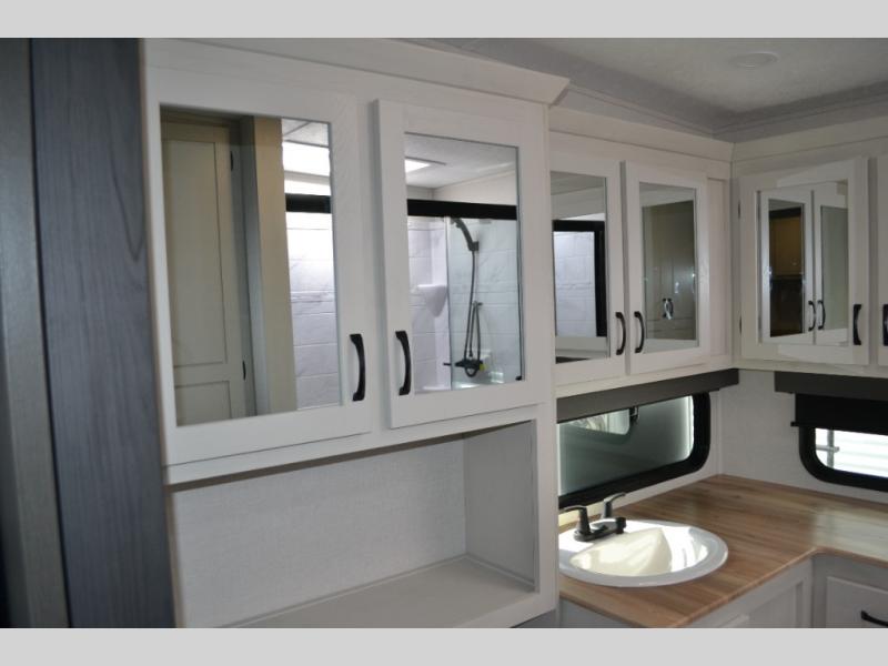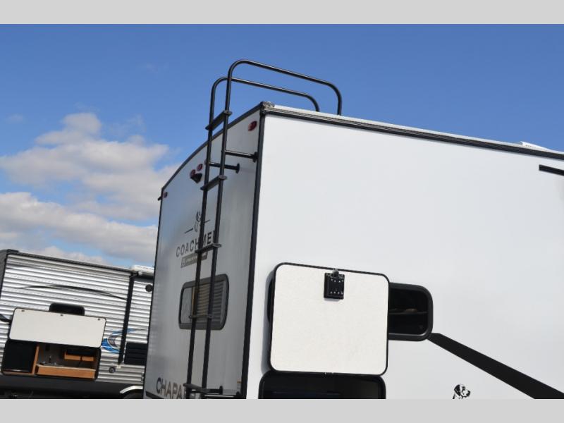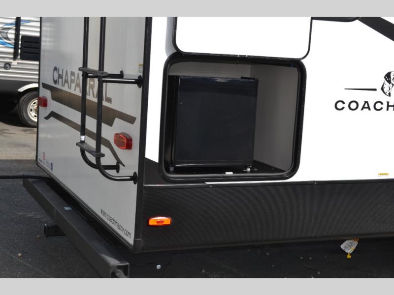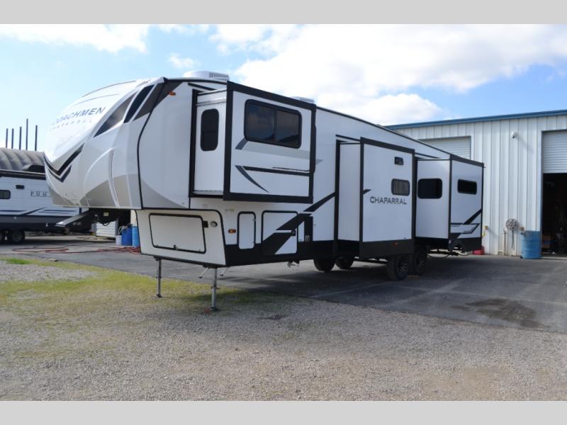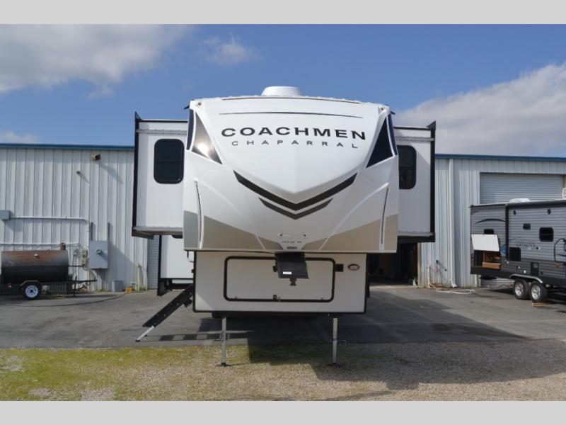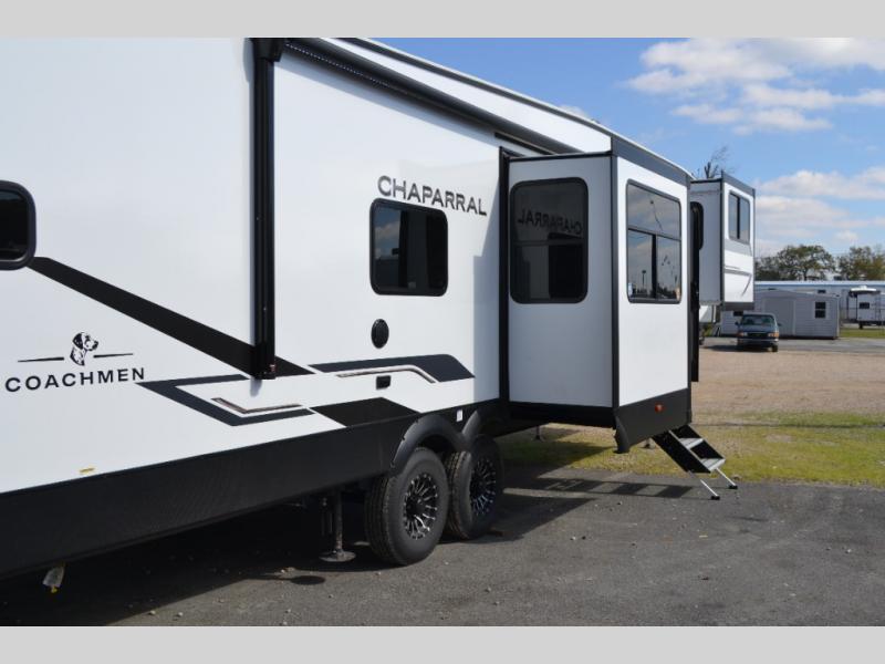 Each Chaparral mid-profile fifth wheel by Coachmen is designed with residential features, loads of storage space, and roomy bedroom suites to make you feel right at home. The durable construction means you can enjoy your RV for years to come. There's 6X double Azdel aluminum cage sidewall system, Weather Shield+ technology, and Tri-Tex powder coated frame technology that will allow you to camp year around. Each model includes a Winegard Air 360+ HDTV/radio dome antenna to help keep you connected as you camp, slow rise blackout roller night shades, a new 16 cu. ft. side-by-side stainless glass 12V refrigerator, and a modern electric fireplace to make your space cozy. There is also a large transom window in the kitchen, a modern high-rise faucet, LED motion sensor lights in the bathroom, plus a full-size shower with glass doors and a seat. Now that's what I call luxury! Choose a Chaparral fifth wheel today!