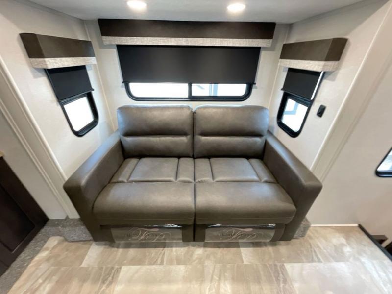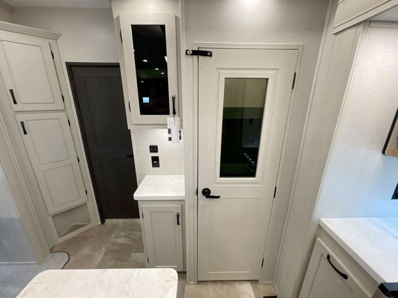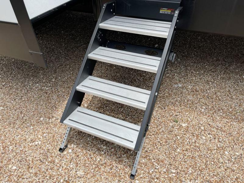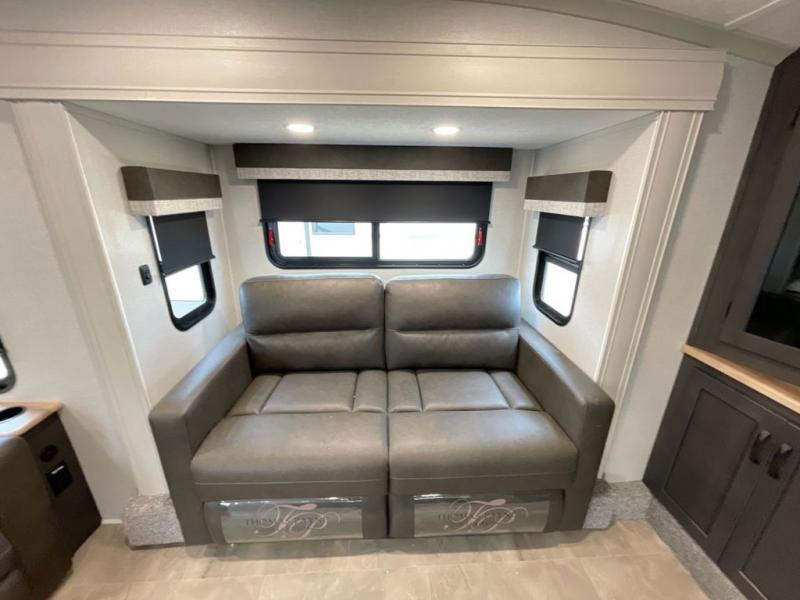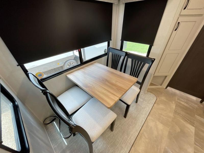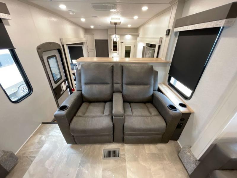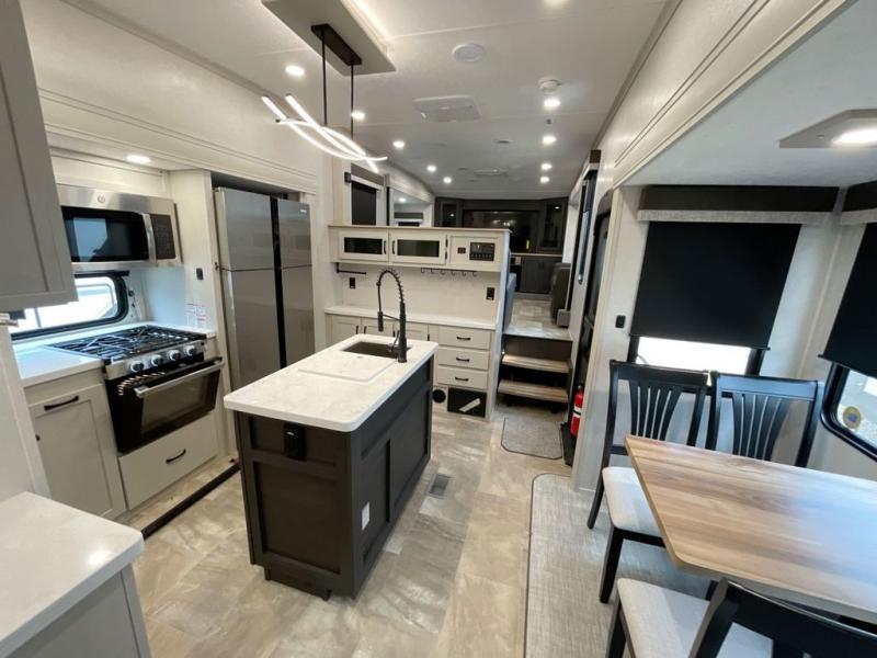 Camping or full-timing in this spacious fifth wheel will make the whole family happy. Your crew will love to visit in the front living area that included two tri-fold hide-a-bed sofas, theatre seating with a side table, plus an entertainment center for a 50" 4K Smart LED TV. The kitchen is any chef's dream with its kitchen island, large pantry, plus a hutch to store nice dishes, and stainless steel appliances. And the free-spanning table will allow you to dine just like you do at home. Head to the master suite to find a king bed slide out, two dressers, plus a full rear bath with dual bath sinks!