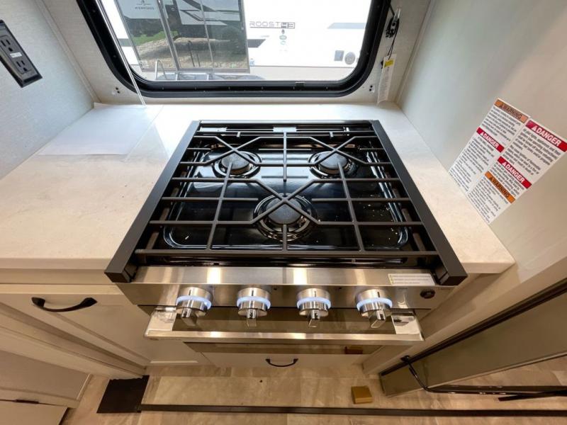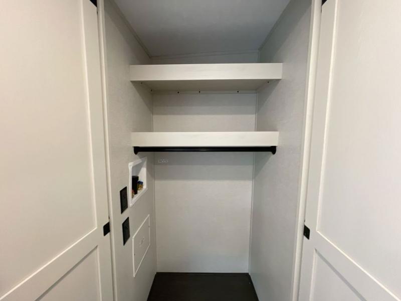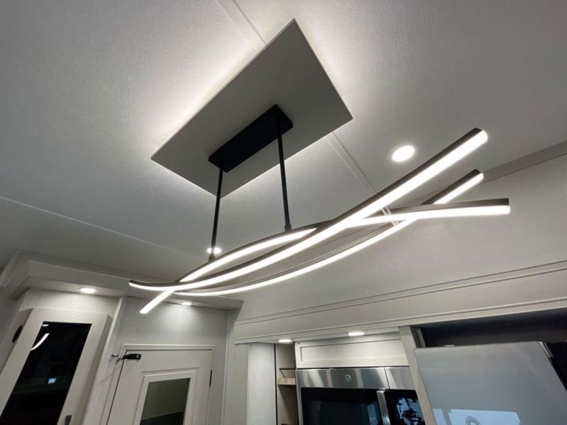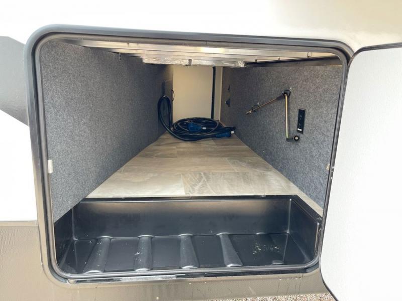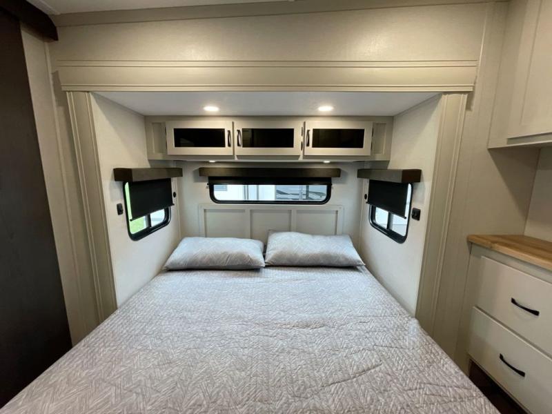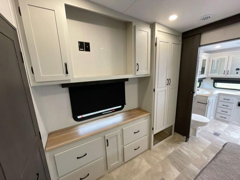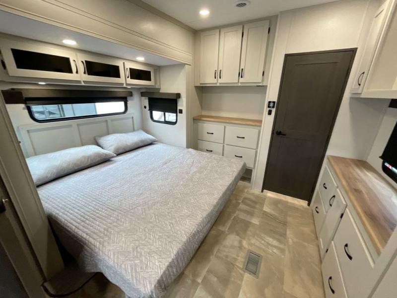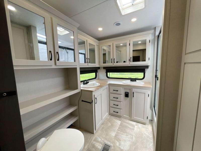 Camping or full-timing in this spacious fifth wheel will make the whole family happy. Your crew will love to visit in the front living area that included two tri-fold hide-a-bed sofas, theatre seating with a side table, plus an entertainment center for a 50" 4K Smart LED TV. The kitchen is any chef's dream with its kitchen island, large pantry, plus a hutch to store nice dishes, and stainless steel appliances. And the free-spanning table will allow you to dine just like you do at home. Head to the master suite to find a king bed slide out, two dressers, plus a full rear bath with dual bath sinks!