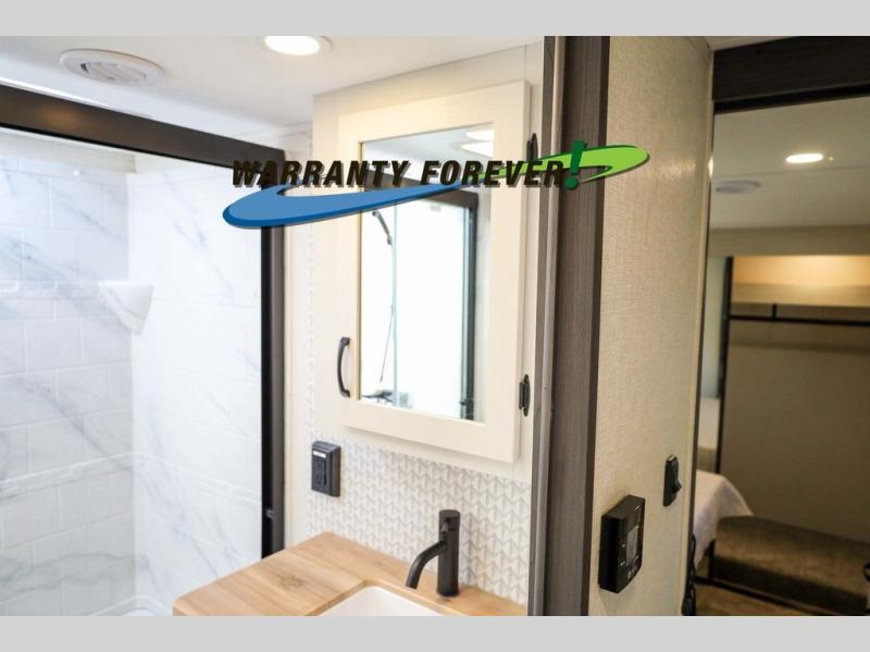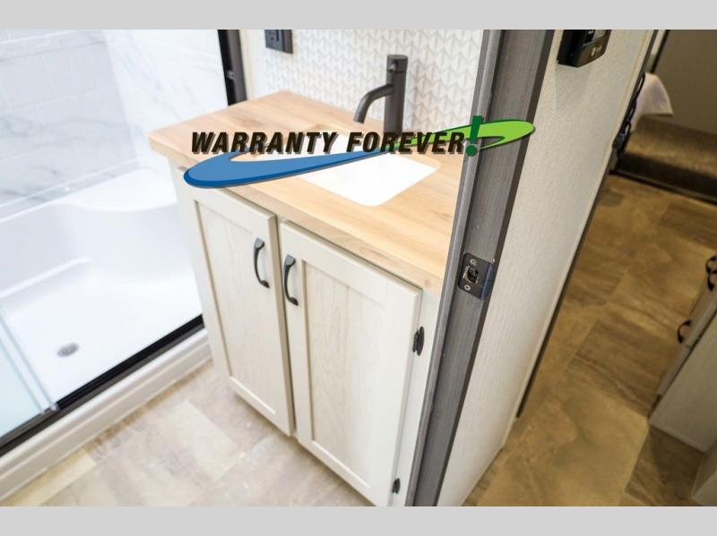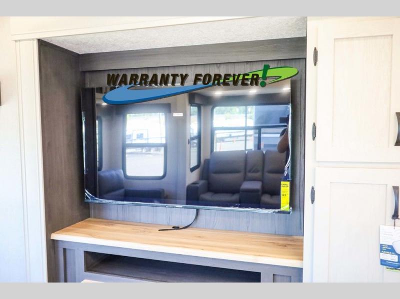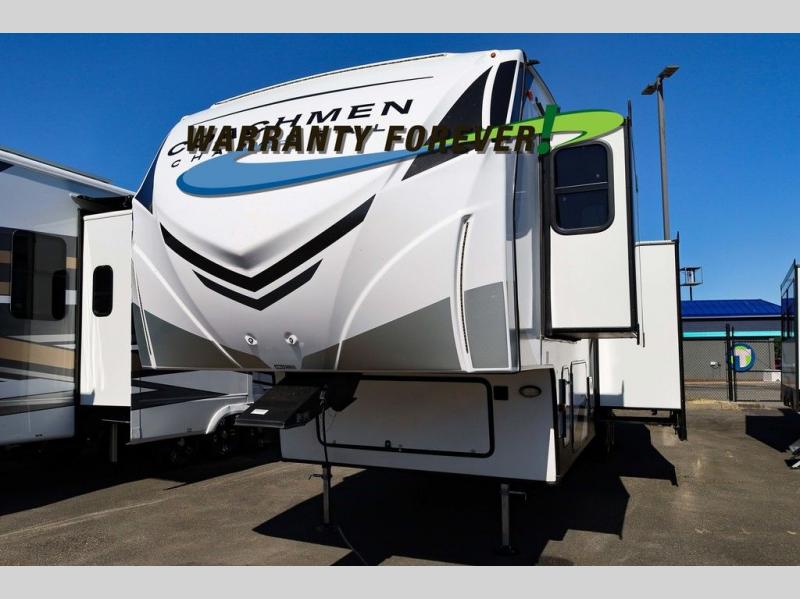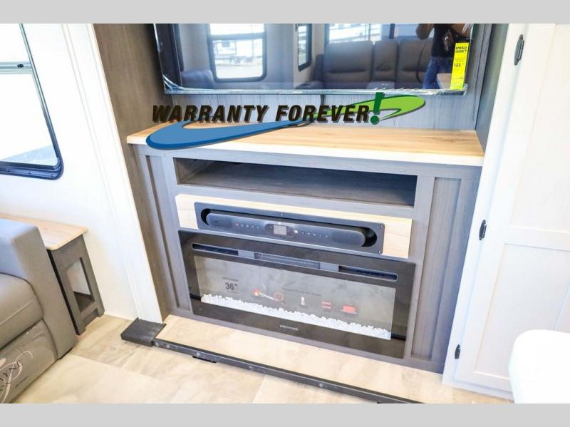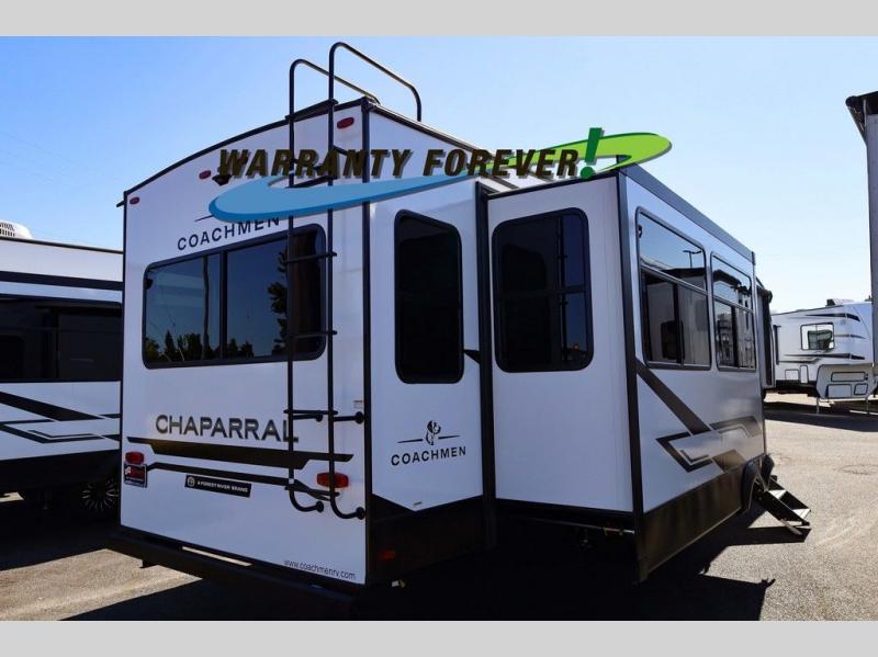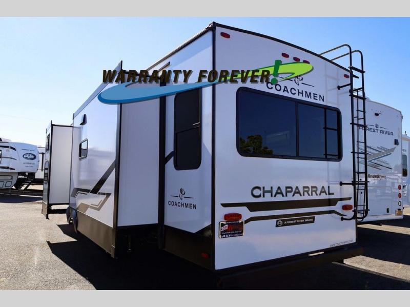 Each Chaparral mid-profile fifth wheel by Coachmen is designed with residential features, loads of storage space, and roomy bedroom suites to make you feel right at home. The durable construction means you can enjoy your RV for years to come. There's 6X double Azdel aluminum cage sidewall system, Weather Shield+ technology, and Tri-Tex powder coated frame technology that will help extend your camping season. Each model includes a Winegard Air 360+ HDTV/radio dome antenna to help keep you connected as you camp, slow rise blackout roller night shades, a new 16 cu. ft. side-by-side stainless glass 12V refrigerator, and a modern electric fireplace to make your space cozy. There is also a large transom window in the kitchen, a modern high-rise faucet, LED motion sensor lights in the bathroom, plus a full-size shower with glass doors and a seat. Now that's what I call luxury! Choose a Chaparral fifth wheel today!