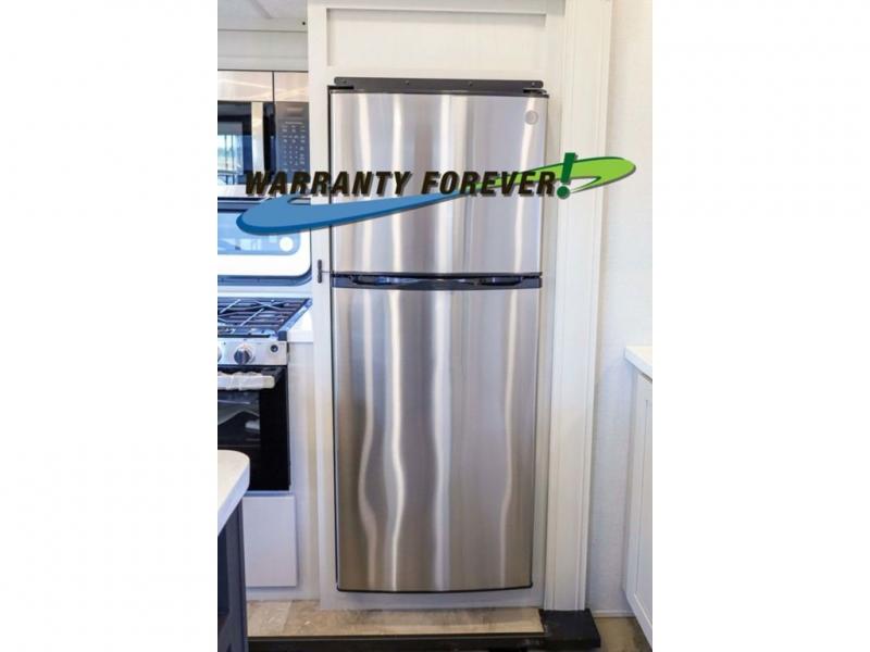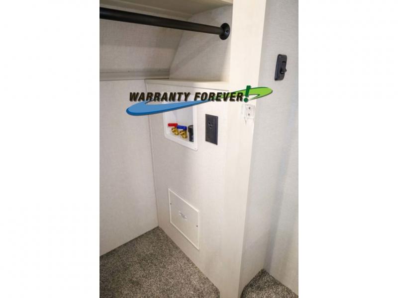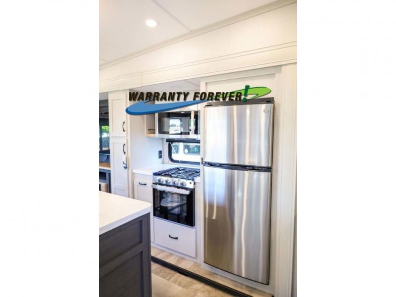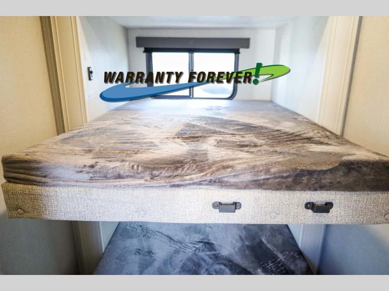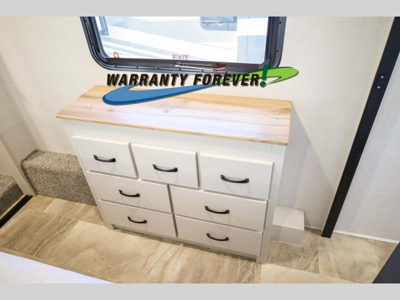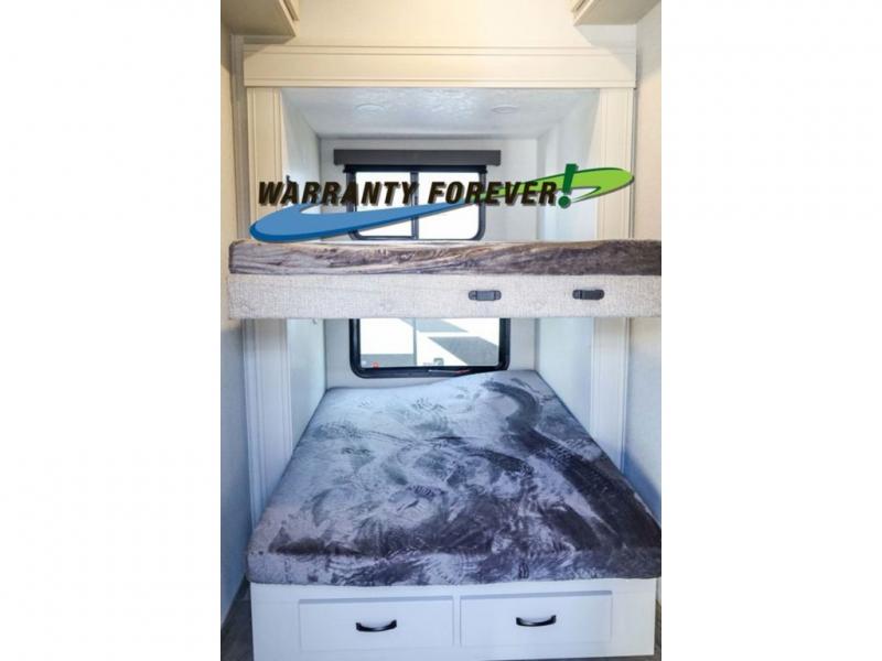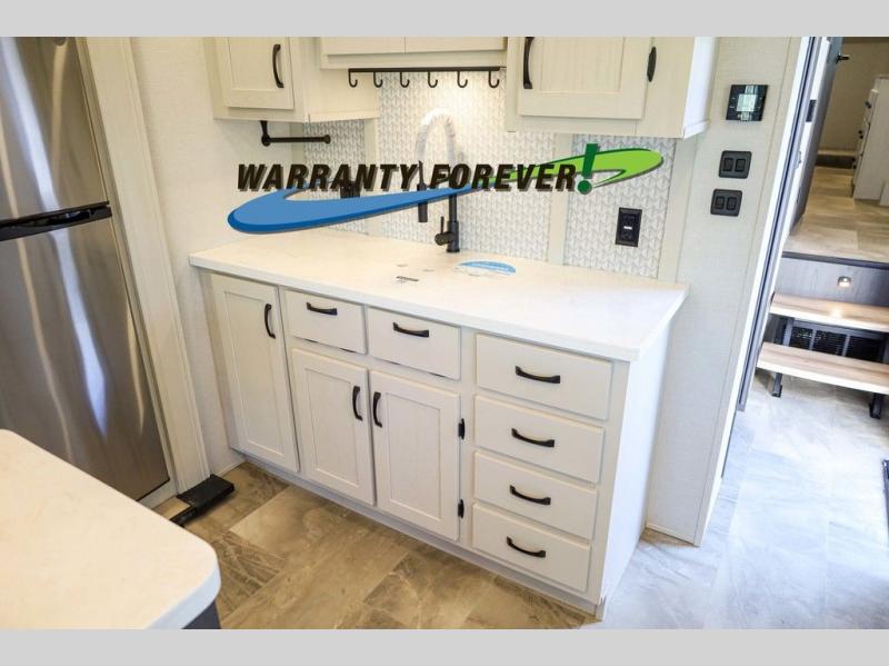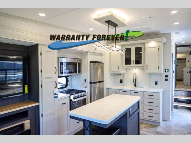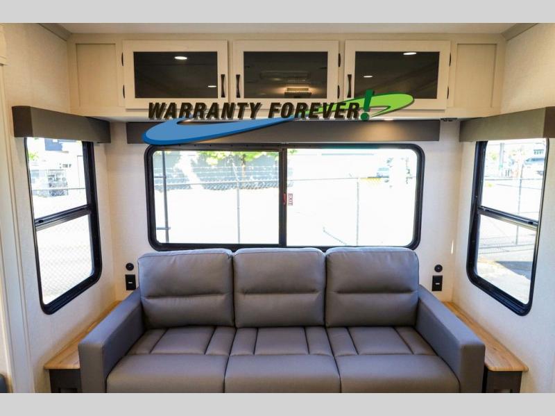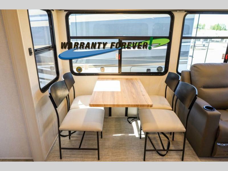 What could be better than a camping trip with family and friends? A camping trip in this spacious fifth wheel that can sleep eight people comfortably! There is a private middle bunkhouse with double-size bunks and overhead cabinets to store belongings, and a front private bedroom with a queen bed slide out. You'll find storage space in the large bedroom wardrobe that also includes washer and dryer prep if you plan to go full-time or camp for longer periods of time. Everyone can meet in the main living area that includes dual opposing slides, theatre seating, a free-spanning table, plus a tri-fold hide-a-bed sofa! And we didn't even mention the fully-equipped kitchen with stainless steel appliances, an extra deep single basin sink, plus tons of counter space with overhead cabinets for more storage!