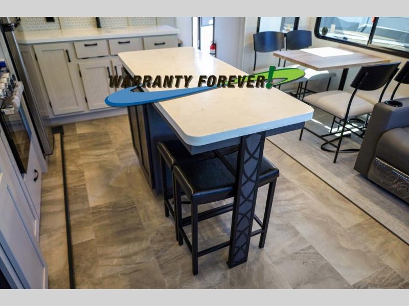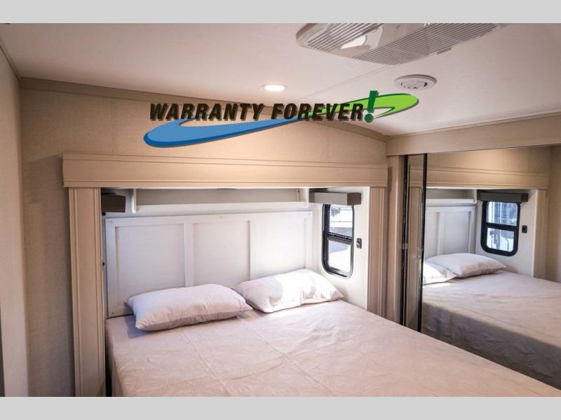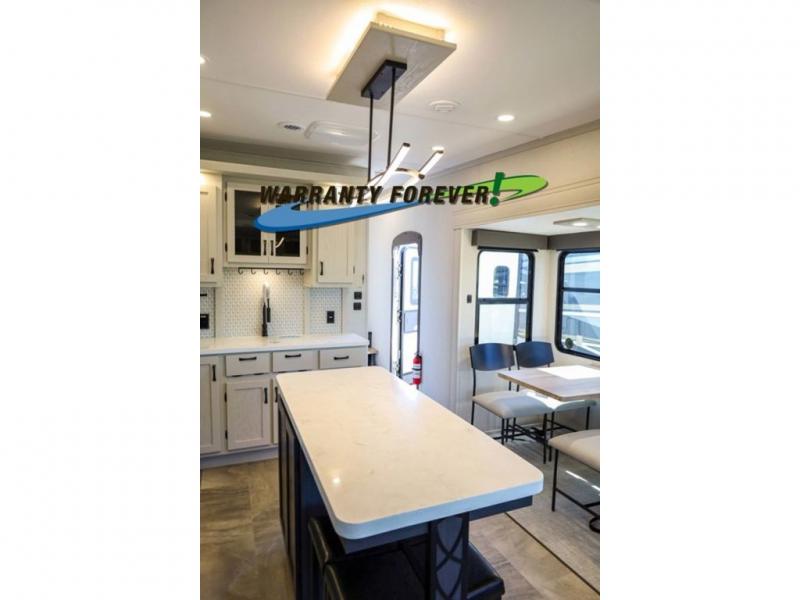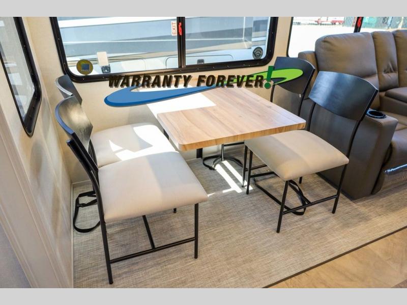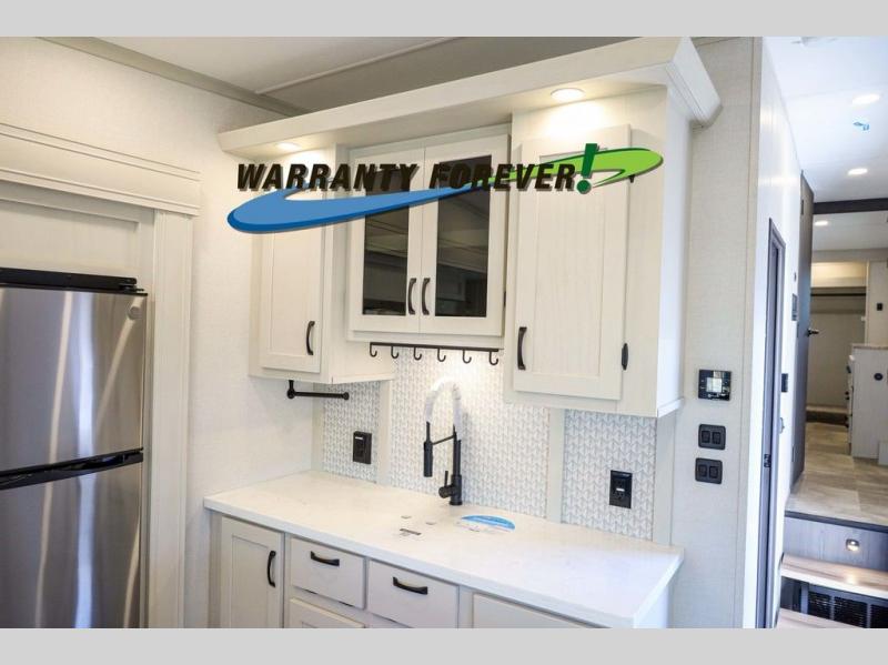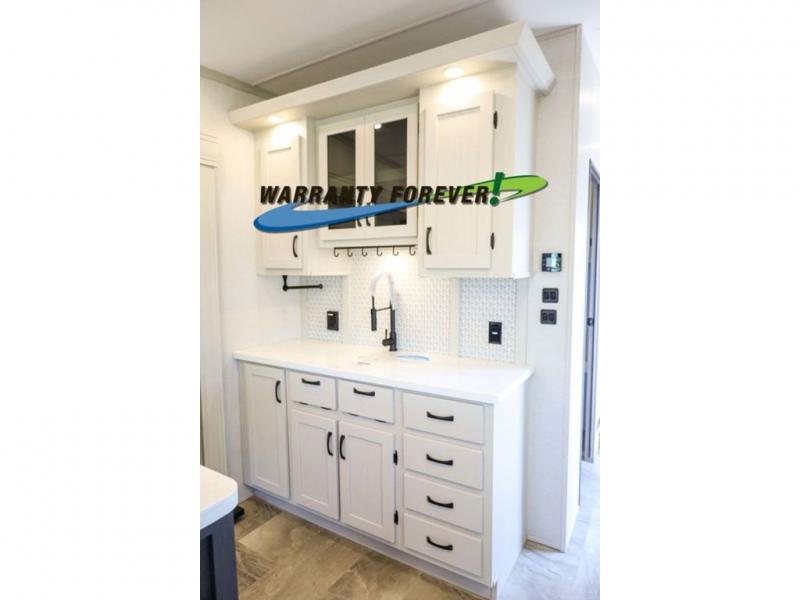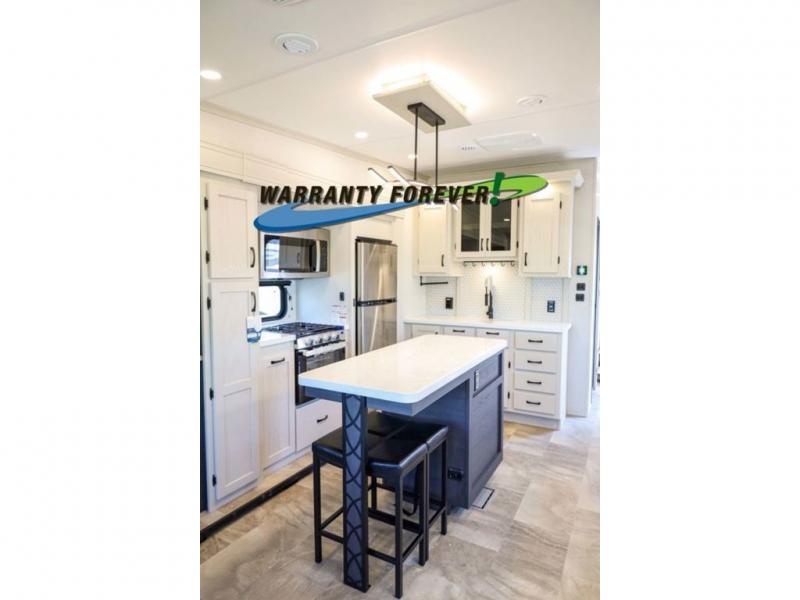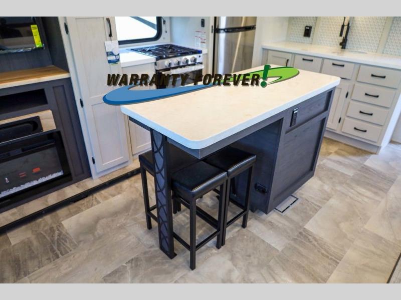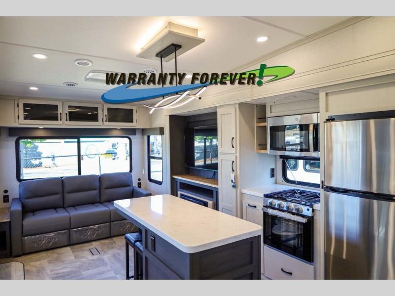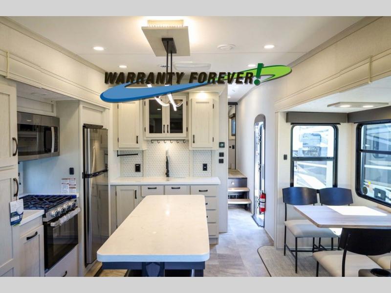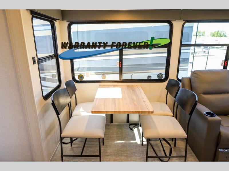 What could be better than a camping trip with family and friends? A camping trip in this spacious fifth wheel that can sleep eight people comfortably! There is a private middle bunkhouse with double-size bunks and overhead cabinets to store belongings, and a front private bedroom with a queen bed slide out. You'll find storage space in the large bedroom wardrobe that also includes washer and dryer prep if you plan to go full-time or camp for longer periods of time. Everyone can meet in the main living area that includes dual opposing slides, theatre seating, a free-spanning table, plus a tri-fold hide-a-bed sofa! And we didn't even mention the fully-equipped kitchen with stainless steel appliances, an extra deep single basin sink, plus tons of counter space with overhead cabinets for more storage!