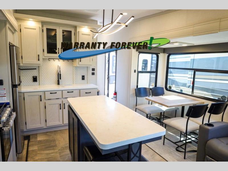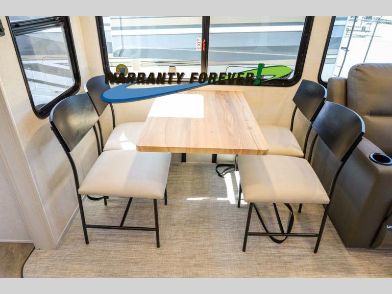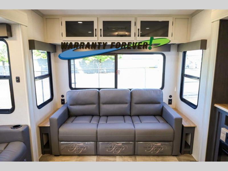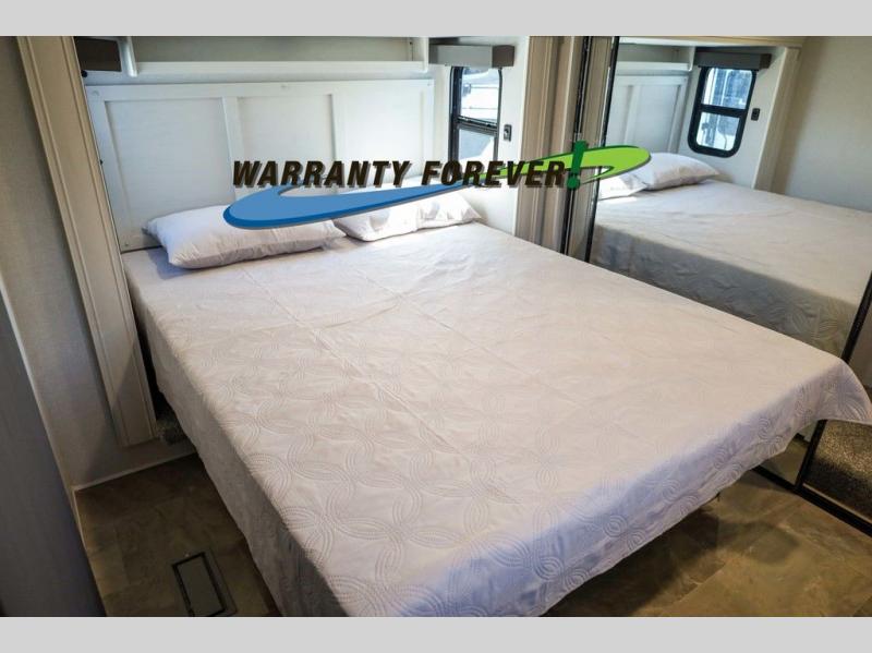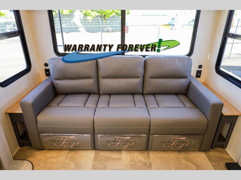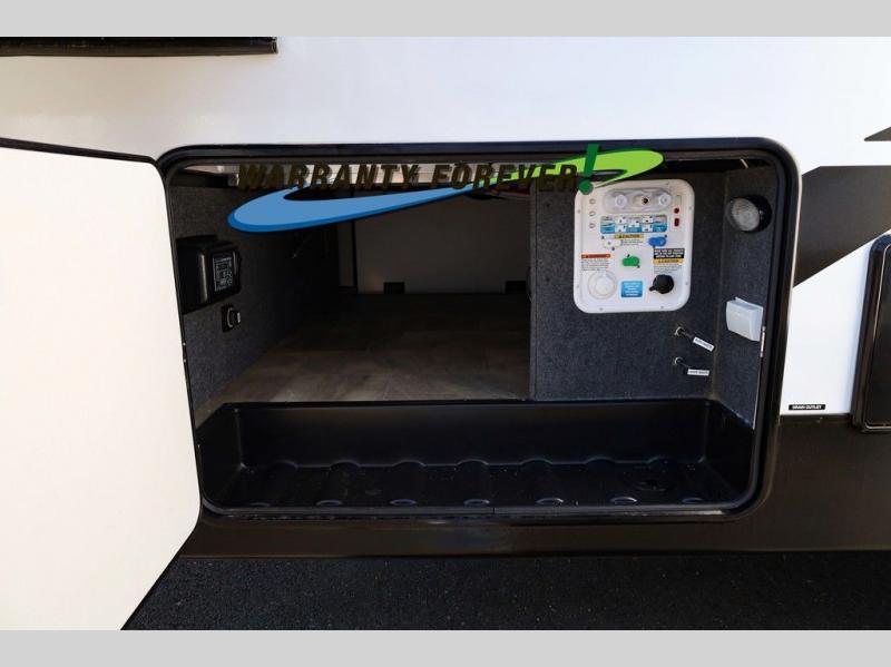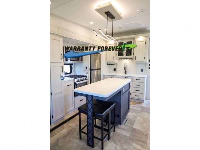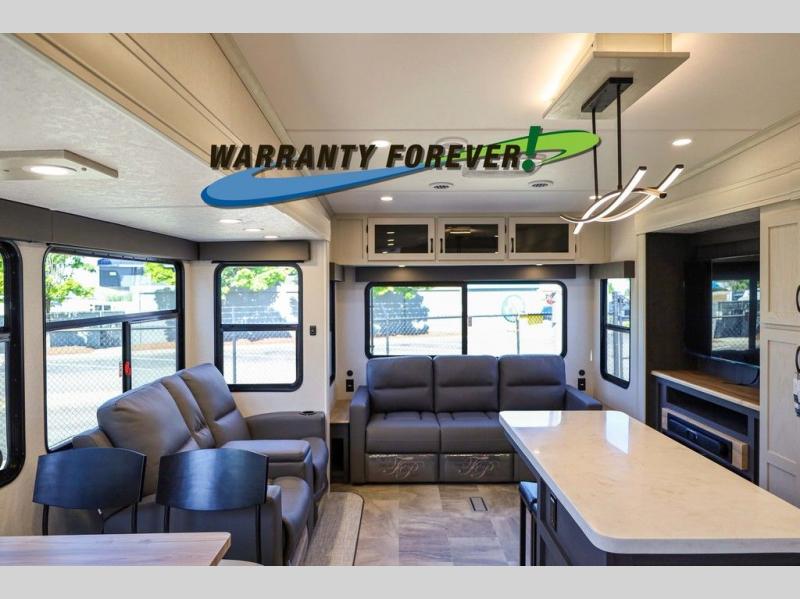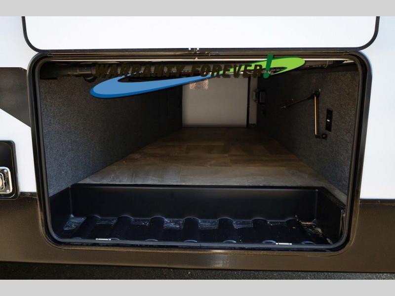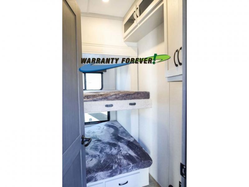 What could be better than a camping trip with family and friends? A camping trip in this spacious fifth wheel that can sleep eight people comfortably! There is a private middle bunkhouse with double-size bunks and overhead cabinets to store belongings, and a front private bedroom with a queen bed slide out. You'll find storage space in the large bedroom wardrobe that also includes washer and dryer prep if you plan to go full-time or camp for longer periods of time. Everyone can meet in the main living area that includes dual opposing slides, theatre seating, a free-spanning table, plus a tri-fold hide-a-bed sofa! And we didn't even mention the fully-equipped kitchen with stainless steel appliances, an extra deep single basin sink, plus tons of counter space with overhead cabinets for more storage!