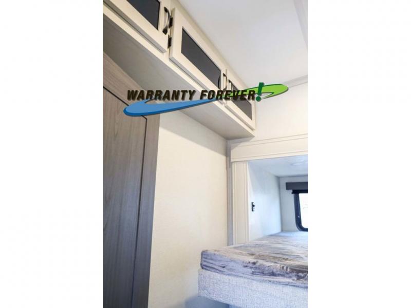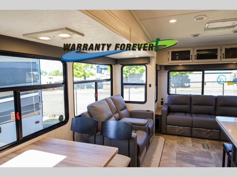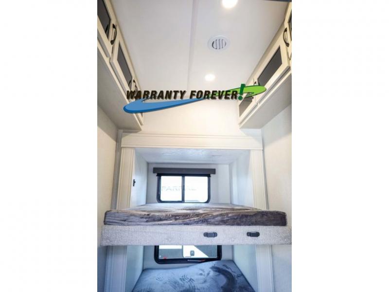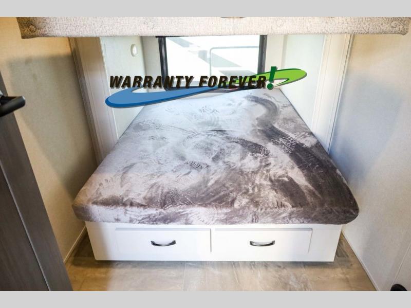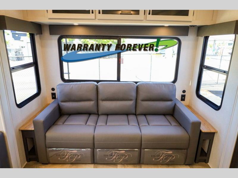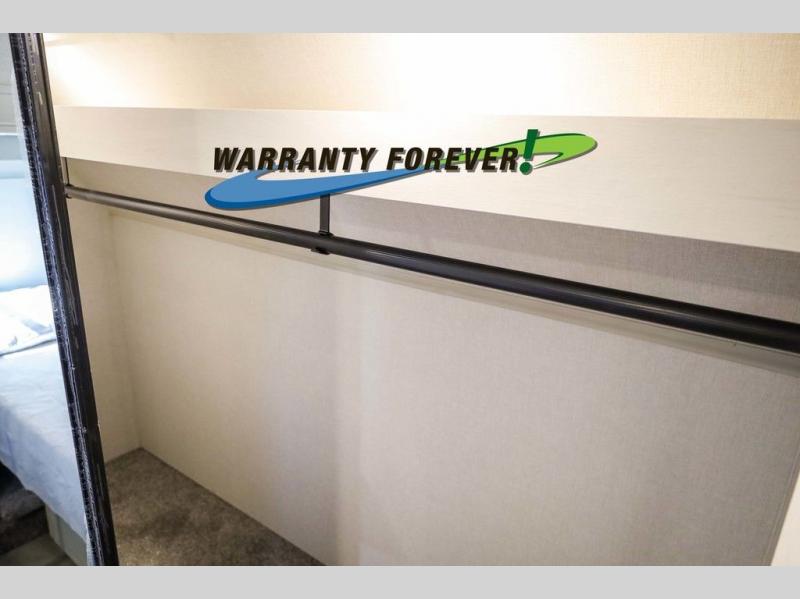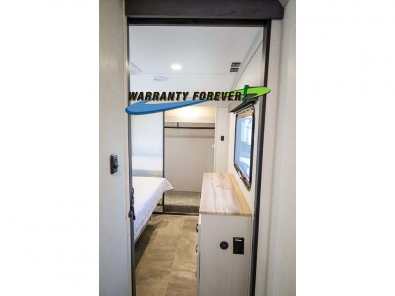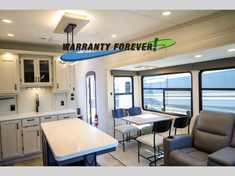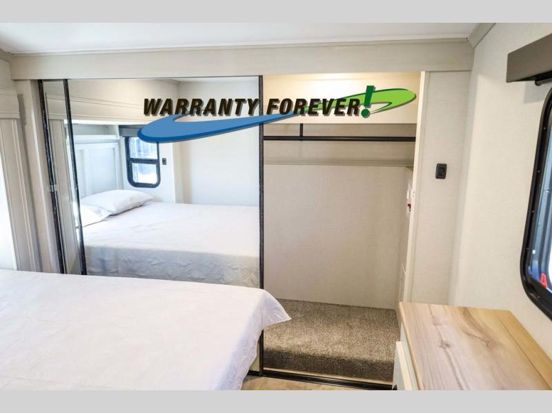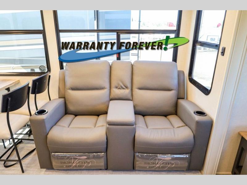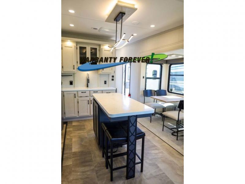 What could be better than a camping trip with family and friends? A camping trip in this spacious fifth wheel that can sleep eight people comfortably! There is a private middle bunkhouse with double-size bunks and overhead cabinets to store belongings, and a front private bedroom with a queen bed slide out. You'll find storage space in the large bedroom wardrobe that also includes washer and dryer prep if you plan to go full-time or camp for longer periods of time. Everyone can meet in the main living area that includes dual opposing slides, theatre seating, a free-spanning table, plus a tri-fold hide-a-bed sofa! And we didn't even mention the fully-equipped kitchen with stainless steel appliances, an extra deep single basin sink, plus tons of counter space with overhead cabinets for more storage!