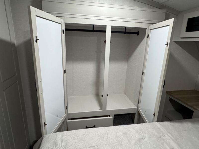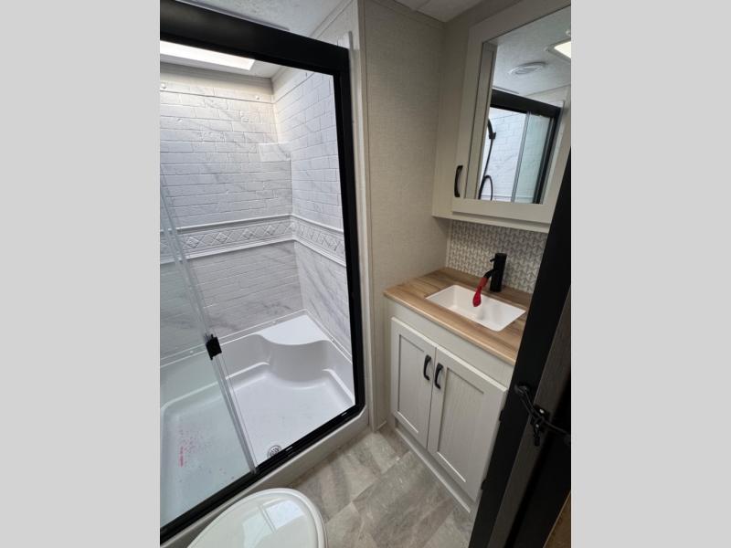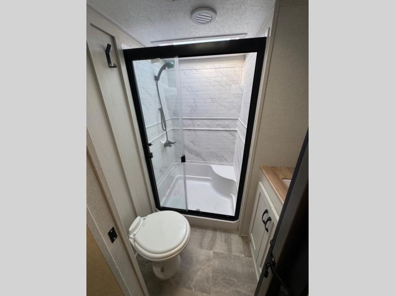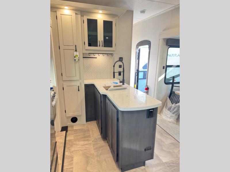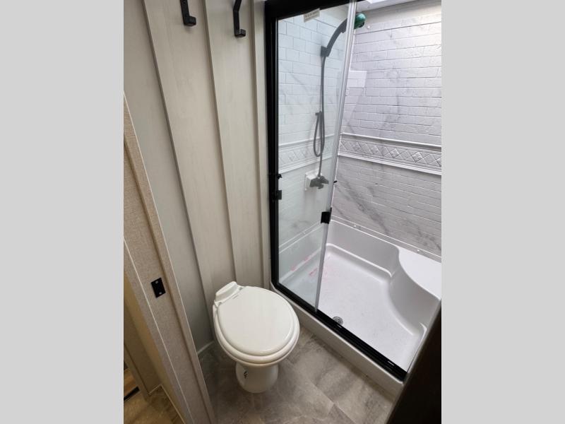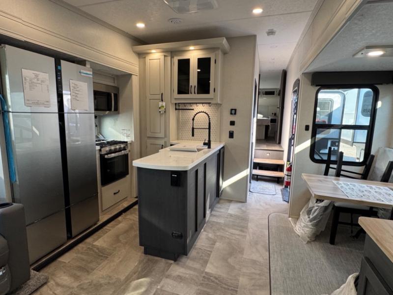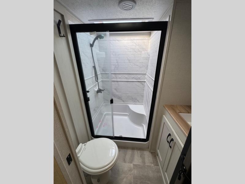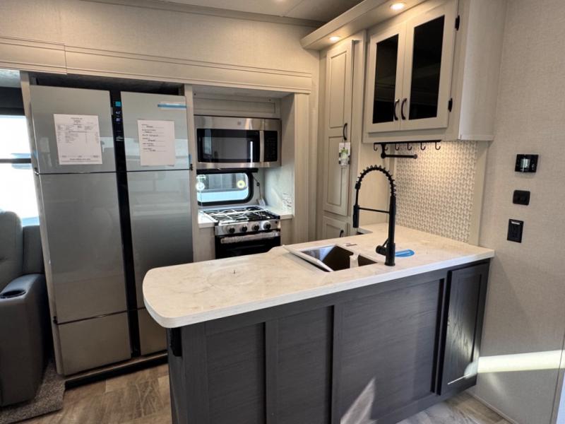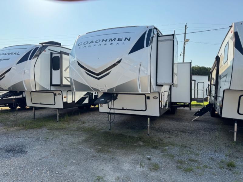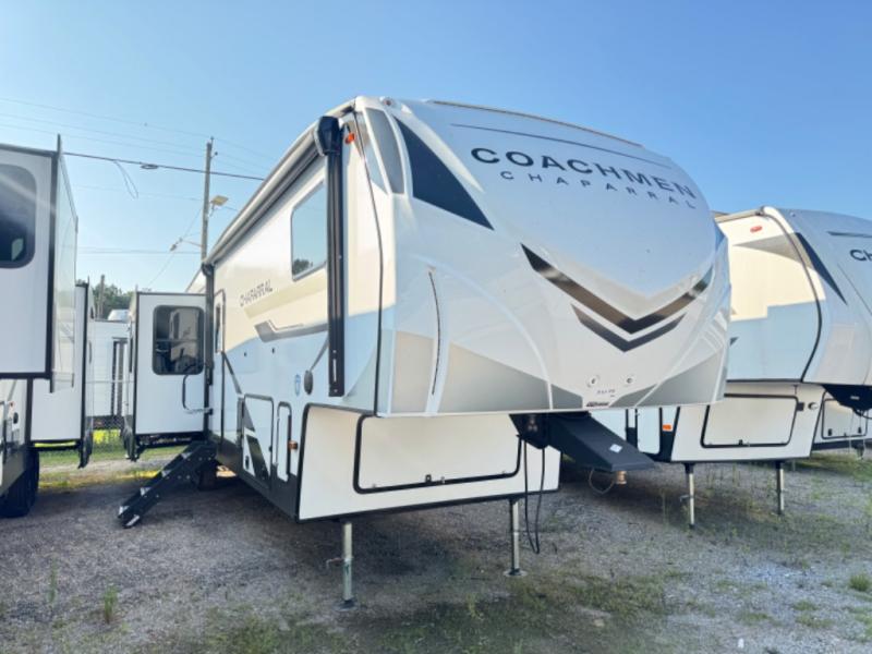 Each Chaparral mid-profile fifth wheel by Coachmen is designed with residential features, loads of storage space, and roomy bedroom suites to make you feel right at home. The durable construction means you can enjoy your RV for years to come. There's 6X double Azdel aluminum cage sidewall system, Weather Shield+ technology, and Tri-Tex powder coated frame technology that will help extend your camping season. Each model includes a Winegard Air 360+ HDTV/radio dome antenna to help keep you connected as you camp, slow rise blackout roller night shades, a new 16 cu. ft. side-by-side stainless glass 12V refrigerator, and a modern electric fireplace to make your space cozy. There is also a large transom window in the kitchen, a modern high-rise faucet, LED motion sensor lights in the bathroom, plus a full-size shower with glass doors and a seat. Now that's what I call luxury! Choose a Chaparral fifth wheel today!