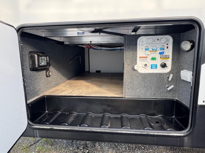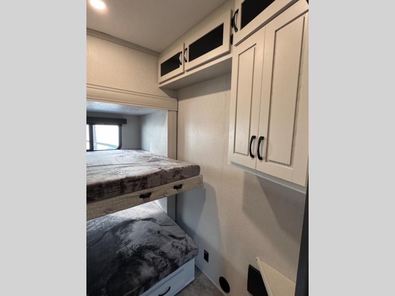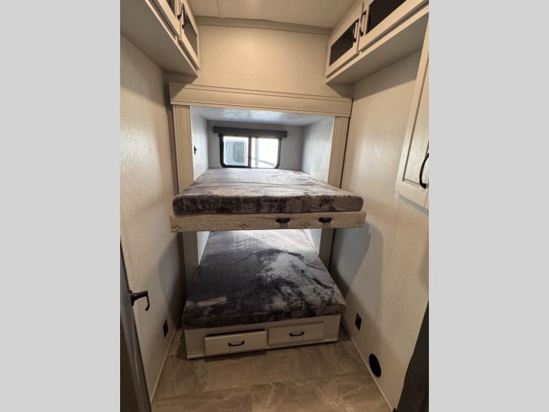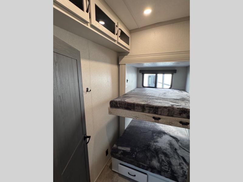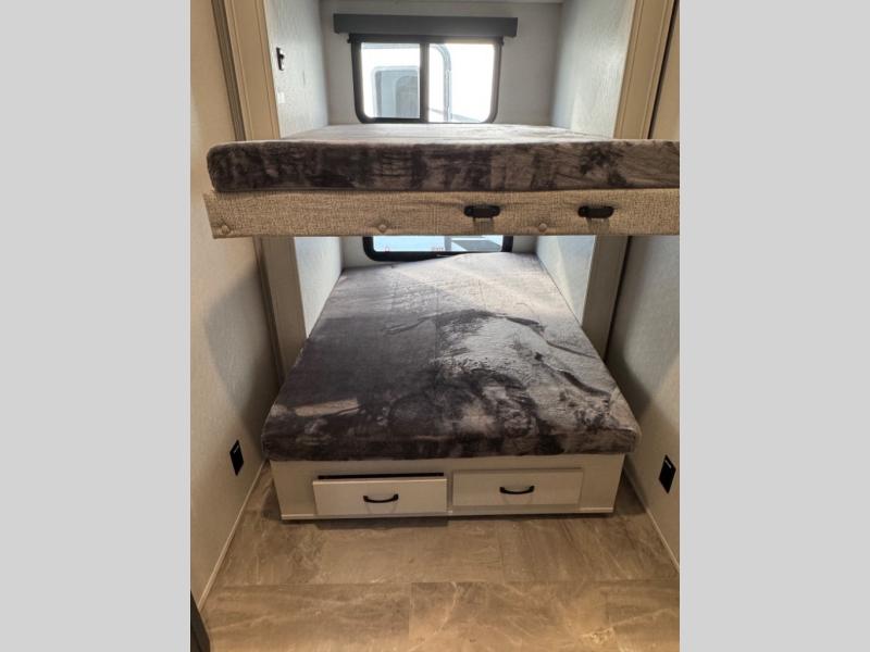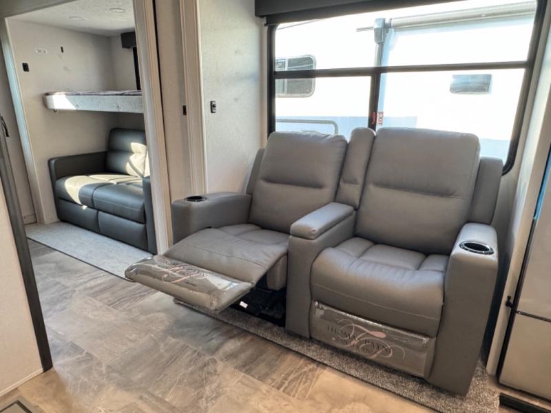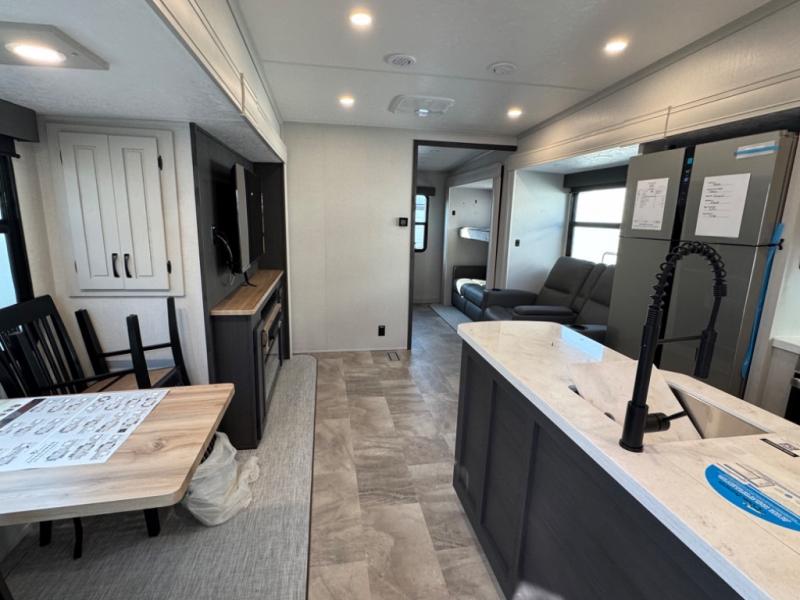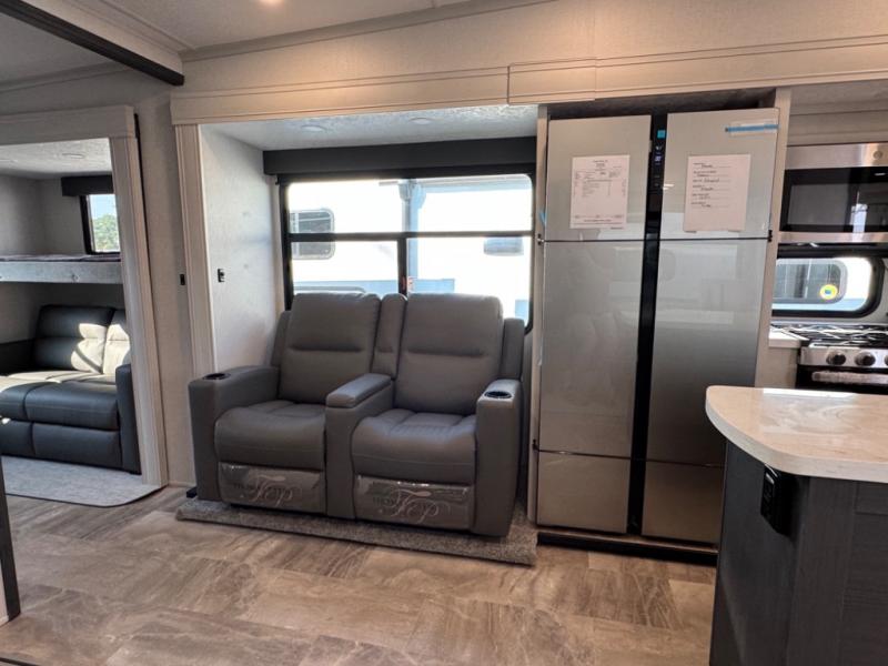 They say you can't have it all, but you can almost have it all with this fifth wheel in tow! This is the perfect unit to camp with family or a large group of friends since it features two private bunkhouses, two full baths, and two entry doors! The rear bunkhouse includes its own full bath, a tri-fold sofa and a flip-down bunk, plus a dresser to store clothes. Within the middle bunkhouse you'll find double-size bunks and overhead cabinets for your guests' things. Everyone will love to visit in the main living area that includes a free-standing table, theatre seating, and an entertainment center with a 50" 4K Smart LED TV. This Chaparral kitchen is complete with an island peninsula, pantry, plus a 16 cu. ft. side-by-side 12V refrigerator. There is also an outside entertainment center and an outside refrigerator to keep cold drinks stocked.