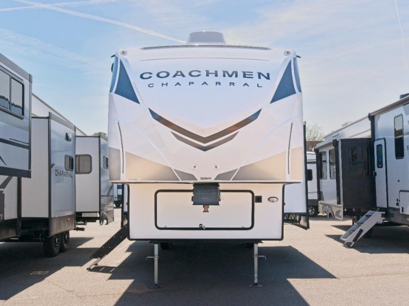 Each Chaparral mid-profile fifth wheel by Coachmen is built with residential features and ample storage to make you feel at home. The durable construction includes a 6X double Azdel aluminum cage sidewall system, Weather Shield+ technology, and Tri-Tex powder-coated frame technology, allowing for year-round camping.