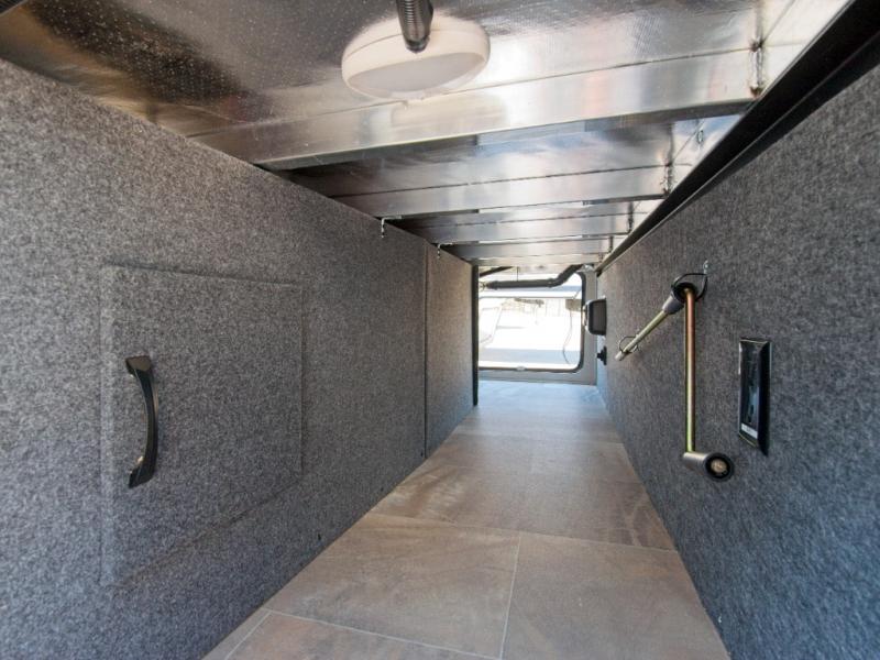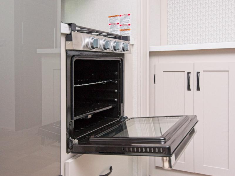 Enjoy modern amenities like the Winegard Air 360+ HDTV/radio dome antenna, slow rise blackout roller night shades, a 16 cu. ft. side-by-side stainless glass 12V refrigerator, and an electric fireplace. The kitchen features a large transom window and a high-rise faucet, while the bathroom includes LED motion sensor lights and a full-size shower with glass doors and a seat.