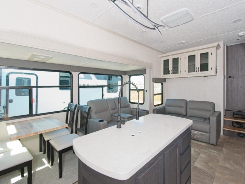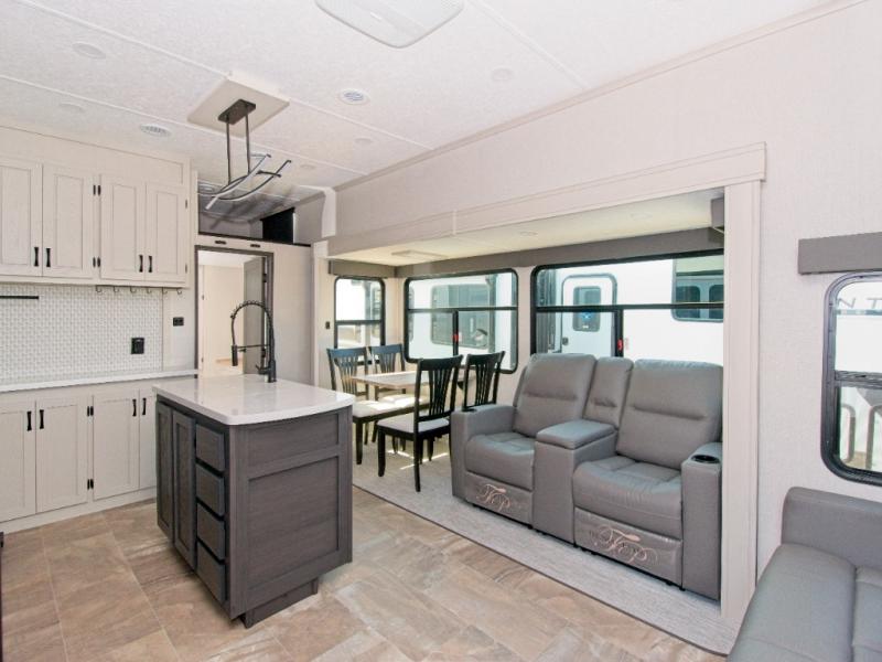 On the main level, the kitchen and living area are combined in a large slide-out, featuring a theater seat and a free-standing table for four. The center island with a sink is perfect for meal prep and socializing. A tri-fold sofa provides additional seating and sleeping space.