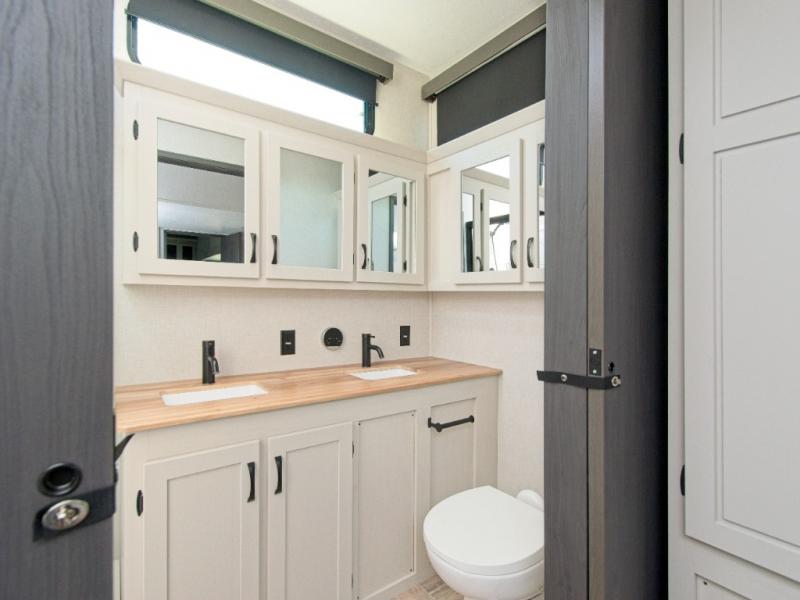The rear of the fifth wheel houses the master bedroom with a king bed slide-out and a second full bath. This bath includes a vanity with two sinks, a toilet, and a large shower with a seat. Above the master bedroom is a loft that can be used for sleeping or extra storage.