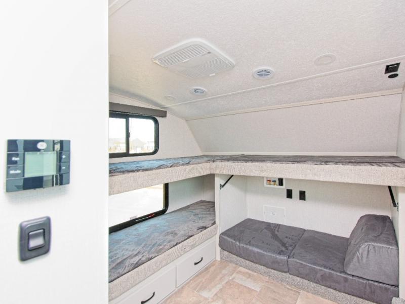 The Coachmen Chaparral 375BAF is perfect for families who love to travel in comfort. The front bunkhouse, complete with a private full bath, is ideal for kids and their friends. It features a cube sofa with a 30" x 62" bunk overhead and 30" x 74" bunks on the side. The bunkhouse bath includes a tub/shower, toilet, and sink, along with wardrobe space for clothes.