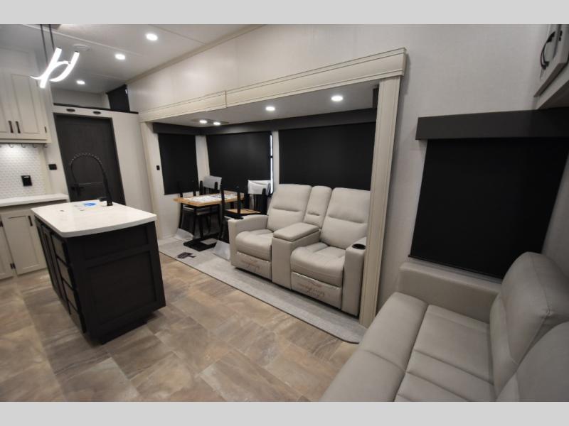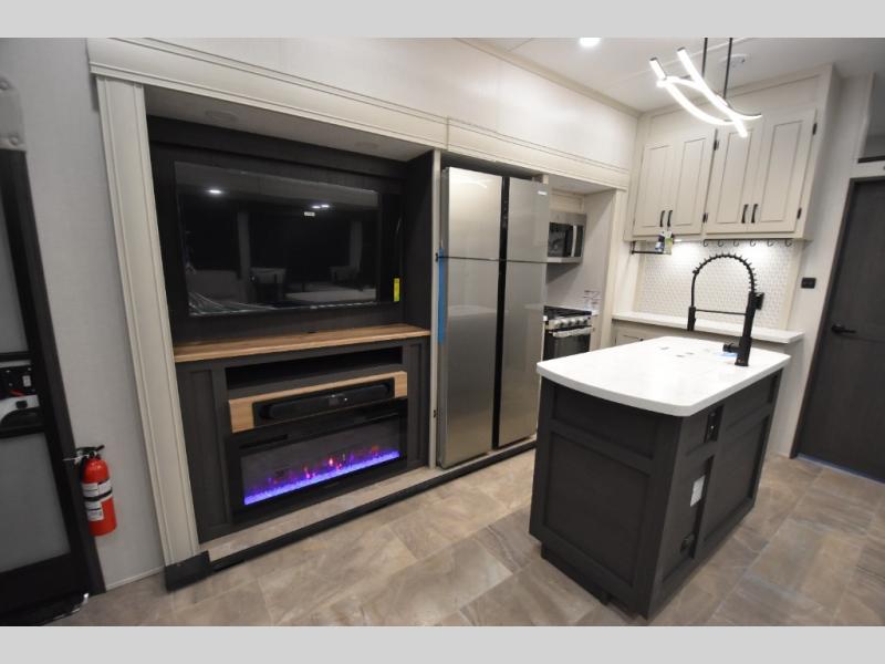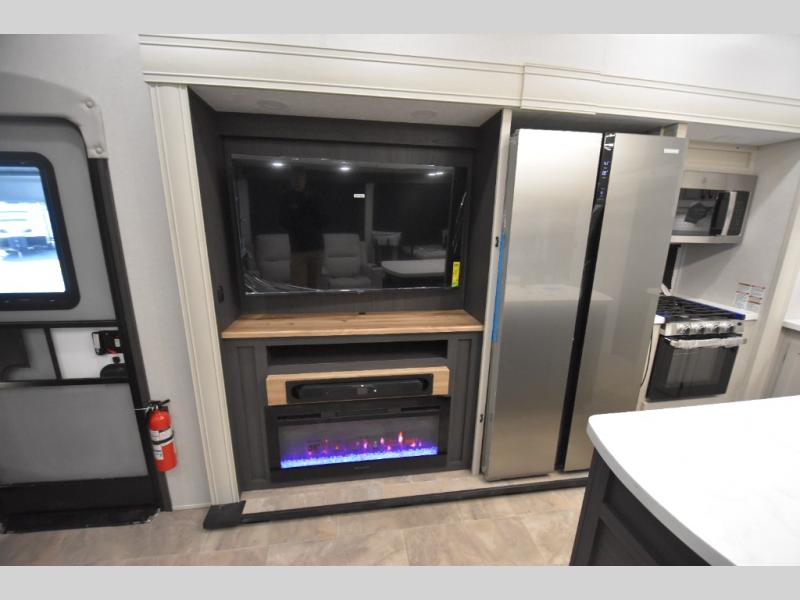 - Spacious Rear Living Area – Includes a tri-fold sofa, theater seating, and an entertainment center with a large LED TV and electric fireplace for a cozy atmosphere.