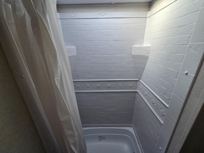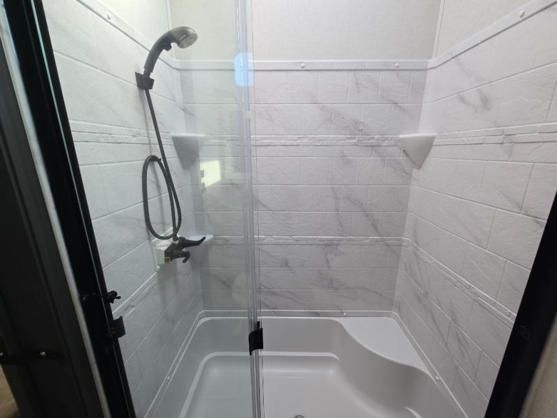 Full-Size Shower with Glass Doors and Seat: For added comfort and ease while showering.
