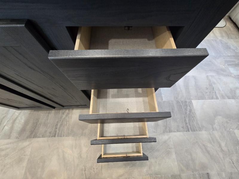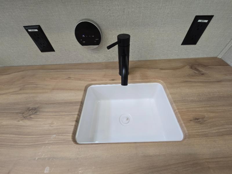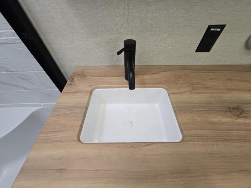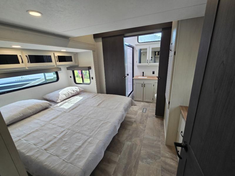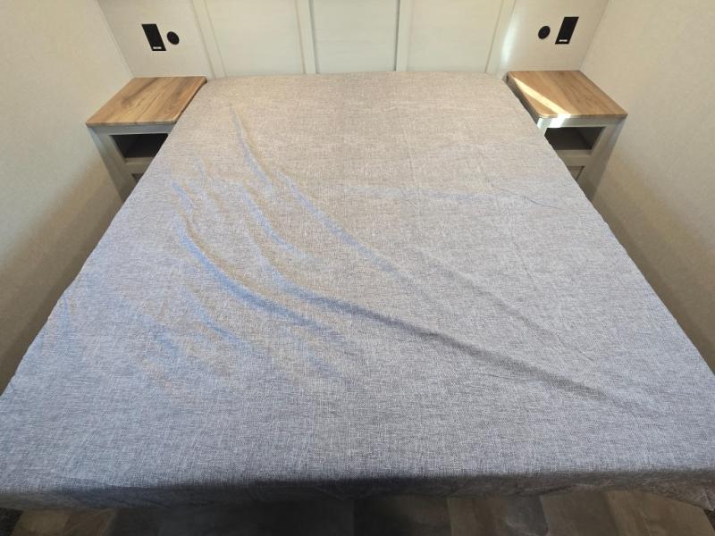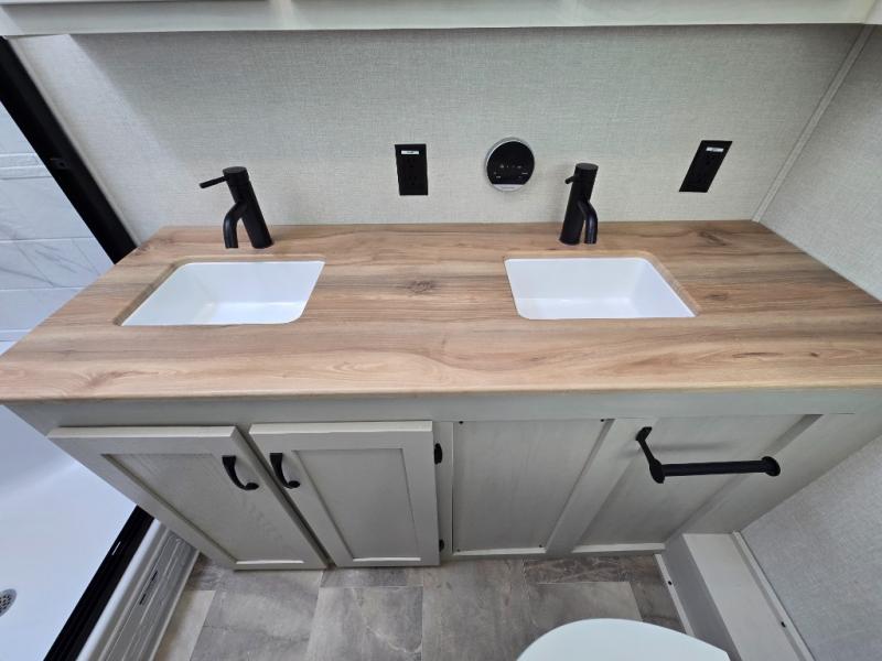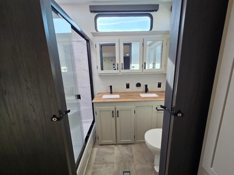 Rear Suite: King-sized bed slide-out with a second full bath, including dual bath sinks for added convenience.
