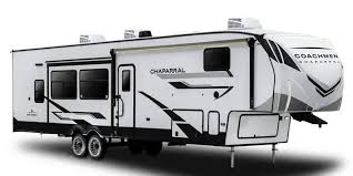 Each Chaparral mid-profile fifth wheel by Coachmen is designed with residential features, loads of storage space, and roomy bedroom suites to make you feel right at home. The durable construction means you can enjoy your RV for years to come. There's 6X double Azdel aluminum cage sidewall system, Weather Shield+ technology, and Tri-Tex powder coated frame technology that will allow you to camp year around. Each model includes a Winegard Air 360+ HDTV/radio dome antenna to help keep you connected as you camp, slow rise blackout roller night shades, a new 16 cu. ft. side-by-side stainless glass 12V refrigerator, and a modern electric fireplace to make your space cozy. There is also a large transom window in the kitchen, a modern high-rise faucet, LED motion sensor lights in the bathroom, plus a full-size shower with glass doors and a seat. Now that's what I call luxury! Choose a Chaparral fifth wheel today!
