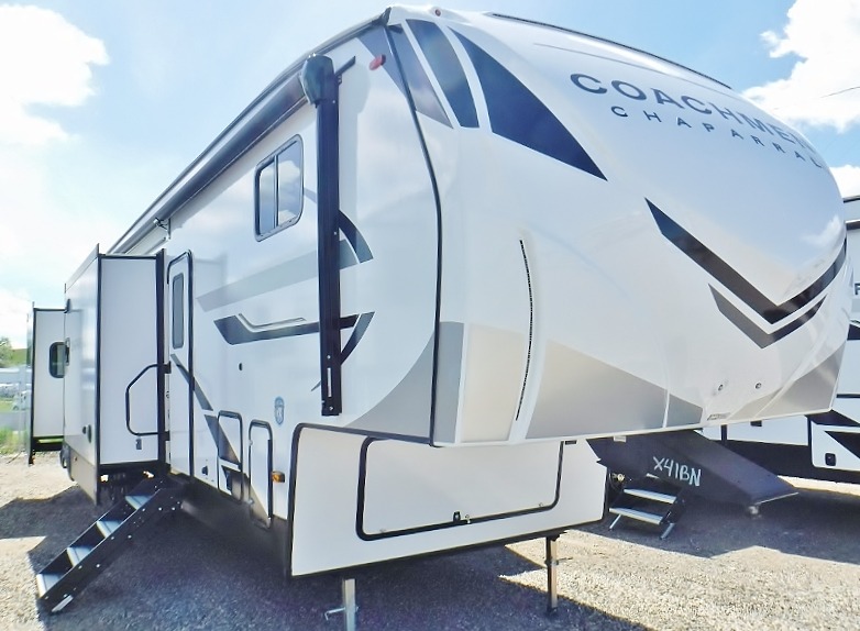 Each Chaparral mid-profile fifth wheel by Coachmen is designed with residential features, loads of storage space, and roomy bedroom suites to make you feel right at home. The durable construction means you can enjoy your RV for years to come. There's 6X double Azdel aluminum cage sidewall system, Weather Shield+ technology, and Tri-Tex powder coated frame technology that will help extend your camping season. Each model includes a Winegard Air 360+ HDTV/radio dome antenna to help keep you connected as you camp, slow rise blackout roller night shades, a new 16 cu. ft. side-by-side stainless glass 12V refrigerator, and a modern electric fireplace to make your space cozy. There is also a large transom window in the kitchen, a modern high-rise faucet, LED motion sensor lights in the bathroom, plus a full-size shower with glass doors and a seat. Now that's what I call luxury! Choose a Chaparral fifth wheel today!