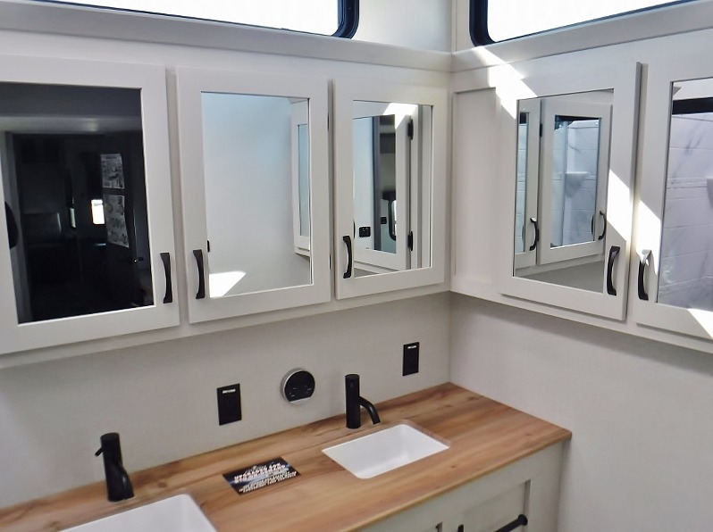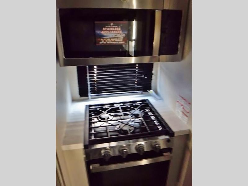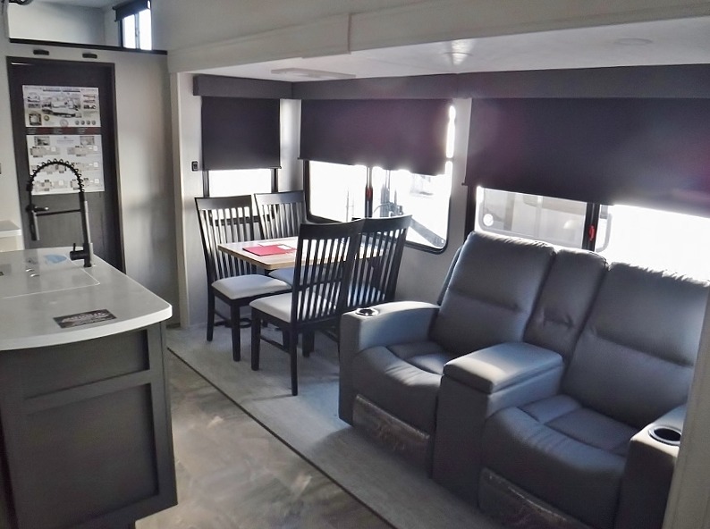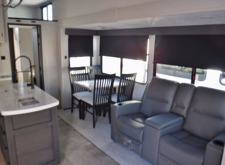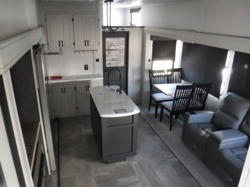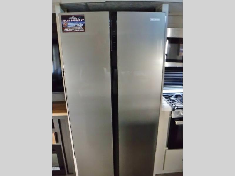 One look at this fifth wheel and you'll be sold! There are an impressive two master suites; one up front with a queen bed and full bath, and one towards the back with a king bed slide and second full bath! There are even dual bath sinks in the rear bath for added convenience! The middle living area includes dual opposing slides, a tri-fold sofa, plus theater seating and a free-spanning table for ample seating, dining, and sleeping space. There is also an entertainment center with a 50" 4K Smart LED TV to wash away those rainy day blues. The chef of your crew will have a GE Profile 21" stainless steel oven with a residential cooktop and a GE Profile stainless residential microwave to cook meals each day, a kitchen island for more counter space, and a 16 cu. ft. side-by-side 12V refrigerator for food storage.