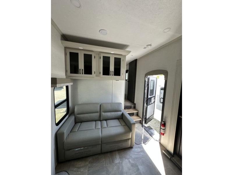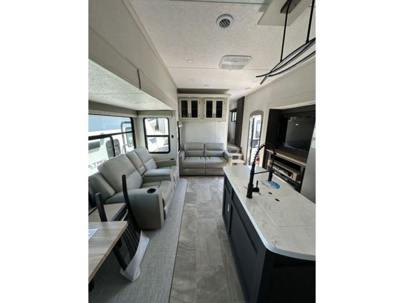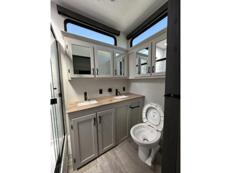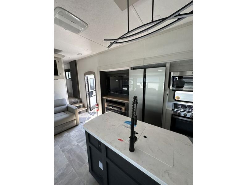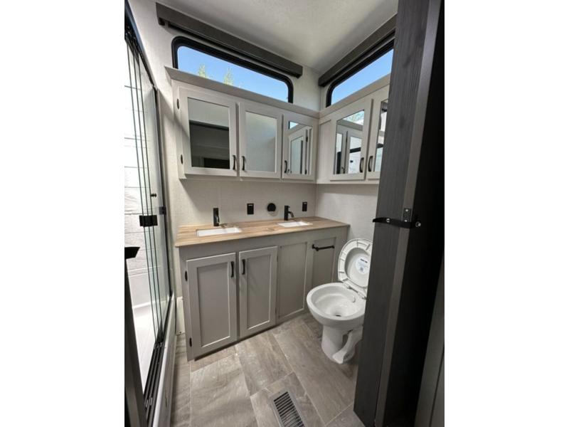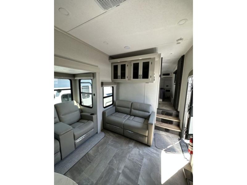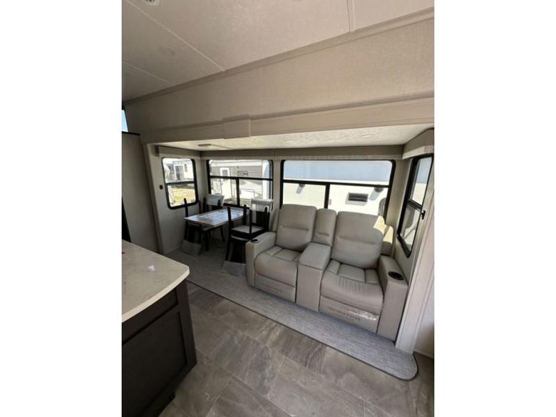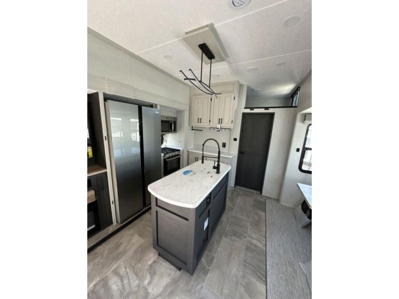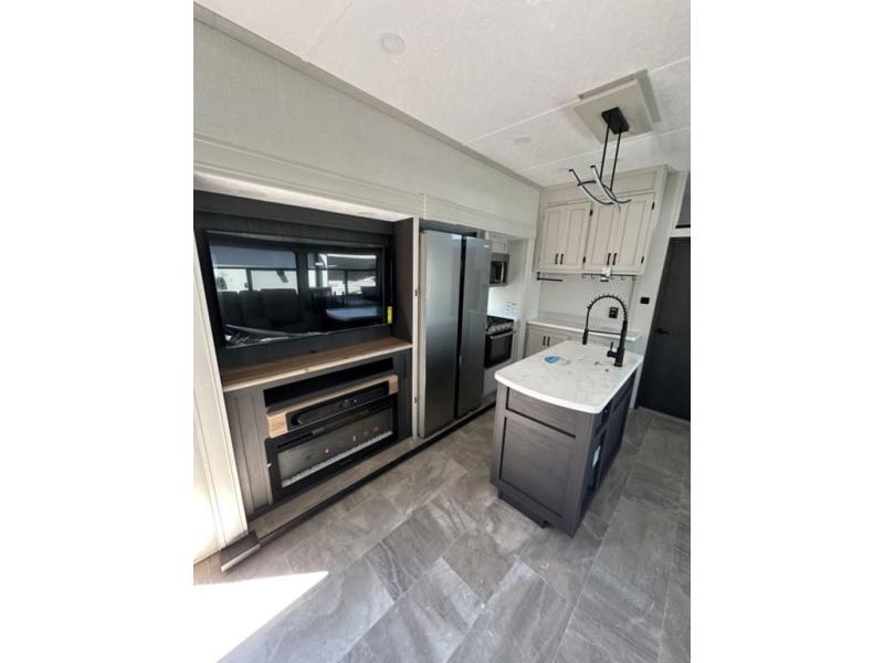 One look at this fifth wheel and you'll be sold! There are an impressive two master suites; one up front with a queen bed and full bath, and one towards the back with a king bed slide and second full bath! There are even dual bath sinks in the rear bath for added convenience! The middle living area includes dual opposing slides, a tri-fold sofa, plus theater seating and a free-spanning table for ample seating, dining, and sleeping space. There is also an entertainment center with a 50" 4K Smart LED TV to wash away those rainy day blues. The chef of your crew will have a GE Profile 21" stainless steel oven with a residential cooktop and a GE Profile stainless residential microwave to cook meals each day, a kitchen island for more counter space, and a 16 cu. ft. side-by-side 12V refrigerator for food storage.