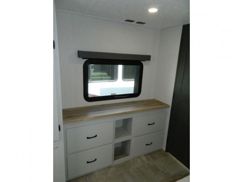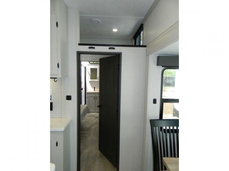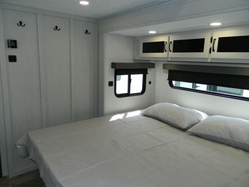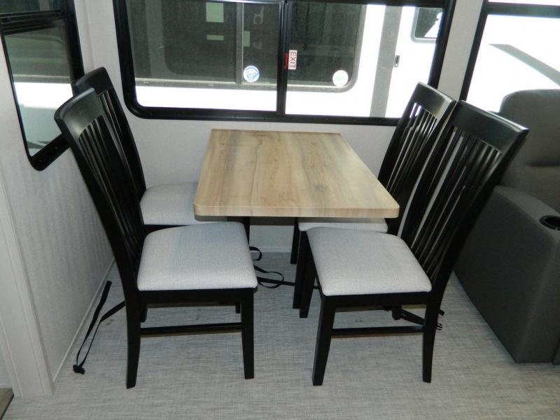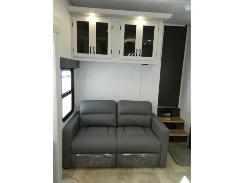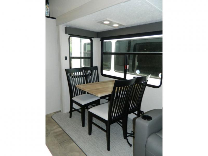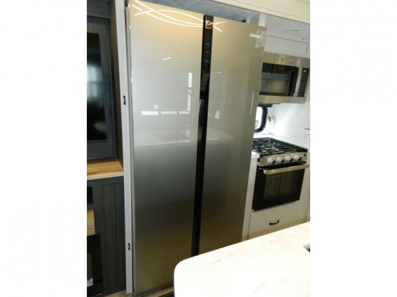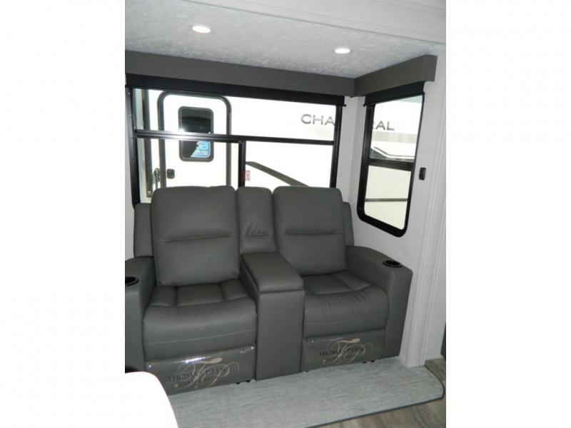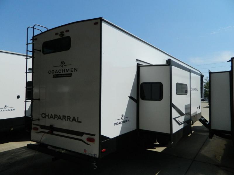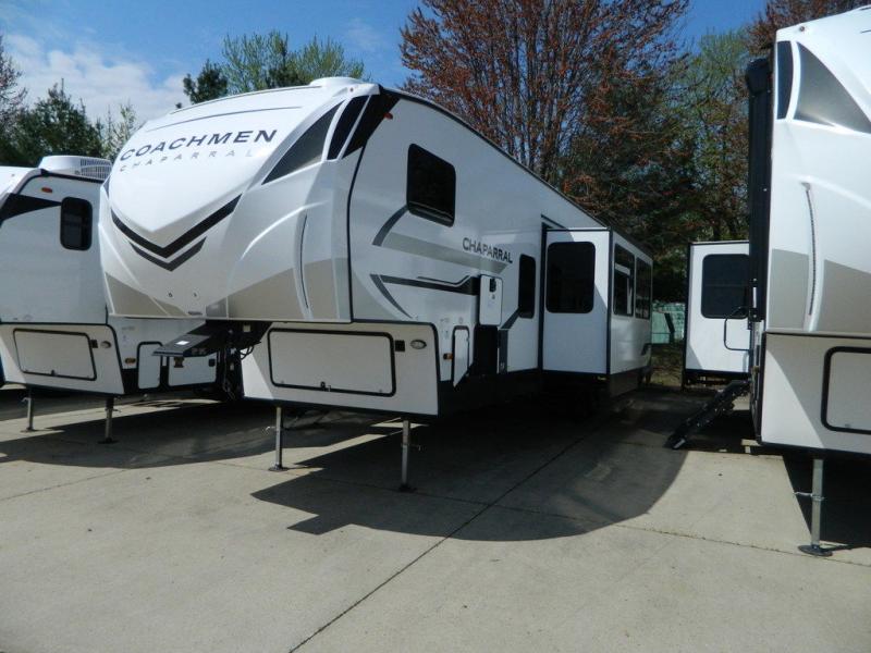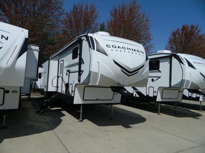 Each Chaparral mid-profile fifth wheel by Coachmen is designed with residential features, loads of storage space, and roomy bedroom suites to make you feel right at home. The durable construction means you can enjoy your RV for years to come. There's 6X double Azdel aluminum cage sidewall system, Weather Shield+ technology, and Tri-Tex powder coated frame technology that will help extend your camping season. Each model includes a Winegard Air 360+ HDTV/radio dome antenna to help keep you connected as you camp, slow rise blackout roller night shades, a new 16 cu. ft. side-by-side stainless glass 12V refrigerator, and a modern electric fireplace to make your space cozy. There is also a large transom window in the kitchen, a modern high-rise faucet, LED motion sensor lights in the bathroom, plus a full-size shower with glass doors and a seat. Now that's what I call luxury! Choose a Chaparral fifth wheel today!