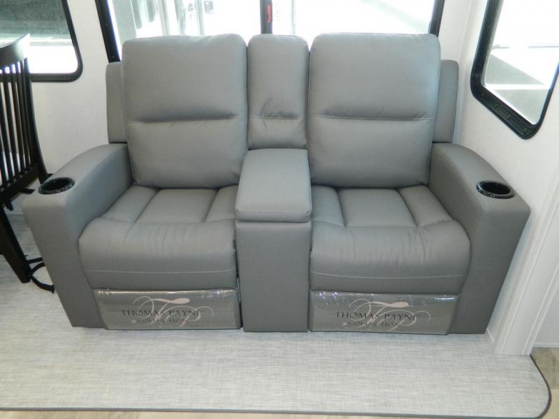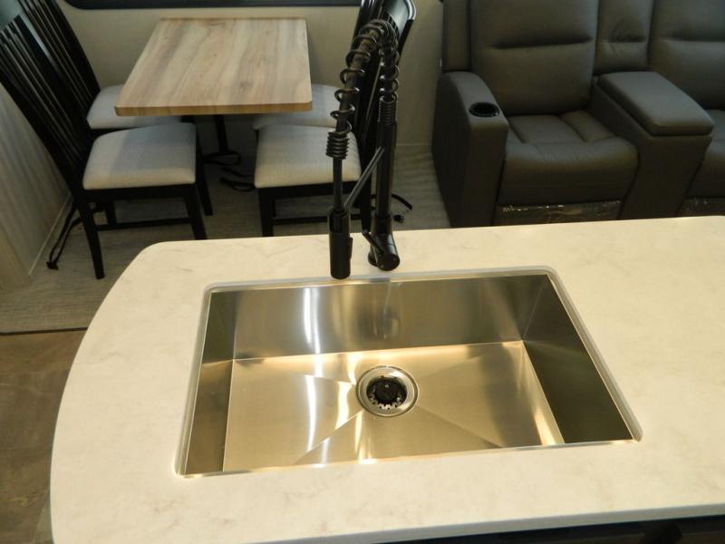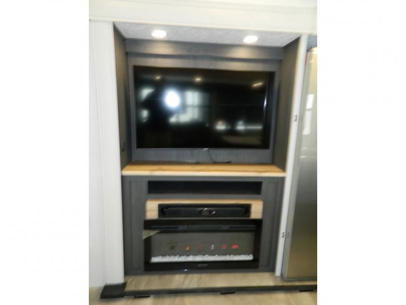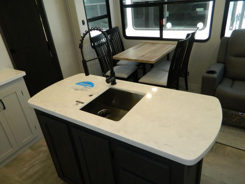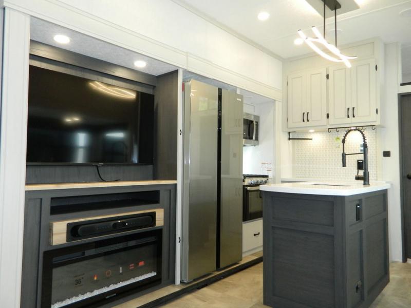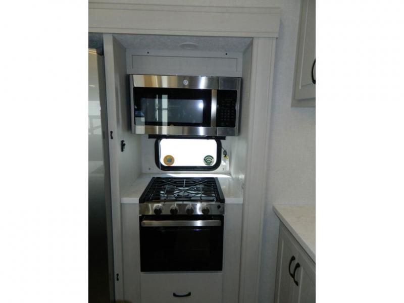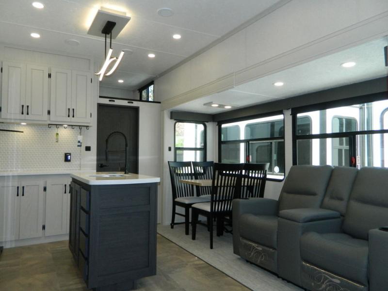 One look at this fifth wheel and you'll be sold! There are an impressive two master suites; one up front with a queen bed and full bath, and one towards the back with a king bed slide and second full bath! There are even dual bath sinks in the rear bath for added convenience! The middle living area includes dual opposing slides, a tri-fold sofa, plus theater seating and a free-spanning table for ample seating, dining, and sleeping space. There is also an entertainment center with a 50" 4K Smart LED TV to wash away those rainy day blues. The chef of your crew will have a GE Profile 21" stainless steel oven with a residential cooktop and a GE Profile stainless residential microwave to cook meals each day, a kitchen island for more counter space, and a 16 cu. ft. side-by-side 12V refrigerator for food storage.