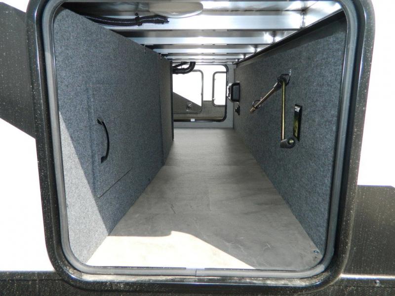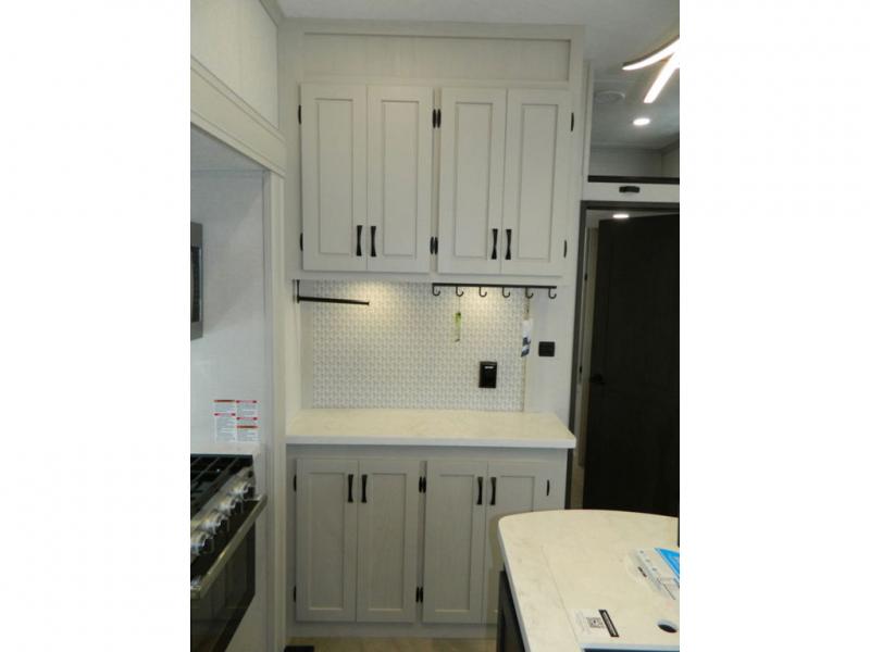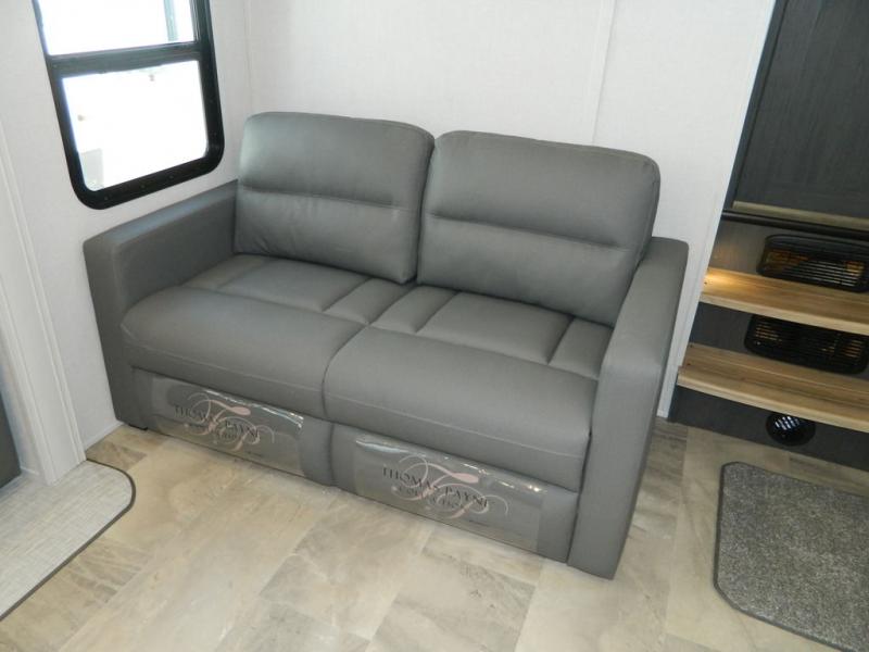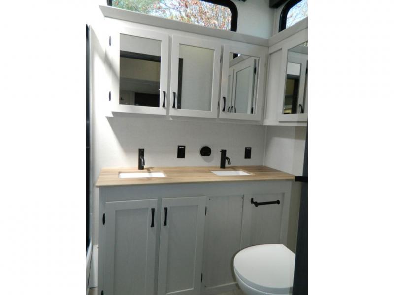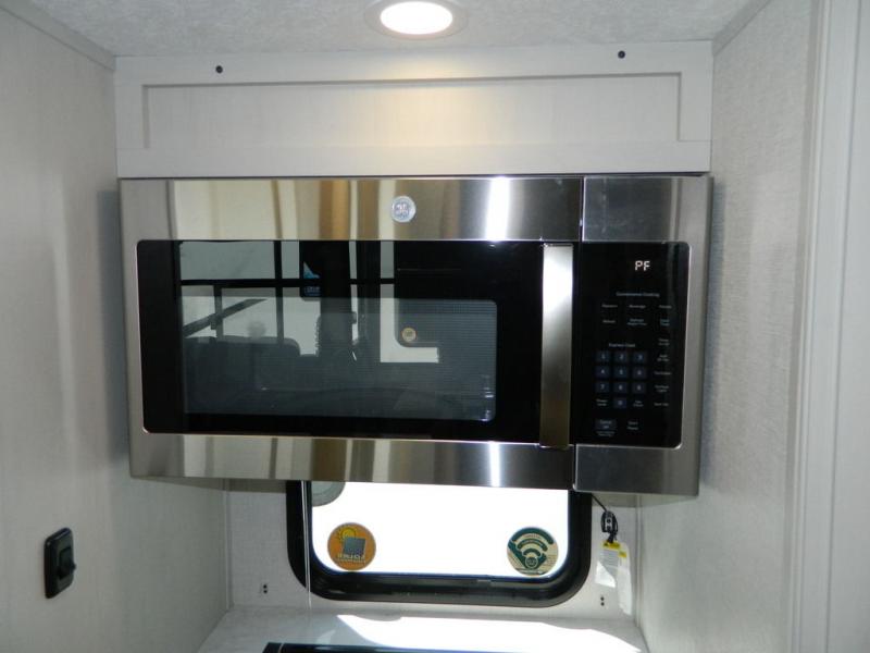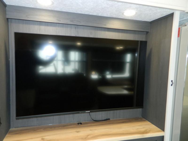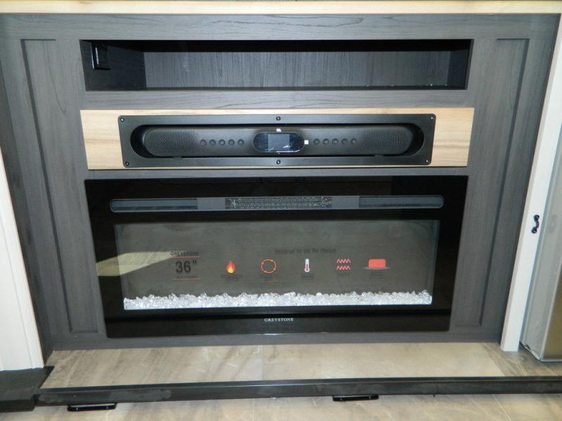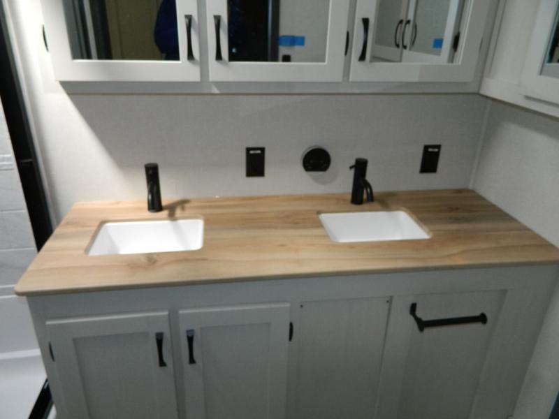 One look at this fifth wheel and you'll be sold! There are an impressive two master suites; one up front with a queen bed and full bath, and one towards the back with a king bed slide and second full bath! There are even dual bath sinks in the rear bath for added convenience! The middle living area includes dual opposing slides, a tri-fold sofa, plus theater seating and a free-spanning table for ample seating, dining, and sleeping space. There is also an entertainment center with a 50" 4K Smart LED TV to wash away those rainy day blues. The chef of your crew will have a GE Profile 21" stainless steel oven with a residential cooktop and a GE Profile stainless residential microwave to cook meals each day, a kitchen island for more counter space, and a 16 cu. ft. side-by-side 12V refrigerator for food storage.