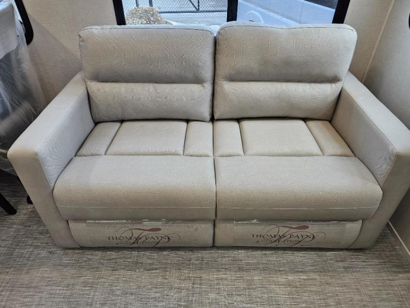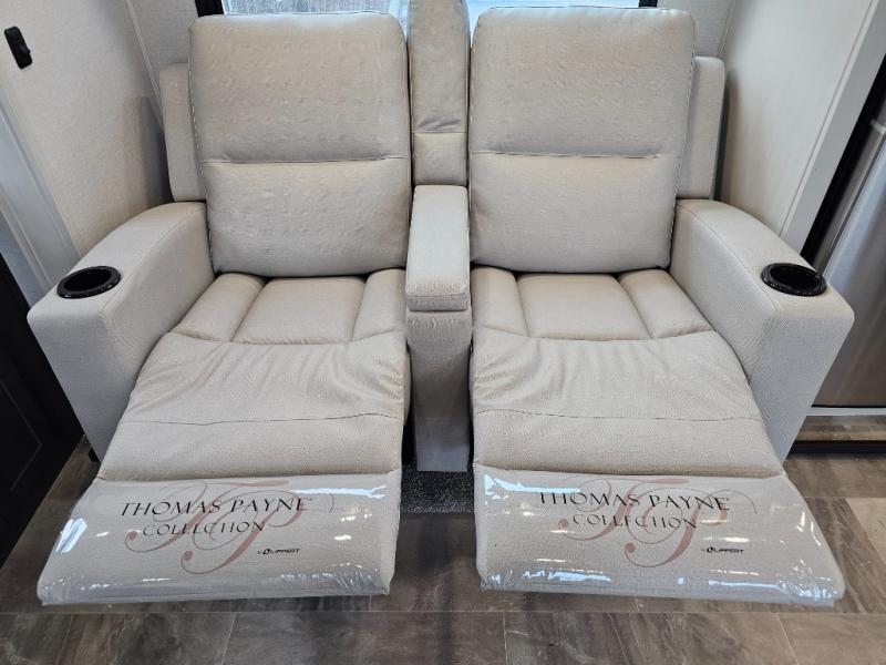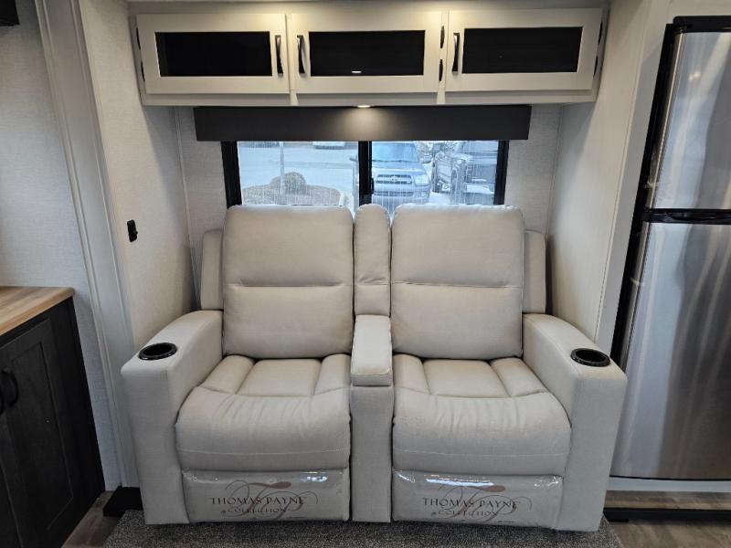 Spacious rear living room with theater seating, tri-fold sofa, and entertainment center