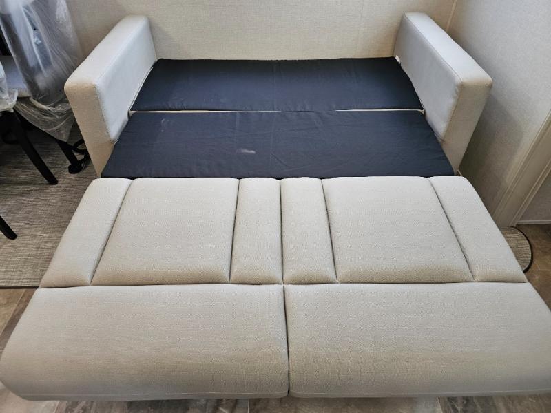 Rear living area with tri-fold hide-a-bed sofa for guests