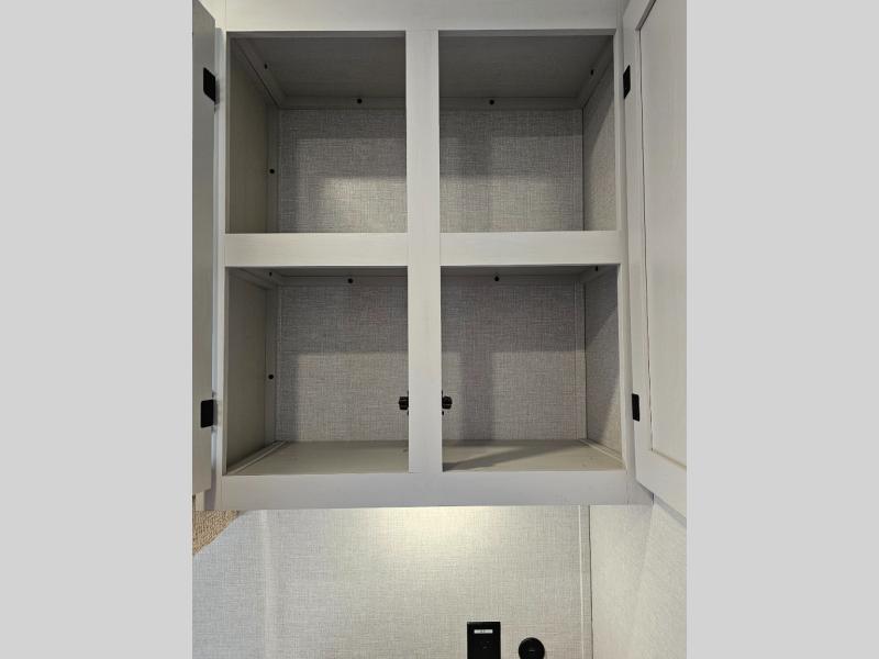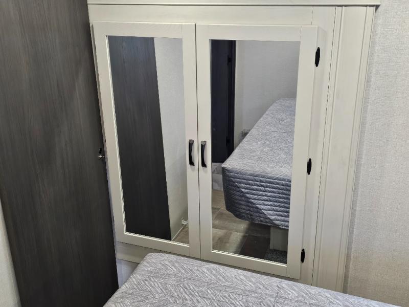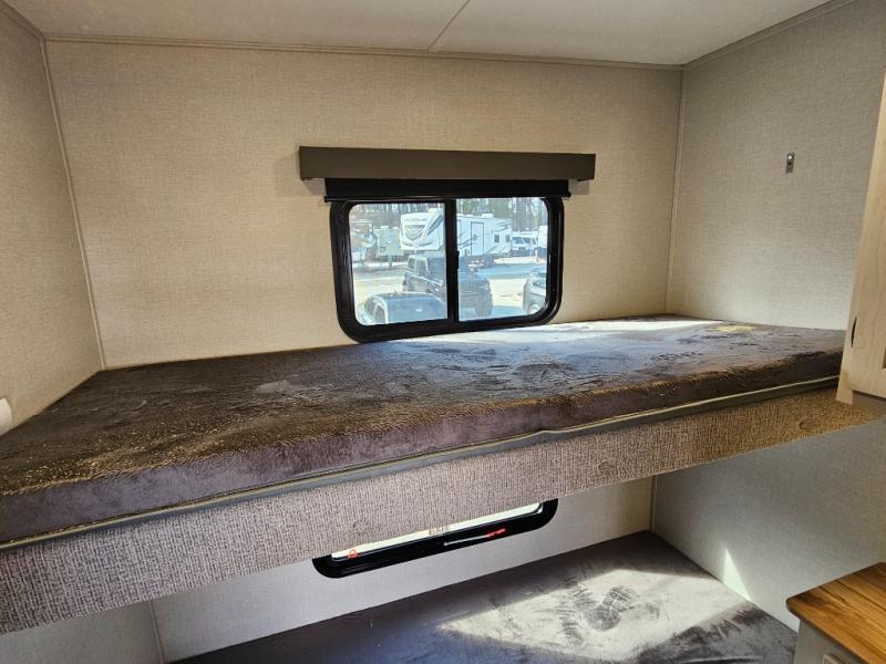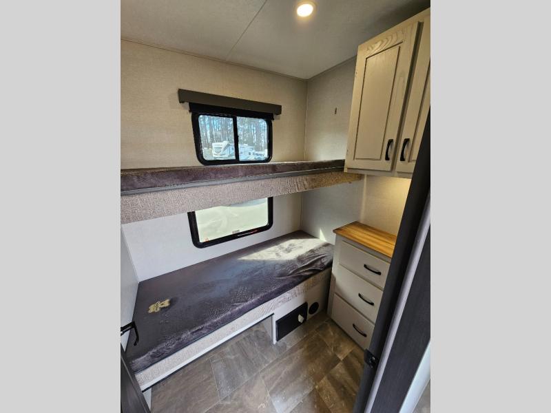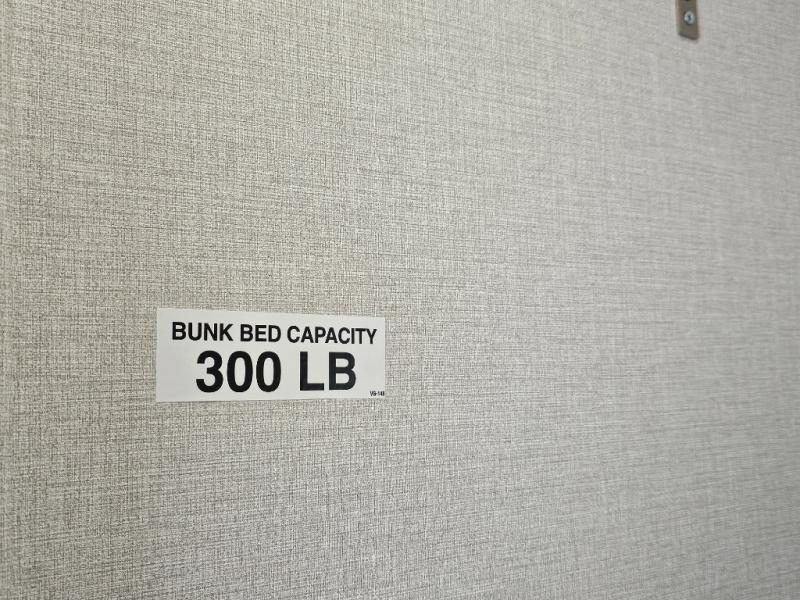 Middle bunkhouse with 30" x 74" bunk bed, flip-up bunk, overhead storage, and shoe storage