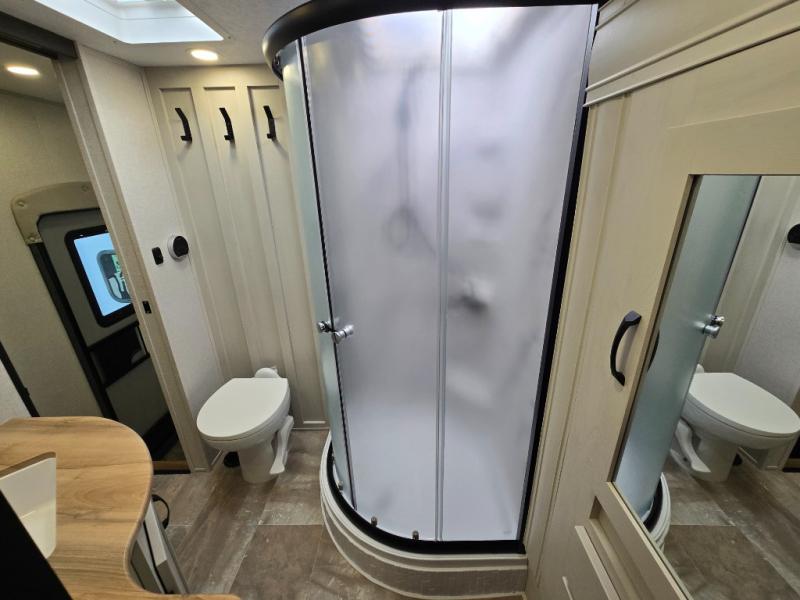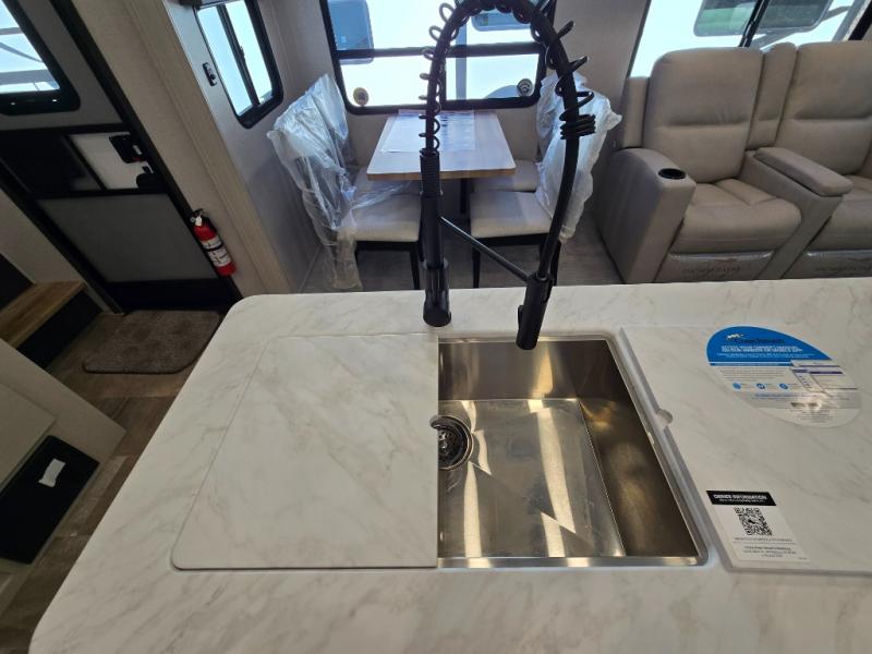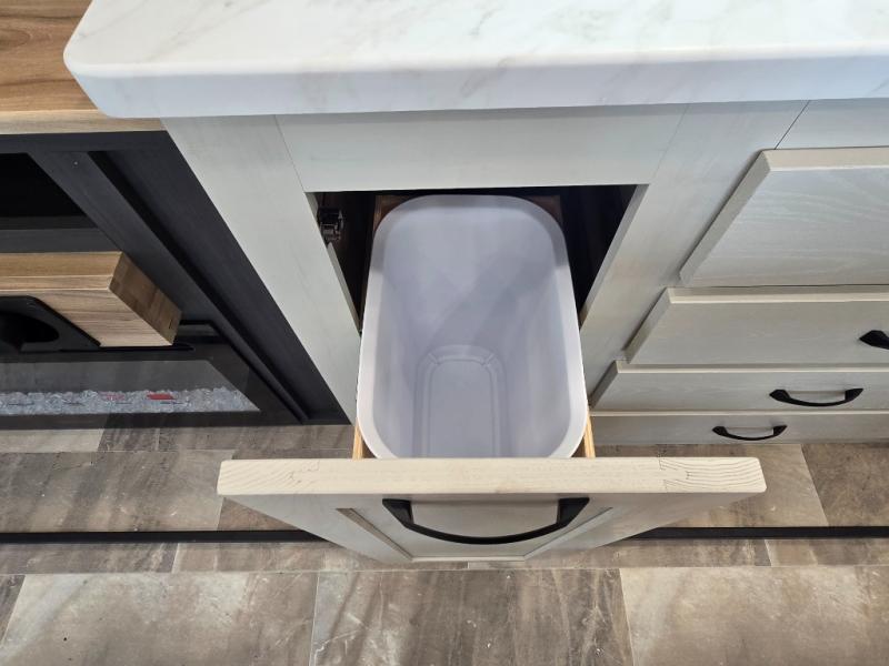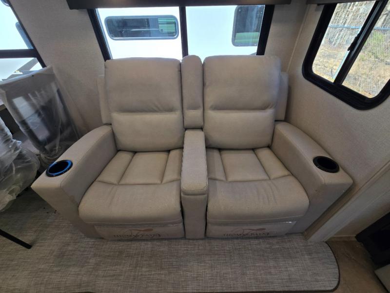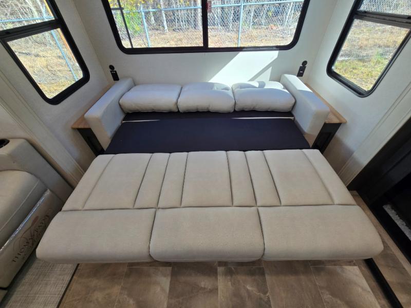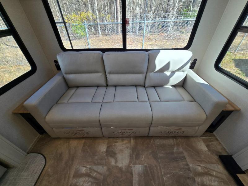 - Rear Living Area: A spacious, inviting area perfect for relaxing after a day of adventure. It offers a 78" tri-fold hide-a-bed sofa and theater seating, all positioned across from the entertainment center for optimal viewing.