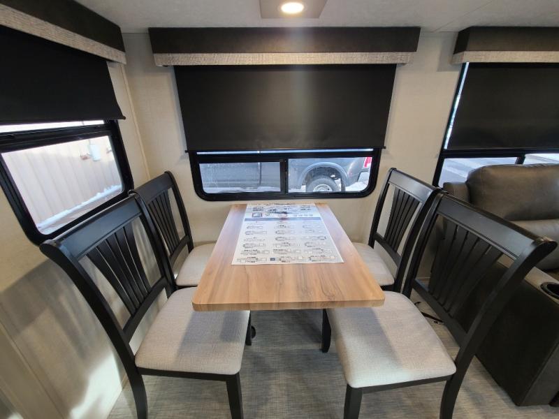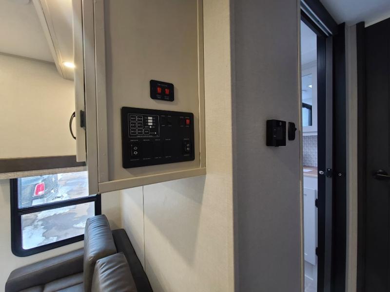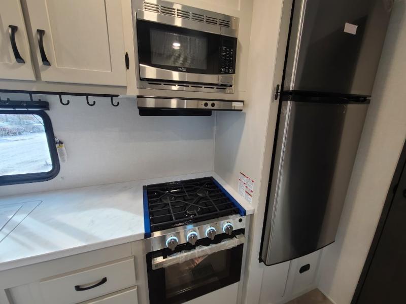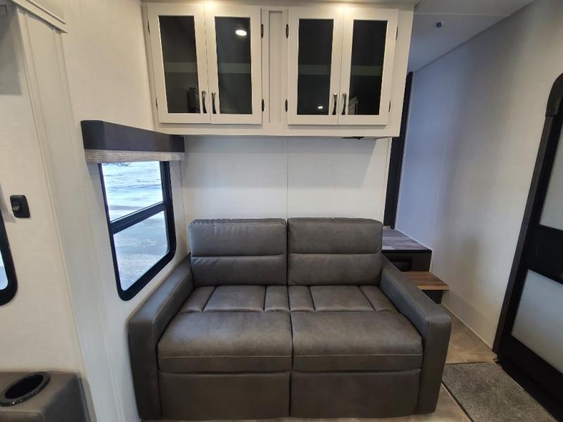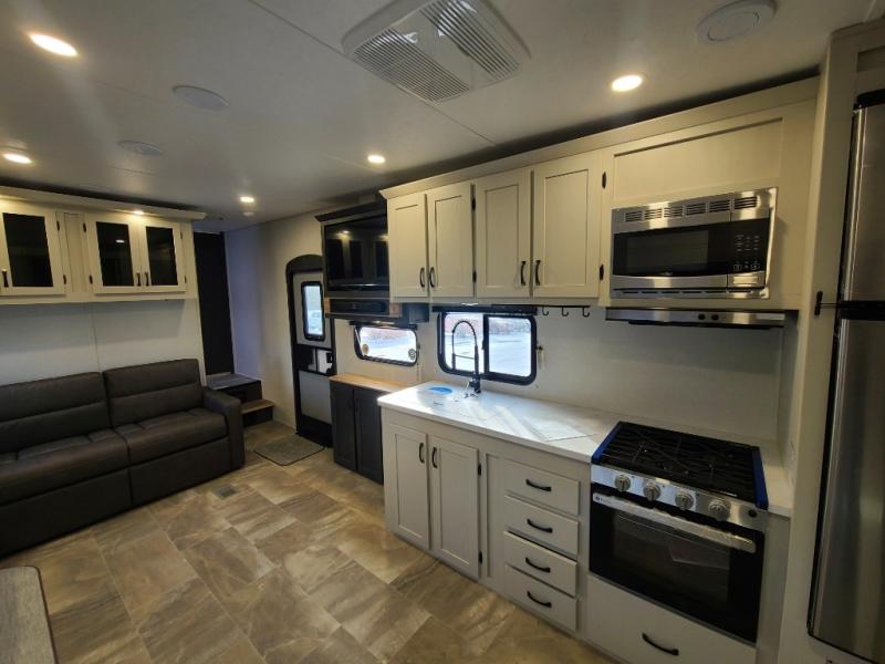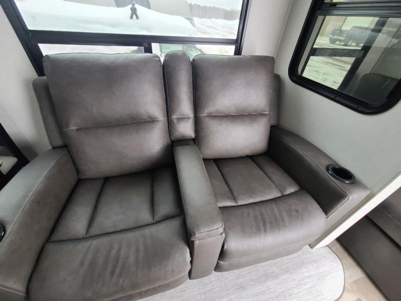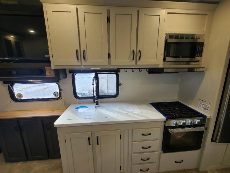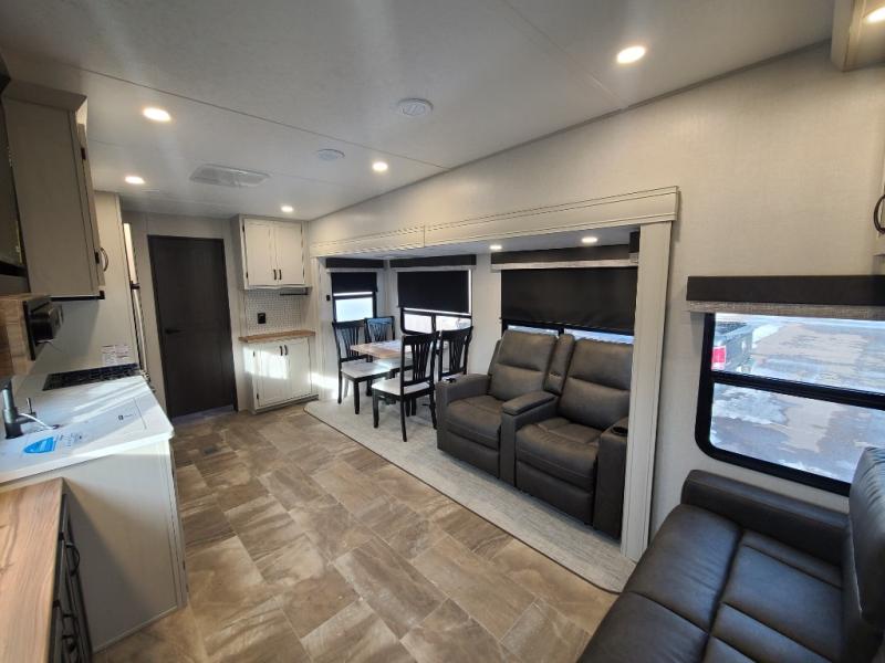 This fifth wheel is big enough for the whole gang! The kiddos will love having their own private bunkhouse which has 30" x 74" bunks and its very own full bathroom complete with a wardrobe. Enjoy your own privacy with the front private bedroom with a queen bed, dual nightstands, plus roller night shades for privacy. You can even transform the tri-fold hide-a-bed sofa into an extra sleeping space and the free-spanning table offers a comfortable place to play card games. The chef can either prepare their delicious meals indoors with the GE Profile 21" stainless steel oven with a residential cooktop or breathe in some fresh air while cooking at the outside kitchen while staying protected by the 18' electric awning!