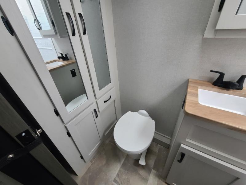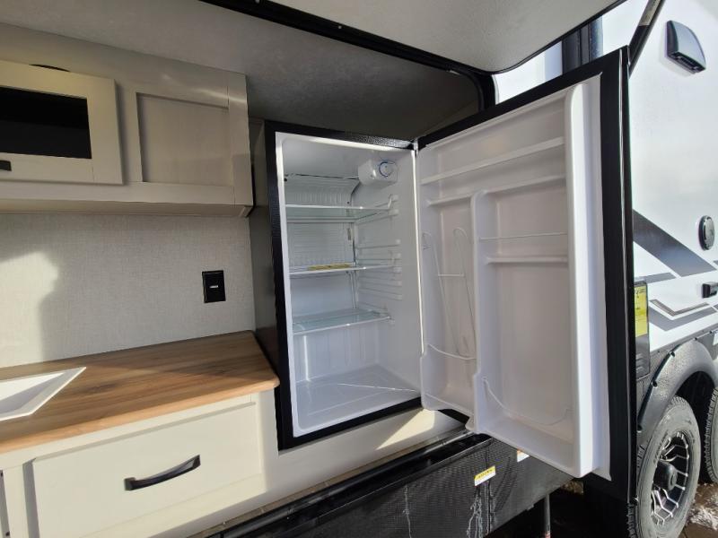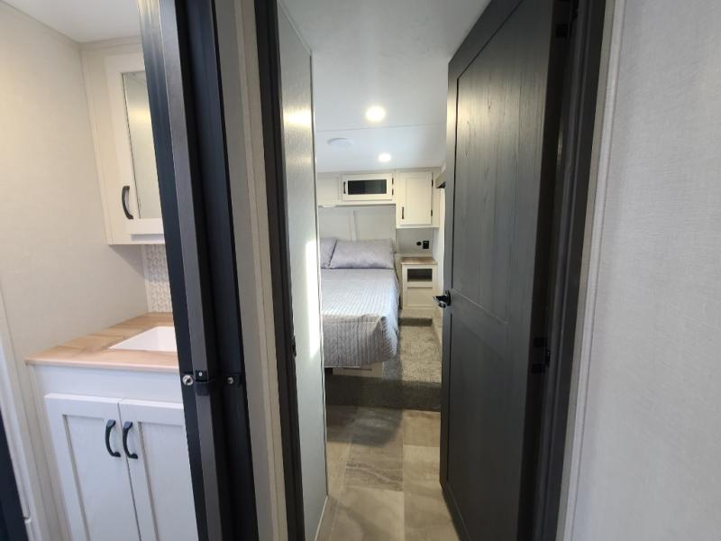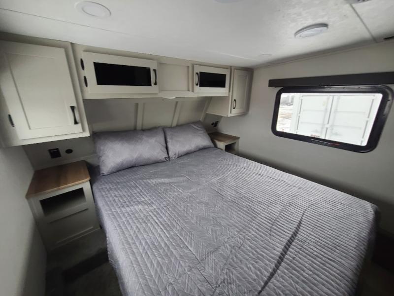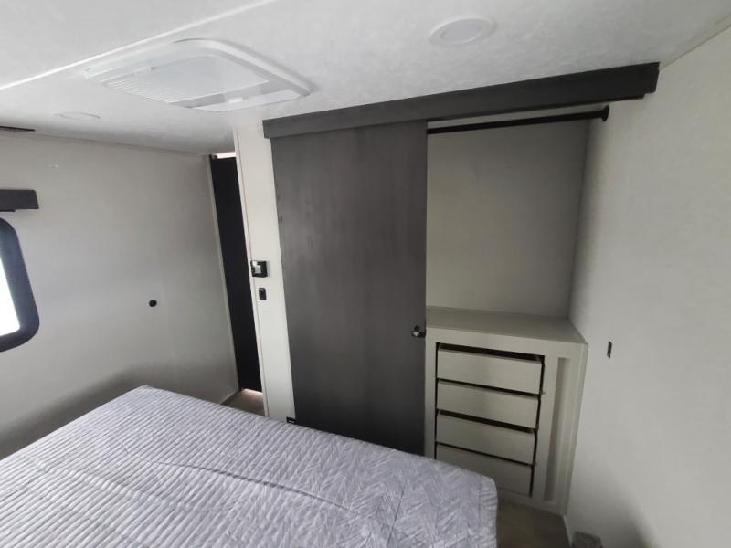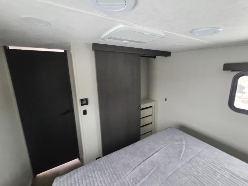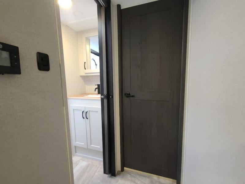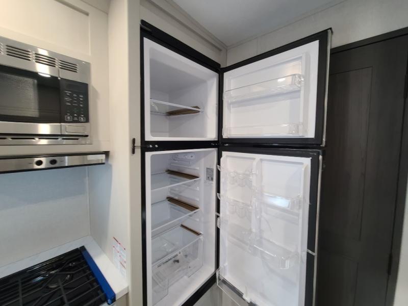 This fifth wheel is big enough for the whole gang! The kiddos will love having their own private bunkhouse which has 30" x 74" bunks and its very own full bathroom complete with a wardrobe. Enjoy your own privacy with the front private bedroom with a queen bed, dual nightstands, plus roller night shades for privacy. You can even transform the tri-fold hide-a-bed sofa into an extra sleeping space and the free-spanning table offers a comfortable place to play card games. The chef can either prepare their delicious meals indoors with the GE Profile 21" stainless steel oven with a residential cooktop or breathe in some fresh air while cooking at the outside kitchen while staying protected by the 18' electric awning!