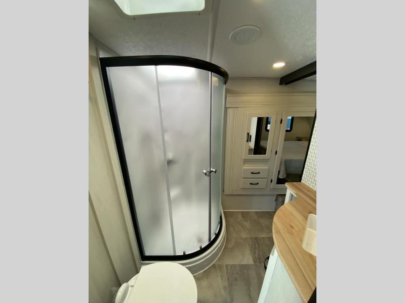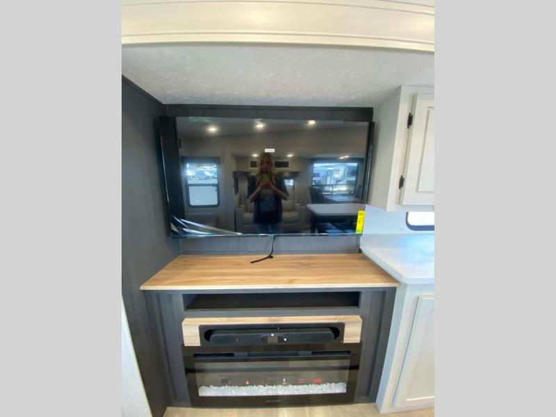 Get ready for a luxurious getaway in this fifth wheel! The rear living area is the perfect place to wind down your nights by relaxing on either the 78" tri-fold hide-a-bed sofa or the theater seating across from the entertainment center. You could even play a few card games at the free-spanning table while enjoying snacks that were stored in the pantry. The kitchen island comes with two bar stools so you can have two helpers get dinner ready while you're cooking on the three burner cooktop. The dual entry bathroom is easy for everyone to access and has a radius shower with glass doors to freshen up in, plus it leads directly into the front master suite where you will find a queen bed to lay your head on at night and a wardrobe/linen slide to keep your clothes looking their best!