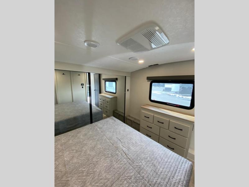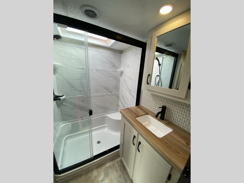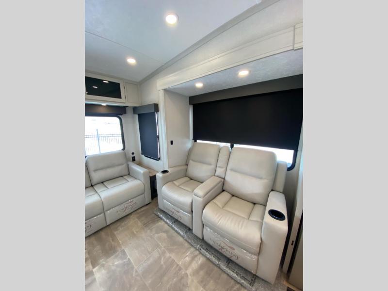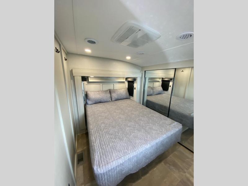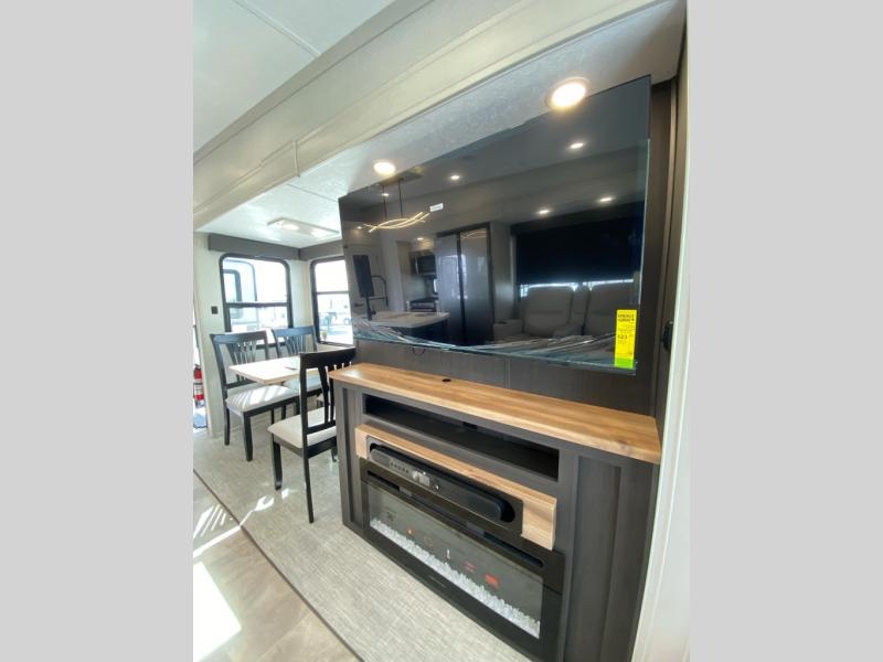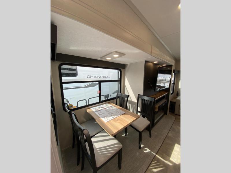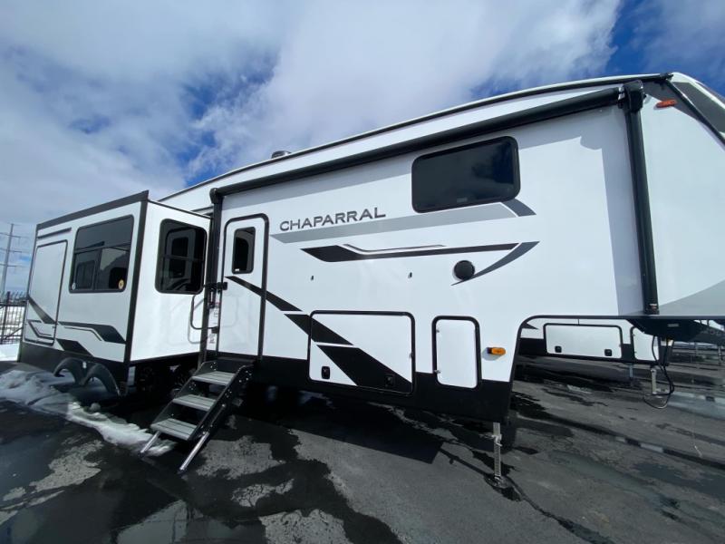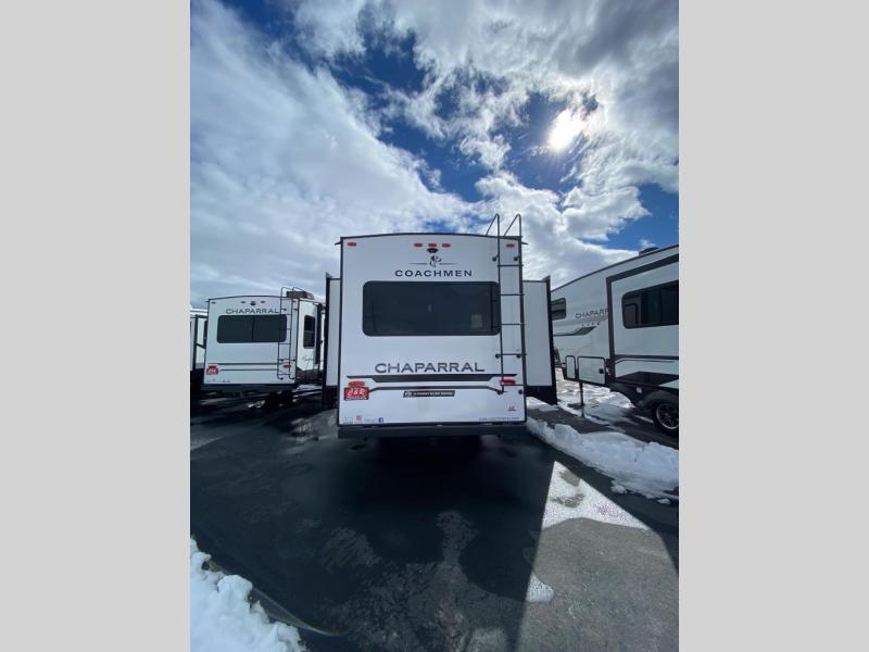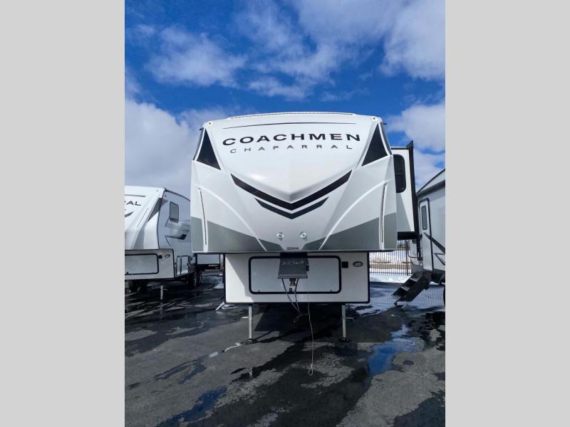 Each Chaparral mid-profile fifth wheel by Coachmen is designed with residential features, loads of storage space, and roomy bedroom suites to make you feel right at home. The durable construction means you can enjoy your RV for years to come. There's 6X double Azdel aluminum cage sidewall system, Weather Shield+ technology, and Tri-Tex powder coated frame technology that will allow you to camp year around. Each model includes a Winegard Air 360+ HDTV/radio dome antenna to help keep you connected as you camp, slow rise blackout roller night shades, a new 16 cu. ft. side-by-side stainless glass 12V refrigerator, and a modern electric fireplace to make your space cozy. There is also a large transom window in the kitchen, a modern high-rise faucet, LED motion sensor lights in the bathroom, plus a full-size shower with glass doors and a seat. Now that's what I call luxury! Choose a Chaparral fifth wheel today!