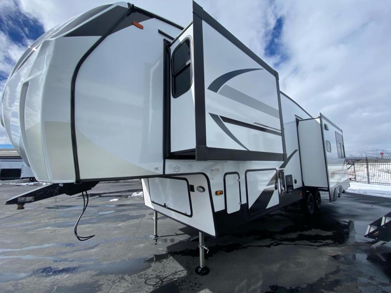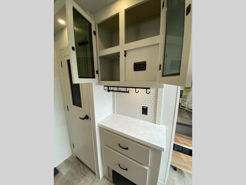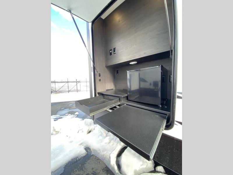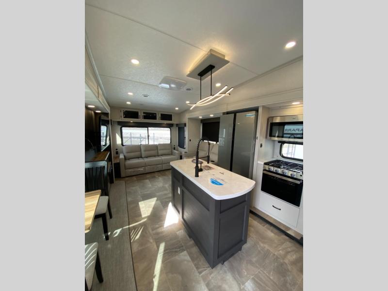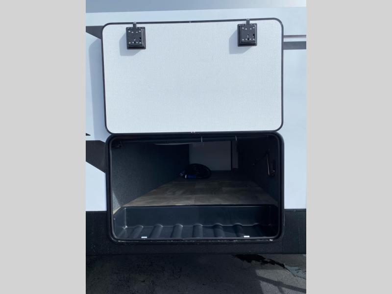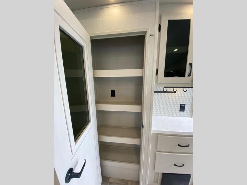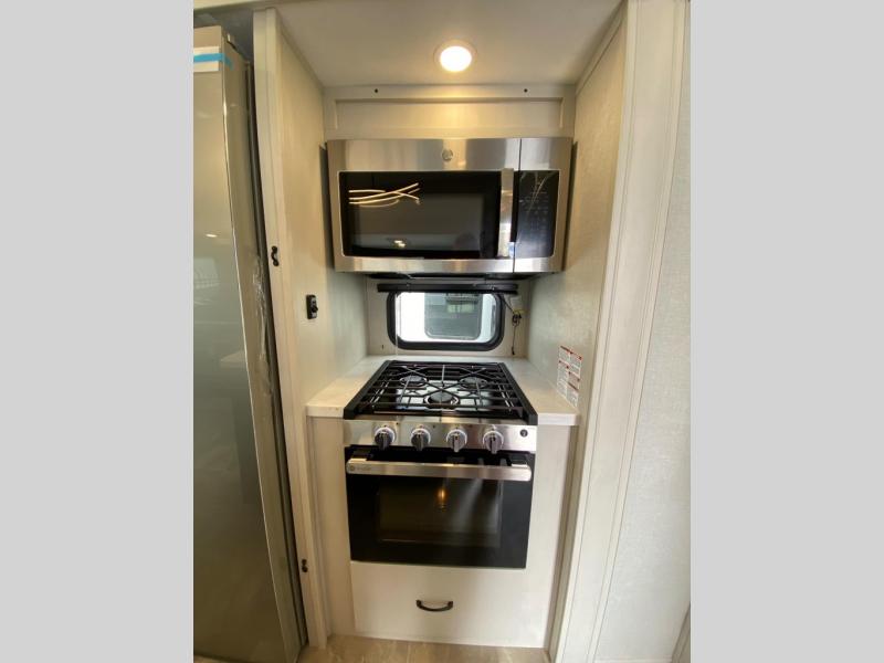 This lightest fifth wheel in the Chaparral line-up will provide hassle-free towing and camping. You will find dual opposing slides in the main living area for tons of space to stretch out, plus a kitchen island that will make this area feel more like home. There is theatre seating across from the entertainment center, and you can enjoy the 50" 4K Smart LED TV for movies. The fully-equipped kitchen includes a GE Profile stainless steel 30" residential microwave, a GE Profile 21" oven with a residential cooktop, and a overhead storage to keep kitchen necessities close by. And don't overlook the front private bedroom with a queen bed, dresser, plus a large wardrobe with washer and dryer prep!