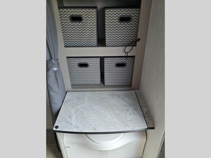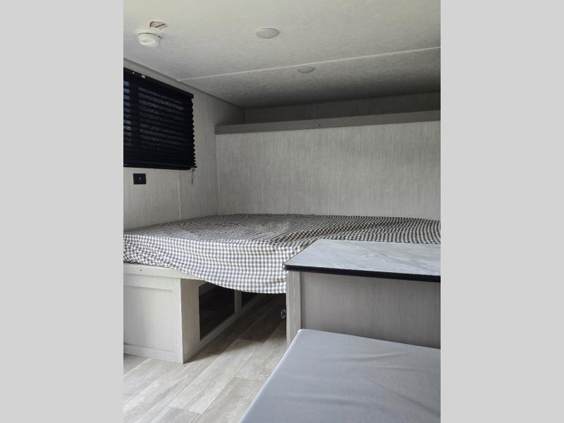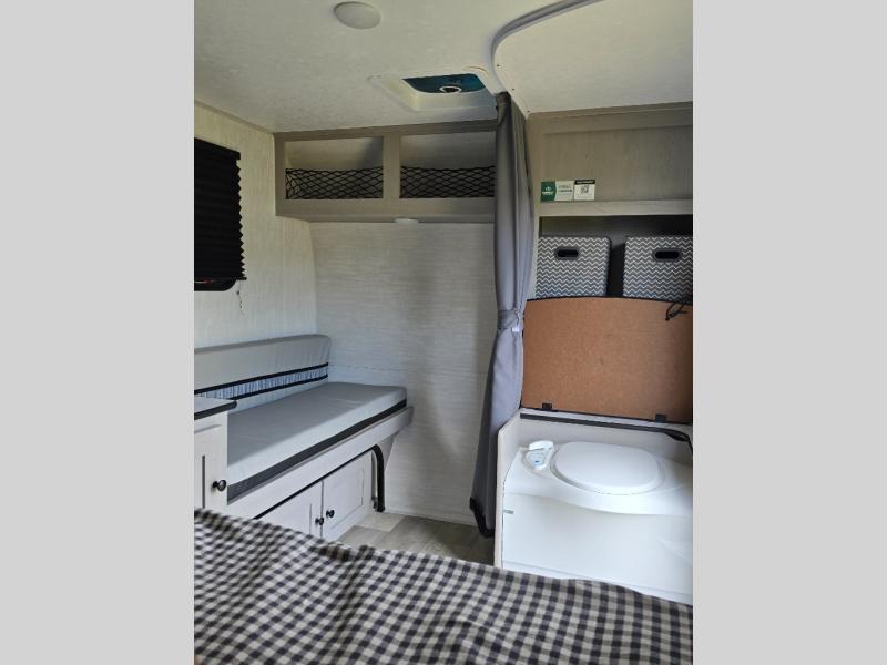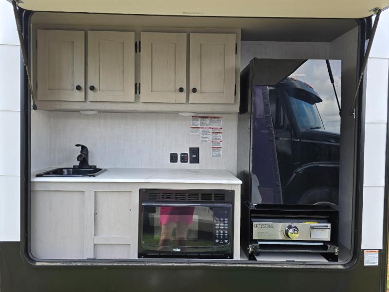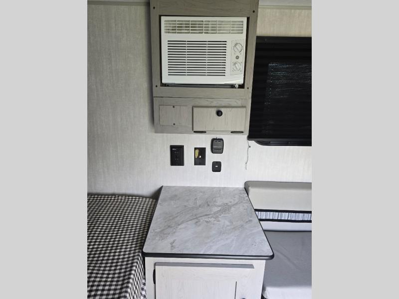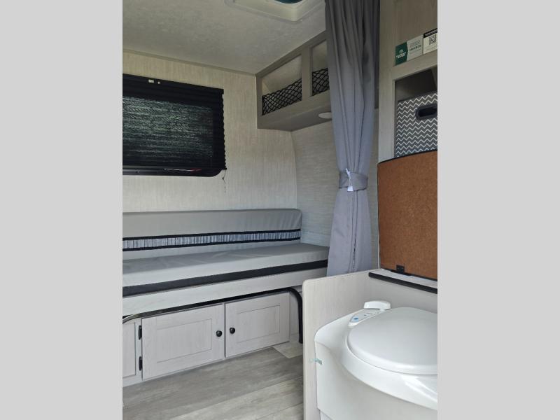 When you want to explore choose this travel trailer for your basic off-road adventure needs and a bit more by offering you a 54" X 74" flip-up bed with storage beneath, and gaucho seating that pulls out into a bed for an additional camper at night. There is front and rear overhead cabinetry for storage, and a cassette toilet for added convenience especially at night. A rear hatch camp kitchen provides a place for you to create meals and snacks while you explore. There is a slide-out griddle and grill combo cooktop, a 3.3 cu. ft. 12-volt refrigerator for your cold items, a single sink, and two burner cooktop, plus a microwave oven. A 9' power awning creates a bit of added outdoor living space where you can set up your camp chairs. You can also add an optional roof-top tent for additional sleeping.