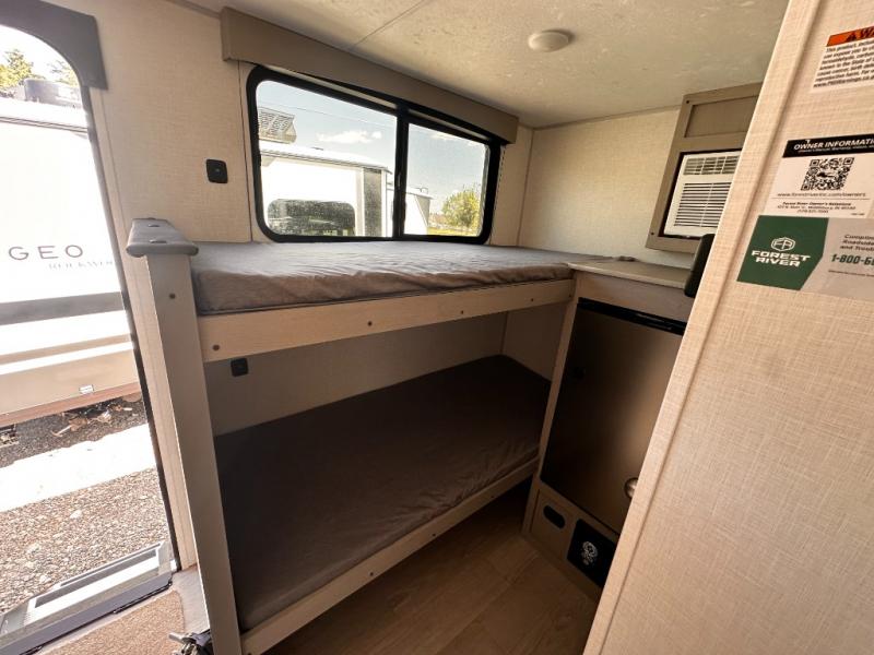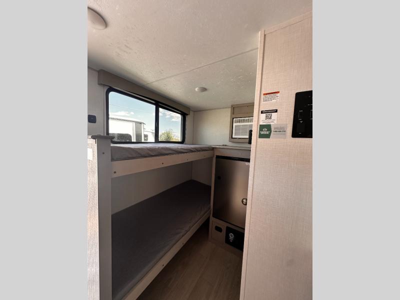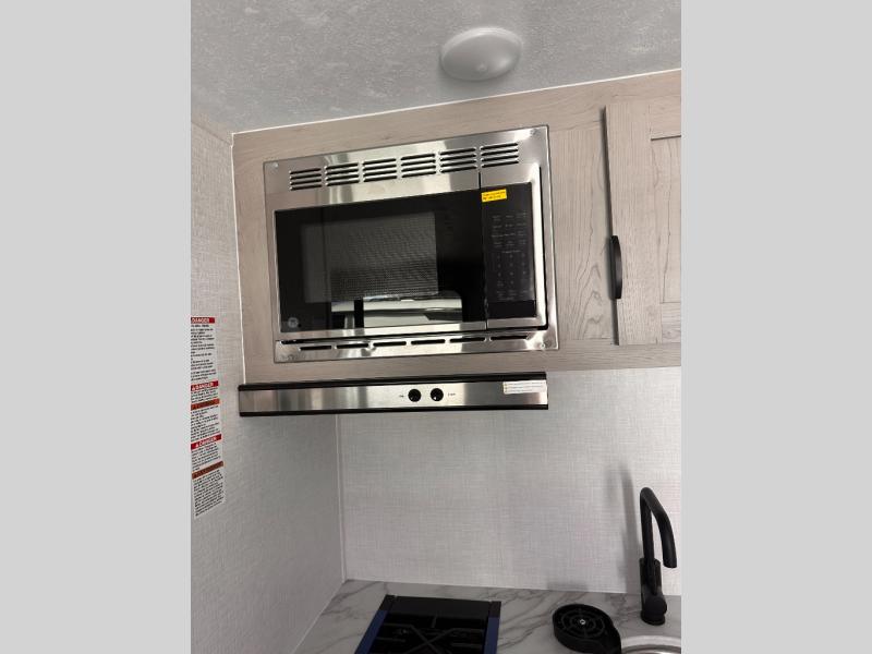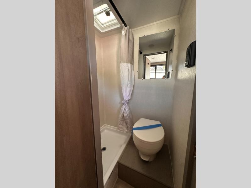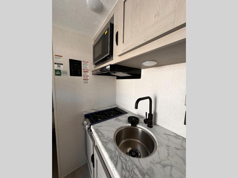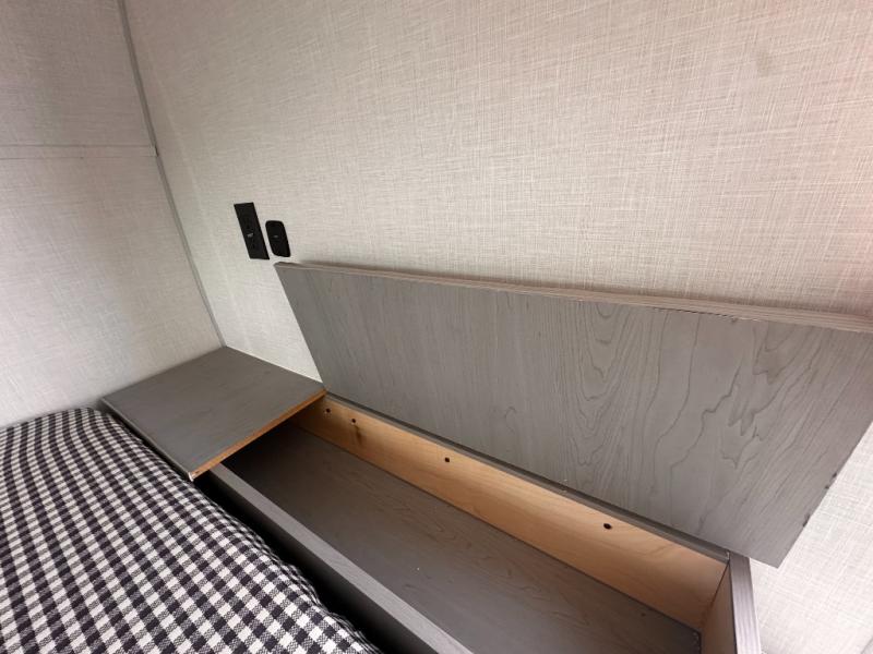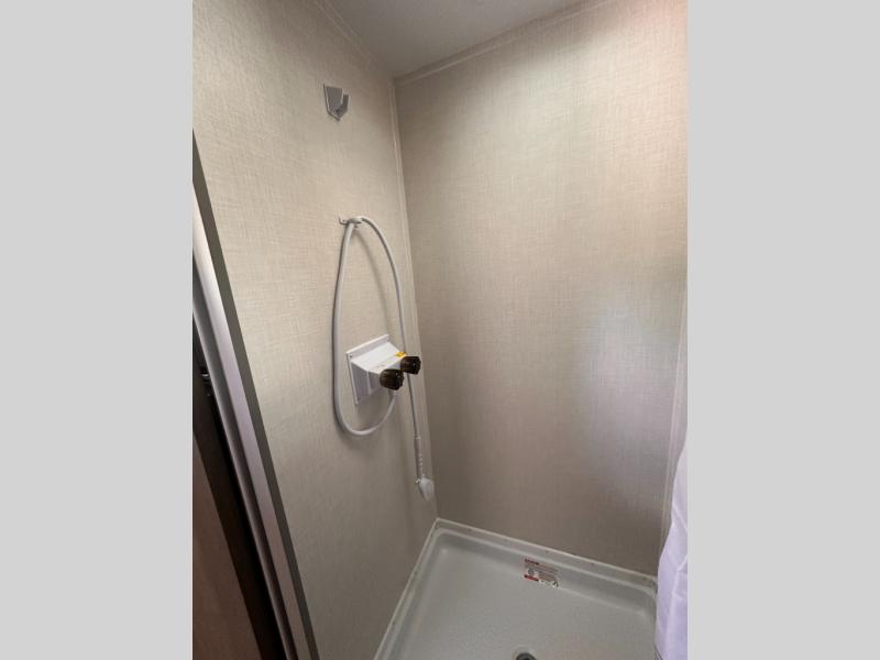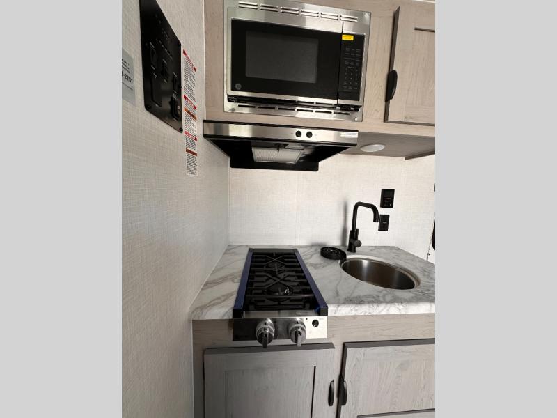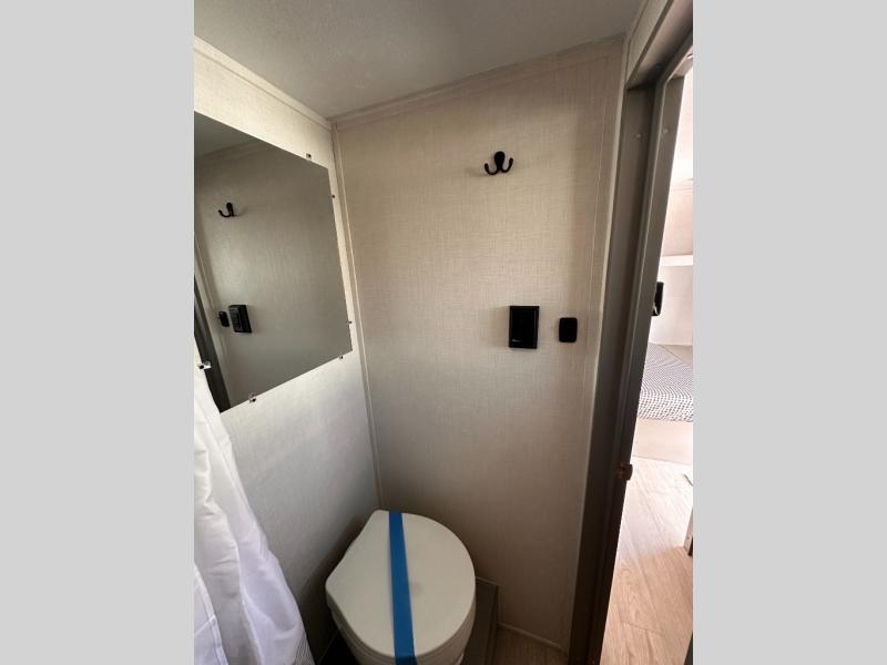 Inside, you'll find a well-equipped kitchen with a GE appliance package, seamless countertops, and thoughtful touches like a sink cup rinser and overhead storage. The bathroom features a 24" x 40" shower, power vent fan, and a foot-flush toilet, offering home-like comfort on the go.