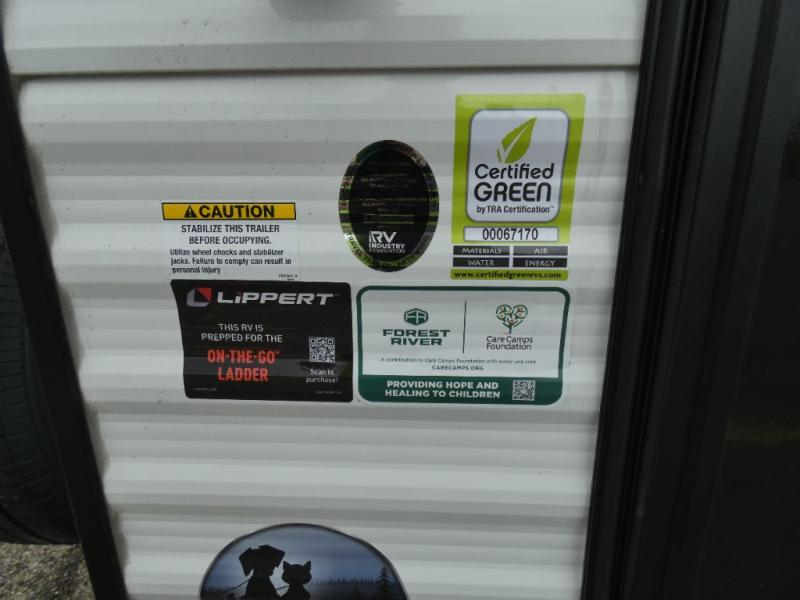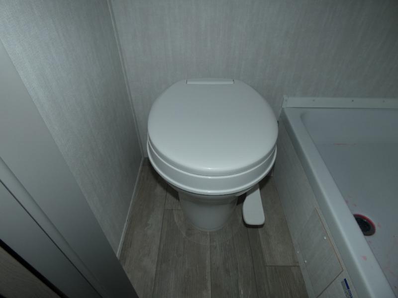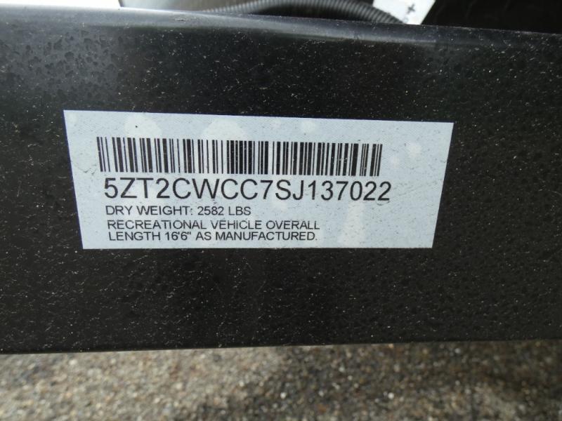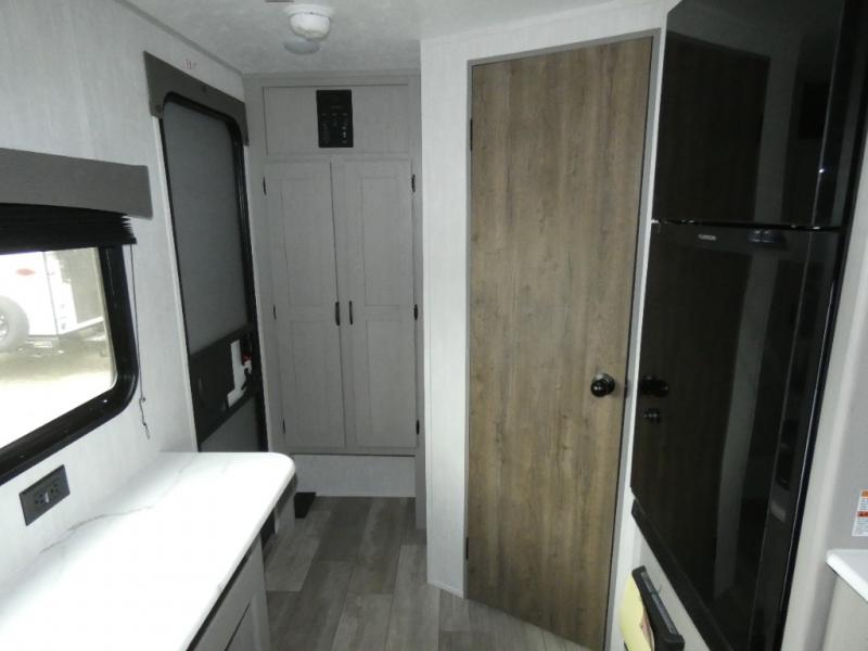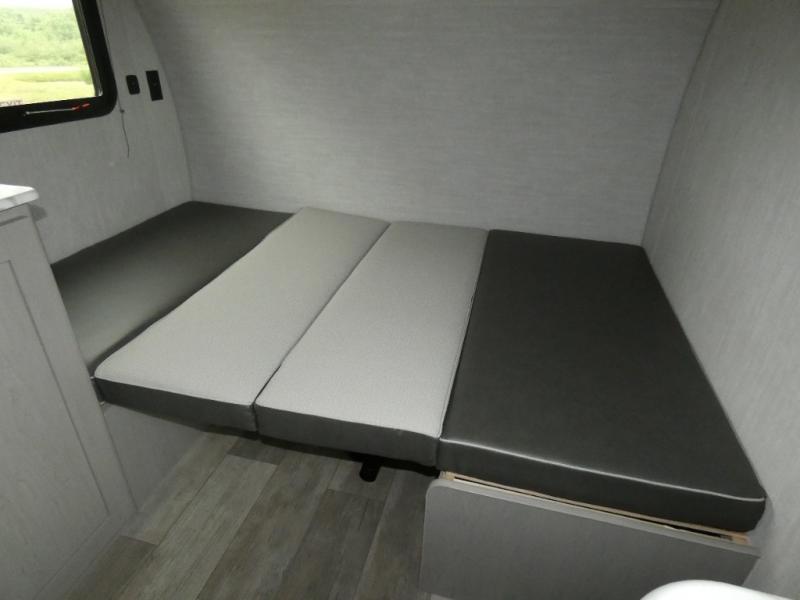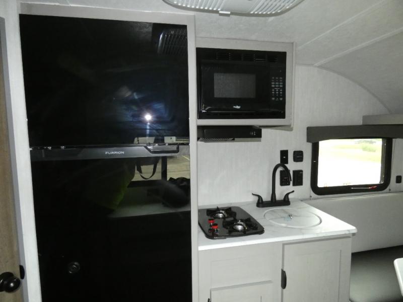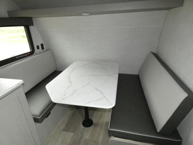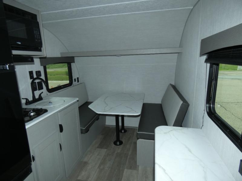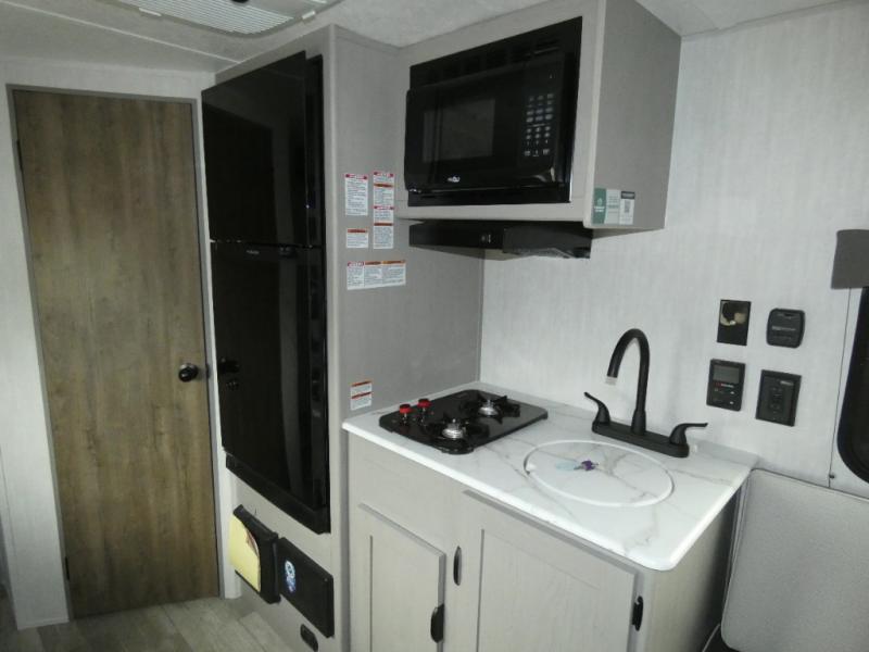 Tired of tent camping and sleeping on the ground? This lightweight travel trailer can accommodate you nicely with a dry and comfortable place to stay while enjoying nature. Inside, you will find a booth dinette for plenty of space to sit and stretch your legs, or enjoy a meal. The booth dinette easily converts to sleeping space at night. You might also enjoy your morning breakfast or coffee at the bar top with two stools. A 24" x 36" shower and toilet provide a convenience to your camping trips, no late nights running to the campground bathroom in the dark. And, the kitchen features a two burner cooktop and refrigerator so you can cook inside when you'd rather not deal with campfire smoke over an open fire. There is also plenty of storage for your things between the overhead cabinets and shelves, wardrobe/pantry near the door, and within exterior storage as well.